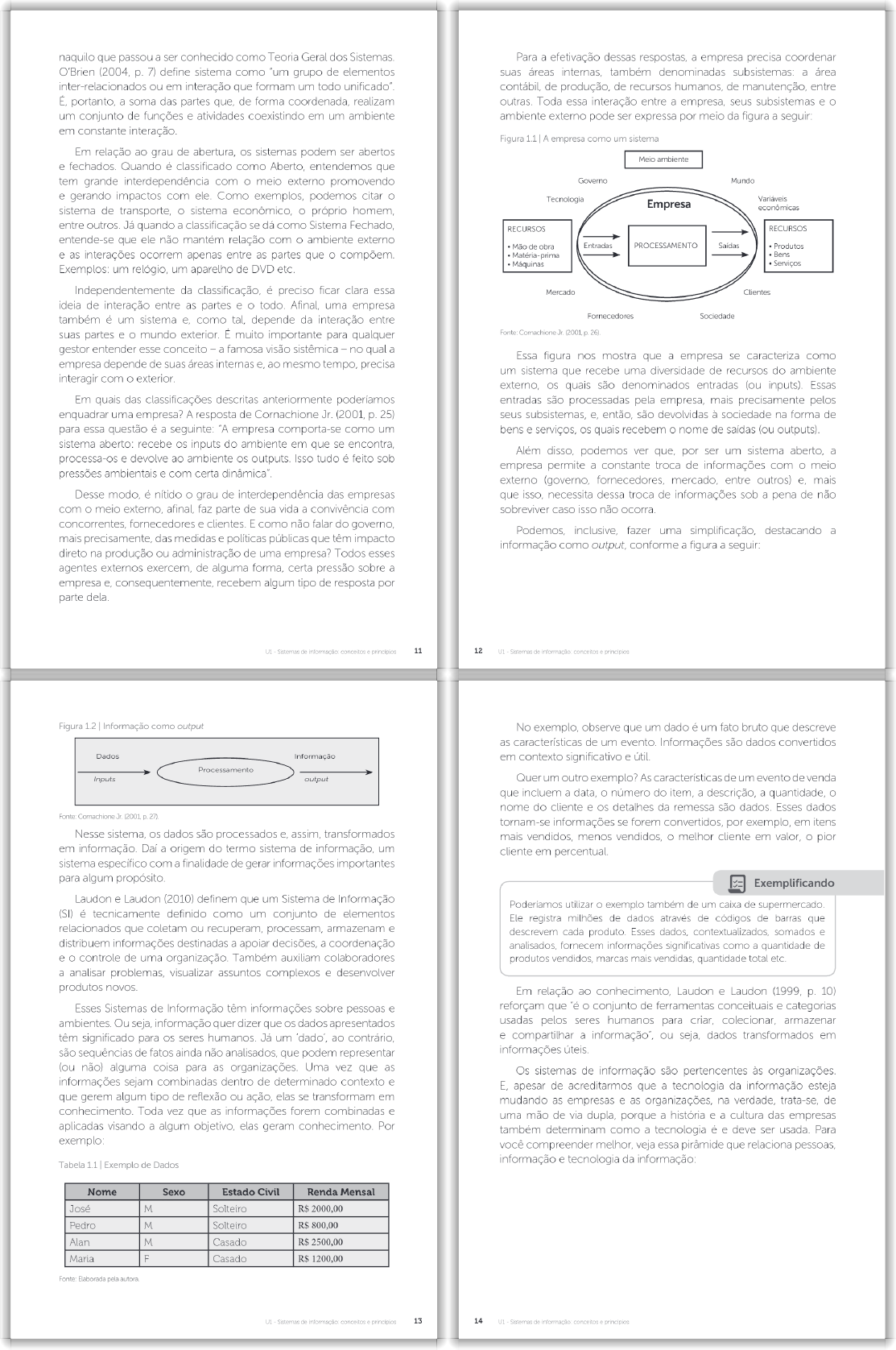 <p>naquilo que passou a ser conhecido como Teoria Geral dos Para a efetivação dessas respostas, a empresa precisa coordenar O'Brien p. 7) define sistema como "um grupo de elementos suas áreas internas, também denominadas a área inter-relacionados ou em interação que formam um todo contábil, de produção, de recursos de manutenção, entre portanto, a soma das partes que, de forma coordenada, realizam outras. Toda essa interação entre a empresa, seus subsistemas e um conjunto de funções e atividades coexistindo em um ambiente ambiente externo pode ser expressa por meio da figura a seguir: em constante interação. Figura 1.1 A empresa como um sistema Em relação ao grau de abertura, os sistemas podem ser abertos Meio ambiente e fechados. Quando é classificado como Aberto, entendemos que tem grande interdependência com meio externo promovendo Governo Mundo e gerando impactos com ele. Como exemplos, podemos citar Tecnologia Empresa sistema de transporte, sistema econômico, próprio homem, econômicas entre outros. Já quando a classificação se dá como Sistema Fechado, RECURSOS RECURSOS entende-se que ele não mantém relação com ambiente externo Mão de obra Entradas PROCESSAMENTO Saídas Produtos e as interações ocorrem apenas entre as partes que Matéria-prima Bens Máquinas Serviços Exemplos: um relógio, um aparelho de DVD etc. Independentemente da classificação, é preciso ficar clara essa Mercado Clientes ideia de interação entre as partes e Afinal, uma empresa também é um sistema e, como tal, depende da interação entre Fornecedores Sociedade suas partes e mundo exterior. É muito importante para qualquer Fonte: Cornachione Jr. 26) gestor entender esse conceito a famosa visão sistêmica no qual a Essa figura nos mostra que a empresa se caracteriza como empresa depende de suas áreas internas e, ao mesmo tempo, precisa um sistema que recebe uma diversidade de recursos do ambiente interagir com os quais são denominados entradas (ou inputs). Essas Em quais das classificações descritas anteriormente poderíamos entradas são processadas pela empresa, mais precisamente pelos enquadrar uma empresa? A resposta de Cornachione Jr. (2001, p. 25) seus e, então, são devolvidas à sociedade na forma de para essa questão é a seguinte: "A empresa comporta-se como um bens e serviços, os quais recebem nome de saídas (ou outputs). sistema aberto: recebe os inputs do ambiente em que se encontra, Além disso, podemos ver que, por ser um sistema aberto, a processa-os e devolve ao ambiente os outputs. Isso tudo é feito sob empresa permite a constante troca de informações com meio pressões ambientais e com certa dinâmica". externo (governo, fornecedores, entre outros) mais Desse modo, é nítido grau de interdependência das empresas que isso, necessita dessa troca de informações sob a pena de não com meio externo, afinal. faz parte de sua vida a convivência com sobreviver caso isso não ocorra. concorrentes, fornecedores e clientes. E como não falar do governo, Podemos, inclusive, fazer uma simplificação, destacando a mais precisamente, das medidas e políticas públicas que têm impacto informação como output, conforme a figura a seguir: direto na produção ou administração de uma empresa? Todos esses agentes externos de alguma forma, certa pressão sobre a empresa e, consequentemente recebem algum tipo de resposta por parte U1 Sistemas de informação conceitos principios 11 12 U1 Sistemas de informação conceitos Figura 1.2 Informação como output No exemplo, observe que um dado é um fato bruto que descreve as características de um evento. Informações são dados convertidos Dados Informação em contexto significativo e Processamento Inputs output Quer um outro exemplo? As características de um evento de venda que incluem a data, número do item, a descrição, a quantidade, nome do cliente e os detalhes da remessa são Esses dados Fonte: Cornachione Jr (2001 27). tornam-se informações se forem convertidos, por exemplo, em itens Nesse os dados são processados e, assim, transformados mais vendidos, menos vendidos, melhor cliente em valor, pior em informação. a origem do termo sistema de informação, um cliente em sistema específico com a finalidade de gerar informações importantes para algum propósito. Exemplificando Laudon e Laudon (2010) definem que um Sistema de Informação Poderíamos utilizar exemplo também de um caixa de supermercado. (SI) é tecnicamente definido como um conjunto de elementos Ele registra milhões de dados através de códigos de barras que relacionados que coletam ou recuperam, processam, armazenam e descrevem cada produto. Esses dados, somados e distribuem informações destinadas a apoiar decisões, a coordenação fornecem informações significativas como a quantidade de e controle de uma organização. Também auxiliam colaboradores produtos vendidos, marcas mais vendidas, quantidade total etc. a analisar problemas, visualizar assuntos complexos e desenvolver produtos Em relação ao conhecimento, Laudon e Laudon (1999, p. 10) Esses Sistemas de Informação têm informações sobre pessoas e reforçam que "é conjunto de ferramentas conceituais e categorias ambientes. Ou seja, informação quer dizer que os dados apresentados usadas pelos seres humanos para criar, colecionar, armazenar têm significado para os seres humanos. Já um 'dado', ao contrário, e compartilhar a informação", ou seja, dados transformados em são de fatos ainda não analisados, que podem representar informações (ou não) alguma coisa para as organizações. Uma vez que as Os sistemas de informação são pertencentes às organizações. informações sejam combinadas dentro de determinado contexto e E. apesar de acreditarmos que a tecnologia da informação esteja que gerem algum tipo de reflexão ou ação, elas se transformam em mudando as empresas e as organizações, na verdade, trata-se, de Toda vez que as informa
