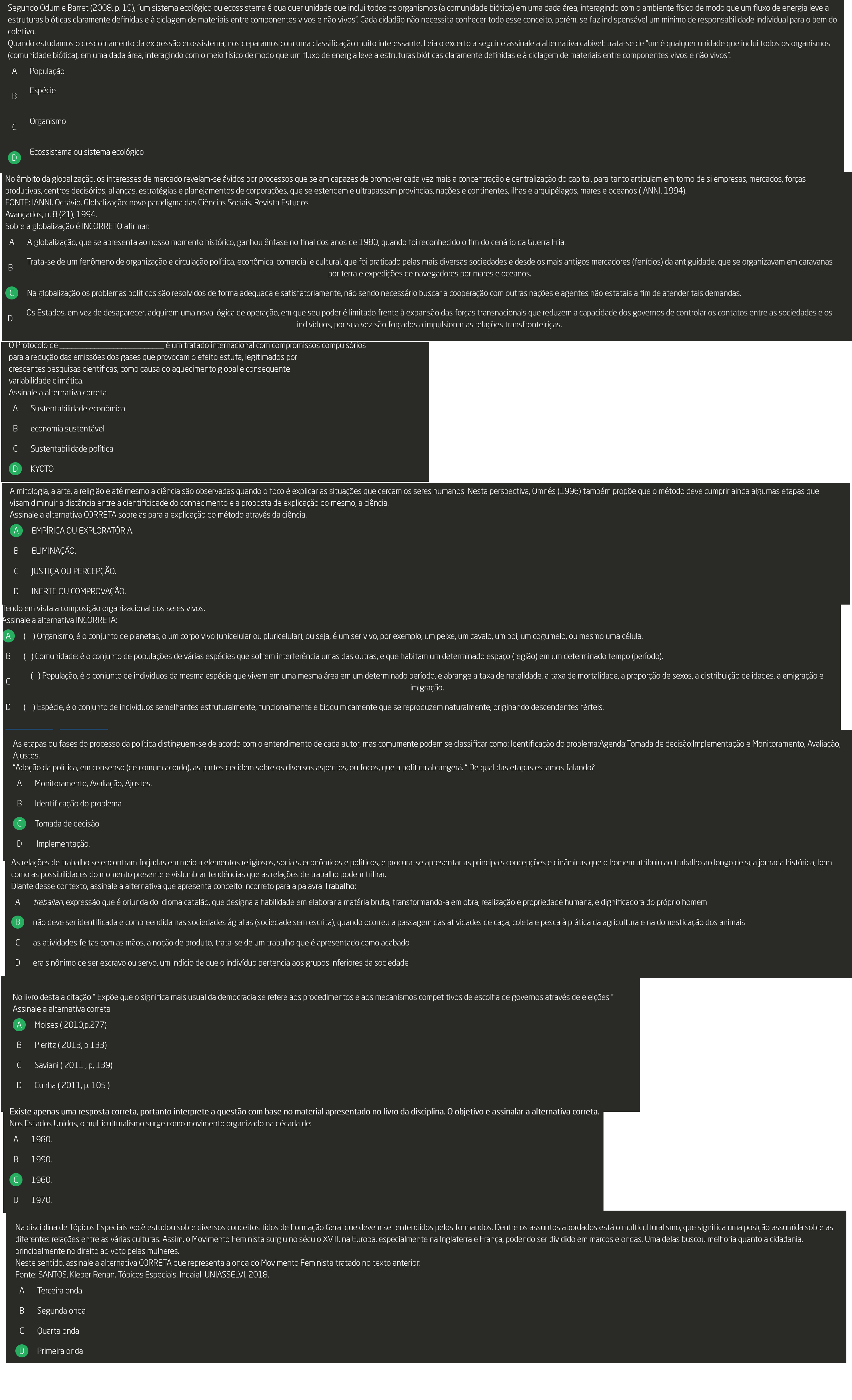 <p>Segundo Odum Barret 19), "um sistema ecológico ou ecossistema é qualquer unidade que inclui todos os organismos (a comunidade biótica) em uma dada área, interagindo com ambiente físico de modo que um fluxo de energia leve a estruturas bióticas claramente efinidas e à ciclagem de materiais entre componentes vivos e não vivos" Cada cidadão não necessita conhecer todo esse conceito, porém, se faz indispensável um mínimo de responsabilidade individual para bem do coletivo. Quando estudamos desdobramento da expressão nos deparamos com uma classificação muito interessante. Leia excerto a seguir e assinale a alternativa cabível: trata se de "um é qualquer unidade que inclui todos os organismos (comunidade biótica), em uma dada área, interagindo com meio físico de modo que um fluxo de energia a estruturas bióticas claramente definidas e à ciclagem de materiais entre componentes vivos não vivos". A População Espécie B Organismo C Ecossistema ou sistema ecológico No âmbito da globalização, os interesses de mercado revelam-se ávidos por processos que sejam capazes de promover cada vez mais a concentração e centralização do capital, para tanto ticulam em torno de si empresas, mercados, forças produtivas, centros decisórios, alianças, estratégias e planejamentos de que se estendem eultrapassam províncias, nações e continentes, ilhas e mares e oceanos (IANNI, 1994). FONTE: IANNI, novo paradigma das Ciências Sociais. Revista Estudos 8 1994. Sobre a globalização é INCORRETO A A que se apresenta ao nosso momento histórico, ganhou ênfase no final dos anos de 1980, quando foi fim do cenário da Guerra Fria. Trata- se de um fenômeno de organização e circulação política, econômica, comercial e cultural, que foi praticado pelas mais diversas sociedades e desde os mais antigos mercadores (fenícios) da antiguidade, que se organizavam em caravanas B por e expedições de navegadores por mares e oceanos. Na globalização os problemas políticos são resolvidos de forma adequada e não sendo necessário buscar a cooperação com outras nações e agentes não estatais a fim de atender tais demandas. Os Estados, em vez de desaparecer, adquirem uma nova lógica de operação, em que seu poder é limitado frente à expansão das forças transnacionais que reduzem a capacidade dos governos de controlar os contatos entre as sociedades D indivíduos, por sua vez são forçados a impulsionar as relações Protocolo de tratado internacional com compromissos con IOS para redução das emissões dos gases que provocam efeito estufa, legitimados por crescentes pesquisas científicas, como causa do aquecimento global e variabilidade climática Assinale alternativa correta A Sustentabilidade econômica B economia sustentável C Sustentabilidade política KYOTO A mitologia, a arte. religião e até mesmo a ciência são observadas quando o foco é explicar as situações que cercam seres humanos. Nesta perspectiva, Omnés (1996) também propõe que método deve cumprir ainda algumas etapas que visam diminuir a distância entre a cientificidade do conhecimento e proposta de explicação do a ciência. Assinale a alternativa CORRE TA sobre as para explicação do método através da EMPÍRICA OU EXPLORATÓRIA B ELIMINAÇÃO C JUSTIÇA ou PERCEPÇÃO. D INERTE OU Tendo em vista a composição organizacional dos seres Assinale a alternativa INCORRE TA: ( Organismo, é conjunto de planetas, um corpo vivo (unicelular ou ou seja, é um ser vivo, por exemplo, um peixe, um cavalo, um boi, um cogumelo, ou mesmo uma célula B ( Comunidade: é conjunto de populações de várias espécies que sofrem interferência umas das outras, e que habitam um determinado espaço (região) em um determinado tempo (período) ( é conjunto de indivíduos da mesma espécie que vivem em uma mesma área em um determinado período, e abrange a taxa de natalidade, a taxa de mortalidade, a proporção de sexos, a distribuição de idades. a emigração e imigração. D ( Espécie, éo conjunto de indivíduos semelhantes estruturalmente, funcionalmente e bioquimicamente que se reproduzem naturalmente originando descendentes férteis. As etapas ou fases do processo da política se de acordo com entendimento de cada autor, mas comumente podem se classificar Identificação do problema:Agenda Tomada de e Monitoramento, Avaliação, Ajustes. "Adoção da política, em consenso (de comum acordo), as partes decidem sobre os diversos aspectos, ou focos, que a política abrangerá. qual das etapas estamos falando? A Monitoramento, Avaliação, Ajustes. B Identificação do problema Tomada de decisão D As relações de trabalho se encontram forjadas em meio elementos religiosos, sociais, econômicos e políticos, e procura-se apresentar as principais concepções e dinâmicas que o homem atribuiu ao trabalho ao longo de sua jornada bem como as possibilidades do momento presente e vislumbrar tendências que as relações de trabalho podem trilhar. Diante desse contexto, assinale a alternativa que apresenta conceito incorreto para a palavra Trabalho: A treballan, expressão que é oriunda do idioma catalão, que a habilidade em elaborar a matéria bruta, transformando-a em obra, realização e propriedade humana, e dignificadora do próprio homem não deve ser identificada e compreendida nas sociedades ágrafas (sociedade sem escrita), quando ocorreu a passagem das atividades de caça, coleta e pesca à prática da agricultura na domesticação dos animais C as atividades feitas com as mãos, noção de produto, trata- se de um trabalho que é apresentado como acabado D era sinônimo de ser escravo ou servo, um indício de que indivíduo pertencia aos grupos inferiores da sociedade No livro desta citação Expõe que significa mais usual da democracia se refere aos procedimentos e aos mecanismos competitivos de escolha de governos através de eleições Assinale alternativa correta Moises B Pieritz (2013 133) S