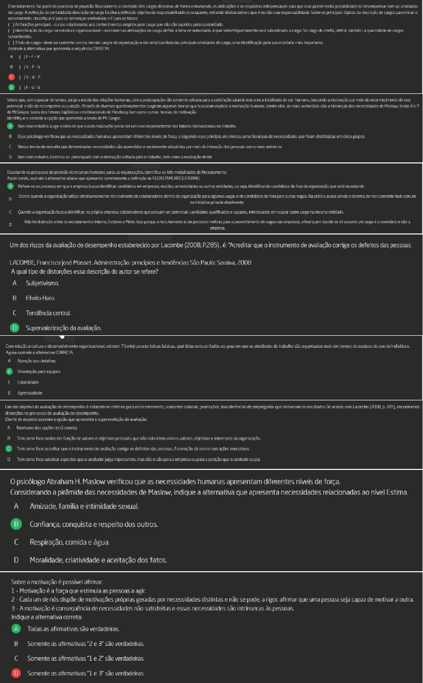 <p>recrutamento faz parte do processo de provisão conteúdo dos cargos de forma as atribuições e os requisitos indispensáveis para que ocupante tenha possibilidade de desempenhar bem as atividades do cargo. A do conteúdo/da descrição de cargo facilita definição objetiva da responsabilidade do evitando sobre que é ou não sua Sobre os principais tópicos da descrição de cargos para iniciar classifique V para as sentenças para as falsas ( Atribuições principais cursos relacionados aos conhecimentos exigidos pelo não são supridos pela escolaridade Identificação do cargo na estrutura organizacional base nas atribuições do cargo, definir alinha de autoridade qual tamento será subordinado cargo Se cargo de chefia definir, a quantidade de cargos subordinados ( Título do cargo deve ser coerente com os demais cargos da organização e dar uma boa ideia das principais atividades do cargo, uma identificação pela sua atividade mais importante. Assinale a alternativa que apresenta CORRE A B )V-V-F Vimos que, com passar do surge escola das relações com preocupação não somente voltada para mas com totalidade do ser buscando a motivação por meio do reconhecimento de seu potencial enão da recompensa ou punição. Através de diversos questionamentos surgiram algumas teorias que buscaram explicar dentre elas as mais conhecidas a hierarquia das necessidades de teoria Y de teoria dos fatores higiênicos e motivacionais de bem como outras teorias de Identifique assinale opção que apresenta teoria de Mc Gregor Nos seus estudos surge ideia de que auto realização possa ser um novo representante dos fatores motivacionais no trabalho B Esse psicólogo verificou que as necessidades humanas apresentam diferentes níveis de força, seguindo esse ele elencou uma hierarquia de necessidades que foram em cinco Nessa teoria ele ressalta que determinadas necessidades são aprendidas socialmente adquiridas por meio da interação das pessoas com meio ambiente D Nos seus estudos, mostrou se preocupado com motivação voltada para bem como realização deste Estudando os processos de provisão de recursos humanos paras as identifica se três modalidades de Assim assinale a alternativa abaixo que apresenta corretamente definição de RECRUTAMENTO EXTERNO Refere- se ao processo em que empresa busca identificar candidatos em empresas, escolas, universidades ou outras ou seja, identificando candidatos de fora da organização que está utiliza simultaneamente recrutamento de colaboradores dentro da organização para algumas vagas de candidatos de fora para outras Na prática acaba sendo sistema de recrutamento mais comum na iniciativa privada atualmente. Quando organização busca na própria empresa, colaboradores que possam ser potenciais candidatos qualificados e capazes, interessados em ocupar outro cargo na mesma entidade Não distinção entre os recrutamentos Externo Misto Isso porque recrutamento um processo ineficaz para preenchimento de vagas nas empresas, afinal se irá assumir um cargo candidato não a D empresa Um dos riscos da avaliação de desempenho estabelecido por Lacombe (2008, P.285) "Acreditar que instrumento de avaliação corrige os defeitos das pessoas. Francisco José Masset. Administração: princípios e tendências São Paulo: Saraiva, 2008 A qual tipo de distorções essa descrição do autor se refere? A Subjetivismo. B Efeito Halo Tendência central. D Supervalorização da avaliação. Com relação a cultura e desenvolvimento organizacional, existem 7 (sete) características qual delas esta atribuída ao grau em que as atividades de trabalho são organizadas mais em termos de equipes do que de indivíduos Agora assinale a alternativa CORRETA A Atenção aos detalhes Orientação para equipes Estabilidade D Agressividade Um dos objetivo da avaliação de desempenho é estabelecer critérios para aumentos transferências de empregados que obtiveram os resultados De acordo com Lacombe (2008 encontramos distorções no pro cesso de avaliação de desempenho Diante do exposto assinale opção que apresenta a superavaliação da avaliação. A Nenhuma das opções está correta B Tem como foco avaliar em função de valores e objetivos pessoais, que não coincidem com os valores, objetivos e interesses da organização Tem como foco acreditar que instrumento de avaliação corrige os defeitos das pessoas A correção só ocorre com ações executivas. D Tem como foco valorizar aspectos que avaliador julga importantes, mas não o são para a empresa ou para posição que avaliado ocupa psicólogo Abraham H. Maslow verificou que as necessidades humanas apresentam diferentes níveis de força. Considerando a pirâmide das necessidades de Maslow, indique a alternativa que apresenta necessidades relacionadas ao nível Estima. A Amizade, família e intimidade sexual. B Confiança, conquista e respeito dos outros. Respiração, comida e água. D Moralidade, criatividade e aceitação dos fatos. Sobre a motivação é possível afirmar: 1 Motivação é a força que estimula as pessoas a agir. 2 Cada um de nós dispõe de motivações próprias geradas por necessidades distintas e não se pode, a rigor, afirmar que uma pessoa seja capaz de motivar a outra. 3 A motivação é consequência de necessidades não satisfeitas e essas necessidades são intrínsecas às pessoas. Indique a alternativa correta: A Todas as afirmativas são verdadeiras. B Somente as afirmativas "2 e 3" são verdadeiras. C Somente as afirmativas "1 e 2" são D Somente as afirmativas "1 e 3" são</p><p>A LIDERANÇA É OBSERVADA NO DIA A DIA DAS ORGANIZAÇÕES ASSINALE A ALTERNATIVA CORRETA QUE TRAZ UM TIPO DE LIDERANÇA ORGANIZACIONAL A LIDERANÇA CARISMÁTICA B LIDERANÇA PASSIVA LIDERANÇA ATIVA D LIDERANÇA REVERSA Formas de aplicação de Provas: são as planejadas e estruturadas na forma de testes Sua aplicação é rápida e fácil. Sua aferição também é rápida, fácil e Gestão de Pessoas 