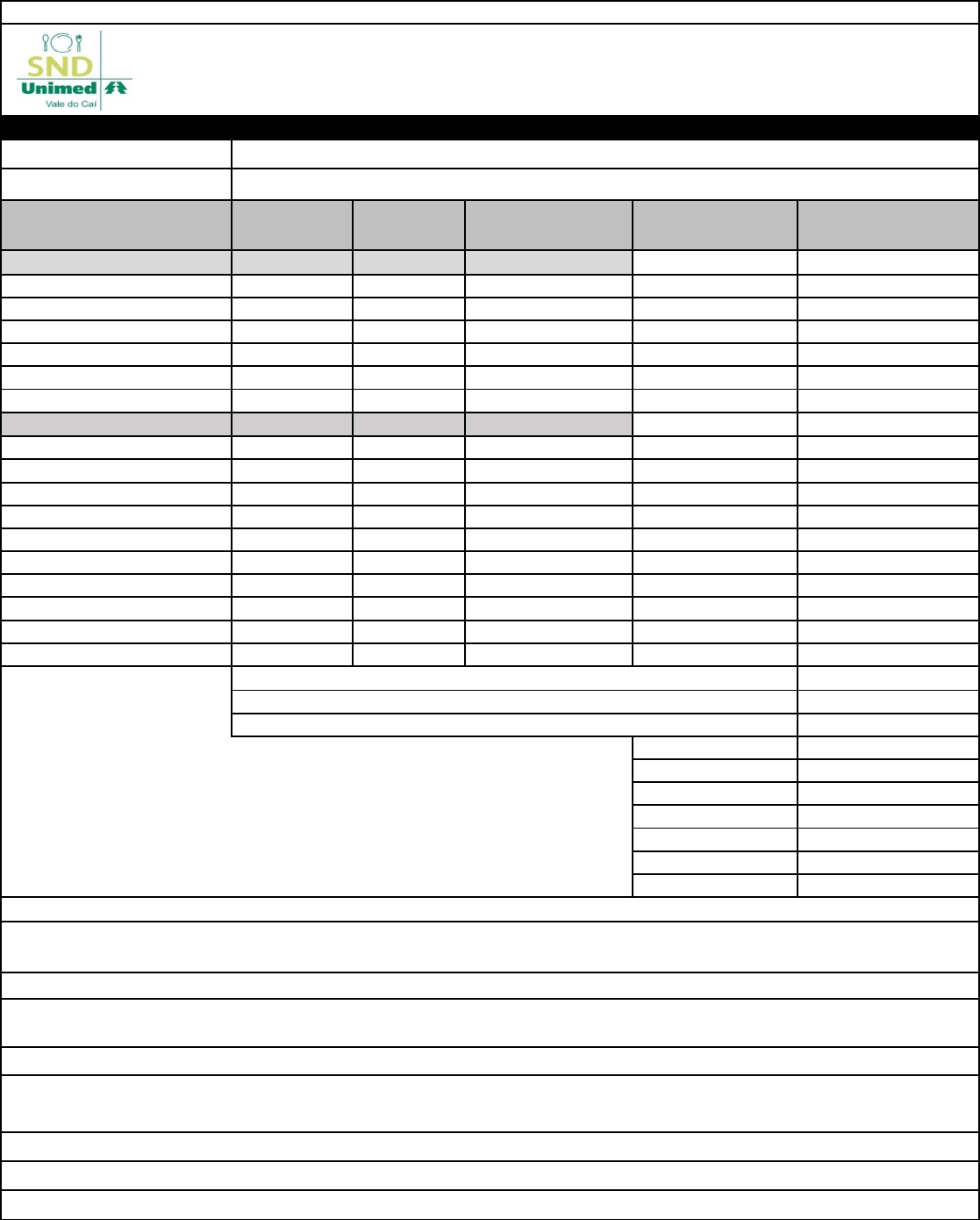 <p>Planilha1</p><p>Nome do prato:</p><p>Nº de porções:</p><p>Ingredientes Quantidade Unidade Medida Caseira Preço Unitário Custo Parcial</p><p>Massa</p><p>Farinha de trigo 0,6 kg 3xícaras R$ 1,94 R$ 1,16</p><p>Leite integral 0,25 Lt 1 xícara R$ 2,16 R$ 0,54</p><p>Ovo 1 Unidade 01 und R$ 0,28 R$ 0,28</p><p>Óleo de soja 0,2 kg 1 xícara R$ 3,83 R$ 0,77</p><p>Fermento químico 0,02 kg 1 col sopa R$ 19,35 R$ 0,39</p><p>Recheio</p><p>Óleo de soja 0,1 kg 2 colheres R$ 3,83 R$ 0,38</p><p>Carne moída 0,5 kg 2 xícaras R$ 22,91 R$ 11,46</p><p>Cebola 0,3 kg 2 unidades R$ 1,60 R$ 0,48</p><p>Tomate 0,3 lt 2 unidades R$ 2,00 R$ 0,60</p><p>Azeitona verde s/ caroço 0,4 kg 1 xícara R$ 11,70 R$ 4,68</p><p>Pimenta à gosto R$ 0,00</p><p>Sal à gosto</p><p>Salsinha à gosto</p><p>KCAL POR PORÇÃO</p><p>R$ 20,74</p><p>R$ 1,73</p><p>Kcal Total</p><p>Kcal Porção 100g</p><p>CH</p><p>LIP</p><p>PROT</p><p>FIBRAS</p><p>SÓDIO</p><p>Modo de Fazer: Em uma forma de 35cm x 25cm untada, despejar metade da massa,espalhar o recheio e cobrir com</p><p>a outra metade da massa. Levar ao forno por aproximadamente 30min, ou até dourar.</p><p>Preço por Venda:</p><p>Modo de Preparo:</p><p>Preparo Massa: Bater todos os ingredientes da massa acrescentando a farinha aos poucos até ficar em consistência</p><p>homogênia.</p><p>Preparo do recheio: Em uma panela aqueça o óleo e adicione a carne moída, a cebola e refogue por 10 minutos.</p><p>Adicione o tomate e refogue por mais 5minutos. Acrescente os ingredientes restantes e cozinhe por 05minutos.</p><p>FICHA TÉCNICA</p><p>FICHA TÉCNICA</p><p>Torta de carne moída c/ azeitona ( Para Refeitório)</p><p>12</p><p>Custo Total dos Ingredientes:</p><p>Custo por Porção (Per Capta):</p><p>Página 1</p>