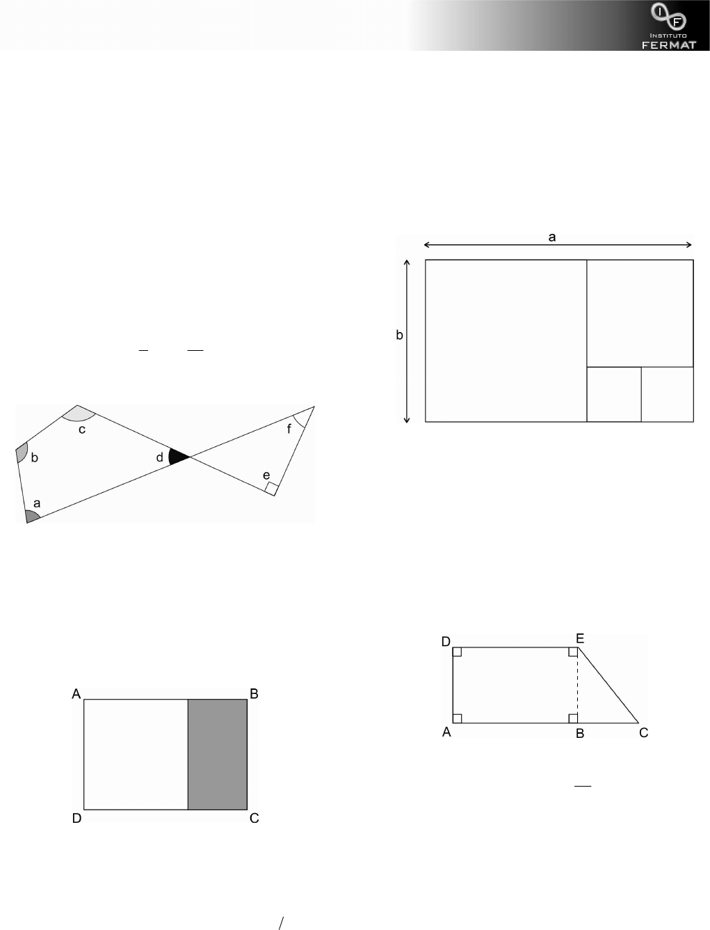 <p>www.institutofermat.com.br 1</p><p>GEOMETRIA PLANAGEOMETRIA PLANAGEOMETRIA PLANAGEOMETRIA PLANA ---- Fuvest Fuvest Fuvest Fuvest</p><p>Parte 2</p><p>Quadriláteros ..................................................................................................................................................1</p><p>Polígonos ........................................................................................................................................................4</p><p>Circunferências ...............................................................................................................................................6</p><p>Polígonos e Circunferências ..........................................................................................................................11</p><p>QuadriláterosQuadriláterosQuadriláterosQuadriláteros</p><p>01.01.01.01. (Fuvest/78) Na figura abaixo os ângulos ˆ ˆˆ ˆ, , ea b c d</p><p>medem respectivamente,</p><p>2</p><p>x</p><p>, 2x ,</p><p>3</p><p>2</p><p>x</p><p>e x . O ângulo ê é</p><p>reto. Qual a medida do ângulo f̂ ?</p><p>a)16º b) 18º c) 20º</p><p>d) 22º e) 24º</p><p>02. 02. 02. 02. O retângulo ABCD representa um terreno retangular cuja</p><p>largura é 3/5 do comprimento. A parte hachurada representa</p><p>um jardim retangular cuja largura é também 3/5 do</p><p>comprimento. Qual a razão entre a área do jardim e a área</p><p>total do terreno?</p><p>a) 30% b) 36 % c) 40%</p><p>d) 45% e) 50%</p><p>03.03.03.03. (Fuvest/92) O retângulo abaixo de dimensões a e b está</p><p>decomposto em quadrados. Qual o valor da razão a b ?</p><p>a) 5/3 b) 2/3 c) 2</p><p>d) 3/2 e) 1/2</p><p>04.04.04.04. (Fuvest/00) Um trapézio retângulo tem bases 5 e 2 e</p><p>altura 4. O perímetro desse trapézio é:</p><p>a) 13 b) 14 c) 15</p><p>d) 16 e) 17</p><p>05050505. (Fuvest/99) Dois irmãos herdaram um terreno com a</p><p>seguinte forma e medidas:</p><p>AD = 20 m; AB = 60 m; BC = 16 m</p><p>Para dividir o terreno em duas partes de mesma área, eles</p><p>usaram uma reta perpendicular a AB . Para que a divisão</p><p>seja feita corretamente, a distância dessa reta ao ponto A, em</p><p>metros, deverá ser:</p><p>a) 31 b) 32 c) 33</p><p>d) 34 e) 35</p><p>06.06.06.06. Em um trapézio retângulo, as bases medem 5 cm e 21</p><p>cm. Sendo sua diagonal menor igual a base média, podemos</p><p>afirmar que seu perímetro, em cm , mede</p><p>a) 42 b) 46 c) 51</p><p>d) 58 e) 60</p><p>07. 07. 07. 07. (Fuvest/90) Cortando-se os cantos de um quadrado</p><p>como mostra a figura obtém-se um octógono regular de lados</p><p>iguais a 10 cm</p><p>a) Qual a área total dos quatro triângulos cortados?</p><p>www.institutofermat.com.br 2</p><p>b) Calcule a área do octógono.</p><p>08. 08. 08. 08. (Fuvest/13) O mapa de uma região utiliza a escala de 1:</p><p>200.000. A porção desse mapa, contendo uma Área de</p><p>Preservação Permanente (APP), está representada na figura,</p><p>na qual AF e DF são segmentos de reta, o ponto G está no</p><p>segmento AF , o ponto E está no segmento DF , ABEG é</p><p>um retângulo e BCDE é um trapézio. Se</p><p>= = = =15, 12, 6, 3AF AG AB CD e = 5 5DF indicam</p><p>valores em centímetros no mapa real, então a área da APP é</p><p>Obs: Figura ilustrativa, sem escala.</p><p>a) 100 km2 b) 108 km2 c) 210 km2</p><p>d) 240 km2 e) 444 km2</p><p>09.09.09.09. (Fuvest/92) Na figura, o lado de cada quadrado da malha</p><p>quadriculada mede 1 unidade de comprimento. Calcule a</p><p>razão</p><p>DE</p><p>BC</p><p>10.10.10.10. (Fuvest/93) a) Calcule a área do quadrilátero inscrito</p><p>numa circunferência de raio unitário, como indicado na</p><p>figura.</p><p>b) Expresse essa área em função de = cos18ºm</p><p>11.11.11.11. (Fuvest/00) Na figura seguinte, E é o ponto de intersecção</p><p>das diagonais do quadrilátero ABCD e θ é o ângulo agudo</p><p>ˆBEC . Se EA = 1, EB = 4, EC = 3 e ED = 2, então a área</p><p>do quadrilátero ABCD será:</p><p>a) 12 senθ b) 8 senθ c) 6 senθ</p><p>d) 10 cosθ e) 8 cosθ</p><p>12.12.12.12. (UFF/00) Na figura, MNPQ é um retângulo, MNUV é um</p><p>paralelogramo, as medidas de MQ e MV são iguais e</p><p>α< <0º 45º .</p><p>Indicando–se por S a área de MNPQ e por S’ a área de</p><p>MNUV, conclui–se que:</p><p>a) α= ⋅' senS S</p><p>b) ='S S</p><p>c) α= ⋅' cosS S</p><p>d) α= ⋅' cosS S</p><p>e) α= ⋅' senS S</p><p>www.institutofermat.com.br 3</p><p>13131313. Os quadrados da figura têm lados medindo 10 cm e 20</p><p>cm, respectivamente. Se C é o centro do quadrado de menor</p><p>lado, o valor da área hachurada, em cm2, é:</p><p>a) 25 b) 27 c) 30</p><p>d) 35 e) 40</p><p>14. 14. 14. 14. (Fuvest/92) Considere uma circunferência de centro O e</p><p>raio 2 cm tangente à reta t no ponto T. Seja x a medida do</p><p>ângulo ˆAOT , onde A é um ponto da circunferência e</p><p>π</p><p>< <0</p><p>2</p><p>x . Calcule, em função de x, a área do trapézio</p><p>OABT sendo B o ponto da reta t tal que AB é paralelo a</p><p>OT .</p><p>15.15.15.15. (OBM) No trapézio abaixo, têm-se: AB paralelo a CD ,</p><p>AD = 10 cm e CD = 15 cm. O ângulo Ĉ mede 75º e o</p><p>ângulo D̂ , 30°. Quanto mede o lado AB , em centímetros?</p><p>a) 5 b) 7,5 c) 10</p><p>d) 12,5 e) 5 3</p><p>16.16.16.16. (Fuvest-GV) Queremos desenhar no interior de um</p><p>retângulo ABCD, um losango AICJ com vértice I sobre o lado</p><p>AB do retângulo e vértice J sobre o lado CD. Se as dimensões</p><p>dos lados do retângulo são AB = 25 cm e BC = 15 cm, então</p><p>a medida do lado do losango é:</p><p>a) 13 cm b) 15 cm c) 17 cm</p><p>d) 18 cm e) 15 2cm</p><p>17.17.17.17. (UFRGS) O ponto F está na diagonal AC do</p><p>paralelogramo ABCD abaixo. Se a área do paralelogramo</p><p>DEFG mede 1, a área da região hachurada mede</p><p>a)</p><p>1</p><p>2</p><p>b)</p><p>2</p><p>2</p><p>c)</p><p>3</p><p>2</p><p>d) 1 e) 2</p><p>18.18.18.18. (Fuvest/98) No quadrilátero ABCD, 