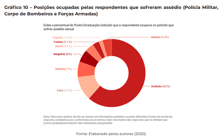 <p>Gráfico 10 - Posições ocupadas pelas respondentes que sofreram assédio (Polícia Milita Corpo de Bombeiros e Forças Armadas) Exibe percentual do Posto/Graduação indicado que a respondente ocupava no que sofreu assédio sexual Capitão (1.9%) Outros (4.3%) Cadete (3.1%) Aluna (4.3%) Sargento (6%) Tenente (7%) Soldado (62%) Cabo (11%) Para essa devido ao de informações ausentes ou pelas diferentes formas de escrita da e uniformizou-se os termos mais recorrentes das respostas que se referiam aos das instituições Fonte: Elaborado pelos autores (2020).</p>