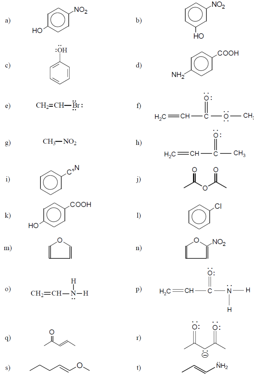 <p>LISTA DE EXERCÍCIOS – Estruturas canônicas de ressonância (I)</p><p>1. Escreva as estruturas canônicas de ressonância para cada molécula abaixo:</p><p>2. As formas ceto e enólica representadas abaixo podem ser consideradas estruturas canônicas de</p><p>ressonância, ou não? Explique.</p><p>3. Baseando-se nas estruturas eletrônicas de cada composto, sugira uma explicação para os seguintes</p><p>valores do comprimento de ligação carbono-carbono determinados experimentalmente:</p><p>4. Sugira a hibridização para os átomos de carbono das estruturas A e B. Em seguida, escreva as</p><p>estruturas de ressonância de A e B. Qual das espécies A ou B você espera que seja mais estável?</p><p>Explique.</p><p>4a. Você acredita que a estrutura abaixo (C) é uma das estruturas canônicas de ressonância propostas para</p><p>a espécie A, do exercício anterior? Explique.</p><p>5. Os valores do comprimento de ligação do buta-1,3-dieno foram determinados e são os seguintes:</p><p>Baseando-se na estrututura sugira uma explicação para as seguintes observações experimentais: o</p><p>comprimento da ligação C1-C2 e da ligação C3-C4 têm (dentro dos erros experimentais) o mesmo valor que</p><p>o da dupla ligação carbono-carbono do eteno. Já o comprimento da ligação C2-C3 do buta-1,3-dieno (1,47</p><p>Å) é menor do que o da simples ligação no etano (1,54 Å).</p><p>LISTA DE EXERCÍCIOS – Estruturas canônicas de ressonância (II)</p><p>1.Circule os seguintes pares de estruturas que não constituem estruturas de ressonância. Para cada par de</p><p>estruturas de ressonância, desenhe as setas curvas para converter a primeira estrutura na segunda.</p><p>2.Escreva as estruturas canônicas de ressonância de cada uma das espécies abaixo:</p><p>3. Desenhe todas as estruturas de ressonância relevantes para B e coloque em ordem de energia (1 =</p><p>menor energia). Se duas ou mais estruturas de ressonância são similares em energia, coloque-as</p><p>então no mesmo nível.</p><p>4. O cátion bis-fenílico é extremamente estável. Explique esse fato baseando-se nas estruturas de</p><p>ressonância do mesmo.</p><p>5. Desenhe as estruturas de ressonância para cada um dos compostos e, a seguir. Classifique-as em</p><p>ordem decrescente de contribuição para o híbrido.</p><p>6. Sugira uma explicação – consisderando as estrturas eletrônicas das moléculas envolvidas, para o</p><p>seguinte fato experimental: as dissociações do ácido ciânico e do ácido isociânico - representadas pelas</p><p>equações abaixo – leva, a formação de um mesmo ânion (cianato):</p><p>7. Você considera que a estrutura D pode ser proposta com uma das estruturas canônicas que descreve o</p><p>radical alila? Explique.</p>