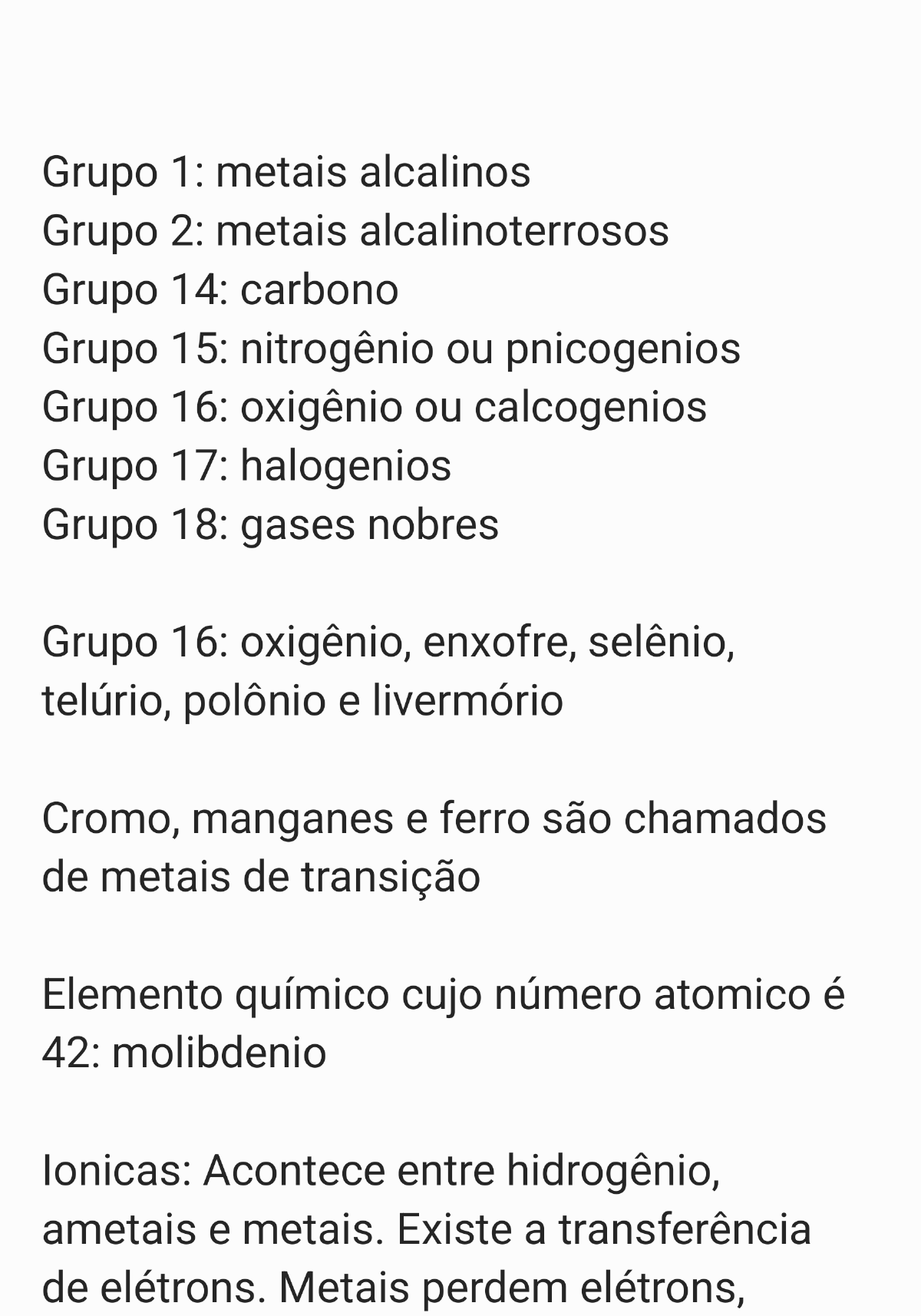 <p>Grupo 1: metais alcalinos Grupo 2: metais alcalinoterrosos Grupo 14: carbono Grupo 15: nitrogênio ou pnicogenios Grupo 16: oxigênio ou calcogenios Grupo 17: halogenios Grupo 18: gases nobres Grupo 16: oxigênio, enxofre, selênio, telúrio, polônio e livermório Cromo, manganes e ferro são chamados de metais de transição Elemento químico cujo número atomico é 42: molibdenio lonicas: Acontece entre hidrogênio, ametais e metais. Existe a transferência de elétrons. Metais perdem elétrons,</p><p>ametais e elétrons, ametais e hidrogênio ganha elétrons É um tipo de ligação química que ocorre entre um metal e um ametal ou entre um metal e o hidrogênio compartilham pares de elétrons. Acontece entre hidrogênio e ametais É um tipo de ligação química formada pelo compartilhamento de elétrons entre dois átomos não metálicos Metalica: Átomos de metais que formam nuvens eletrônicas que se atraem. Acontece entre metais. Existem elétrons livres É uma ligação estabelecida entre os átomos de um único elemento metálico Regra do octeto: Uma regra que estabelece que os átomos devem possuir</p><p>oito eletrons em sua camada de valência de modo a adquirir estabilidade química</p>