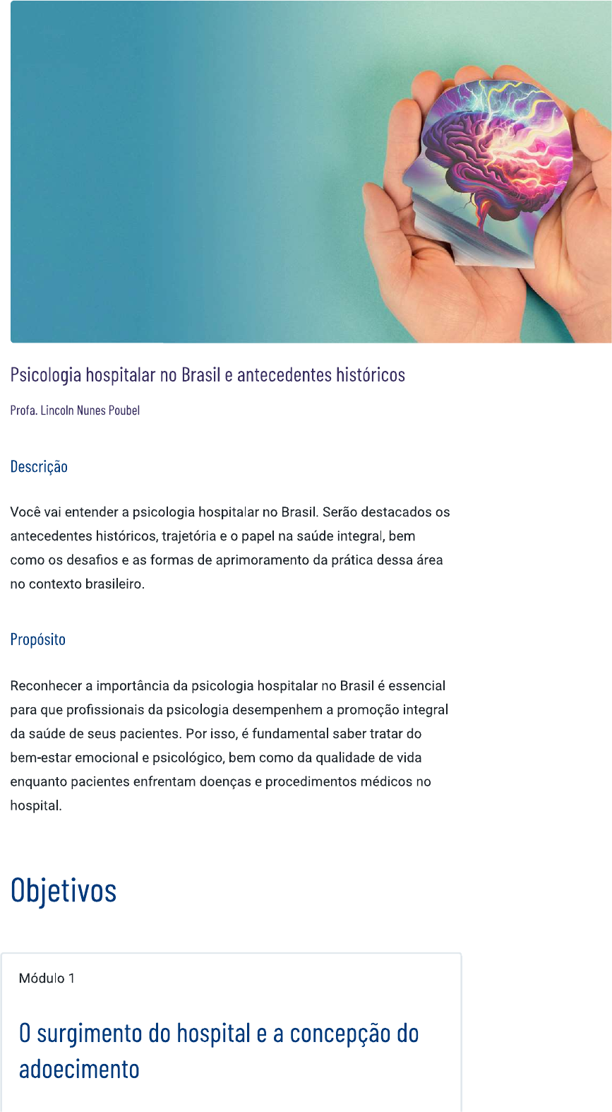<p>Psicologia hospitalar no Brasil e antecedentes históricos Profa. Lincoln Nunes Poubel Descrição Você vai entender a psicologia hospitalar no Brasil. Serão destacados os antecedentes históricos, trajetória e o papel na saúde integral, bem como os desafios e as formas de aprimoramento da prática dessa área no contexto brasileiro. Propósito Reconhecer a importância da psicologia hospitalar no Brasil é essencial para que profissionais da psicologia desempenhem a promoção integral da saúde de seus pacientes. Por isso, é fundamental saber tratar do bem-estar emocional e psicológico, bem como da qualidade de vida enquanto pacientes enfrentam doenças e procedimentos médicos no hospital. Objetivos Módulo 1 0 surgimento do hospital e a concepção do adoecimento</p><p>Reconhecer a evolução histórica da psicologia hospitalar no Brasil e seus antecedentes. Módulo 2 As diferentes compreensões do conceito de saúde Comparar conceitos e perspectivas sobre saúde, considerando sua complexidade por meio de diferentes fatores envolvidos. Módulo 3 Políticas públicas de saúde no Brasil e a criação do SUS Reconhecer políticas públicas e programas de saúde do Brasil, essenciais para o funcionamento do SUS. Módulo 4 Humanizando a abordagem ao paciente no hospital Identificar estratégias e práticas para humanizar a abordagem a pacientes no ambiente Introdução</p><p>A psicologia hospitalar no Brasil compreende uma atuação voltada para as complexas dinâmicas relativas à saúde integral de pacientes no ambiente hospitalar. A evolução dessa área reflete não apenas a necessidade crescente de abordar as dimensões psicológicas do adoecimento, mas também uma transformação nos paradigmas de cuidado em saúde, que reconhecem a integralidade do ser humano. Para compreendermos o desenvolvimento da psicologia hospitalar no Brasil, devemos explorarmos sua história, que remonta às primeiras iniciativas de humanização do cuidado médico no país. Com a chegada da medicina moderna no século XIX, surgiram os primeiros hospitais. Consequentemente, houve a necessidade de abordar não apenas os aspectos físicos das doenças, mas também as dimensões emocionais e sociais dos pacientes. Neste conteúdo, identificaremos os principais marcos históricos e avanços da psicologia hospitalar no Brasil, destacando sua relevância na saúde pública e suas contribuições para promover uma assistência mais humanizada e integrada. Ao reconhecermos sua trajetória, estaremos mais capacitados a valorizar e fortalecer essa importante área de atuação no campo da saúde. Material para download Clique no botão abaixo para fazer o download do conteúdo completo em formato PDF. Download material</p><p>1- - 0 surgimento do hospital e a concepção do adoecimento Ao final deste módulo, você será capaz de reconhecer a evolução histórica da psicologia hospitalar no Brasil e seus antecedentes. 0 hospital e suas classificações Neste vídeo, serão apresentados conceitos, funções e diferentes classificações de hospital, destacando implicações do uso de cada um dos diferentes critérios de classificação existentes. Para assistir a um vídeo sobre o assunto, acesse a versão online deste conteúdo. A instituição hospitalar cumpre várias funções. o hospital tem um papel educativo, formando profissionais de saúde e de educação sanitária para a comunidade. Ele também é um centro de pesquisa científica e um local de reabilitação para pacientes. Por fim, sua função primordial é curativa, tratando várias doenças e buscando a cura terapêutica. É essencial entender a classificação hospitalar e seus serviços, uma vez que há várias formas de classificá-los. Confira! A classificação Gestão</p><p>Quando classificamos hospitais pela gestão, podemos destacar três tipos: Hospitais geridos pela administração pública que são governados por entidades estatais. Hospitais administrados por entidades privadas que são geridos por organizações particulares. Hospitais públicos administrados por entidades privadas, o que afeta os serviços prestados. Especialidades Quando oferecidas, determinam os serviços ofertados no hospital e permitem direcionar os pacientes para o atendimento mais adequado às suas necessidades. Quanto a esse aspecto, os hospitais são classificados em dois tipos: Hospitais gerais Cobrem diversas especialidades médicas básicas. Hospitais especializados Concentram-se em áreas específicas, como neurocirurgia e cardiologia, entre outras. Números de leitos A quantidade de leitos disponíveis para os pacientes também classifica hospitais. Conforme definido pelo Ministério da Saúde, essa classificação se dá seguinte forma: Hospitais de pequeno porte possuem até 50 leitos. Hospitais de médio porte dispõem de 51 a 150 leitos. Hospitais de grande porte têm de 151 a 500 leitos. Hospitais de porte especial contêm mais de 500 Internação Visa atender às necessidades específicas dos pacientes e possue três classificações. Vamos conhecê-las! Internação integral</p><p>Mantem o paciente internado até a alta Internação parcial Oferece procedimentos sem necessidade de internação prolongada. Internação de longa permanência É voltada para pacientes com condições crônicas ou tratamentos prolongados, como hospitais psiquiátricos. Estrutura física Também é possível categorizar as instituições hospitalares pela estrutura física, sendo que essas adaptam-se às necessidades específicas de cada instituição, garantindo eficiência na prestação de serviços. Podemos citar: Hospital monobloco: todos os serviços são concentrados na mesma edificação, facilitando a acessibilidade e organização. Hospital multibloco: os serviços são distribuídos em edificações interligadas ou não, formando um complexo hospitalar para diversas especialidades. Hospital pavilhão: os serviços são divididos em prédios isolados, p