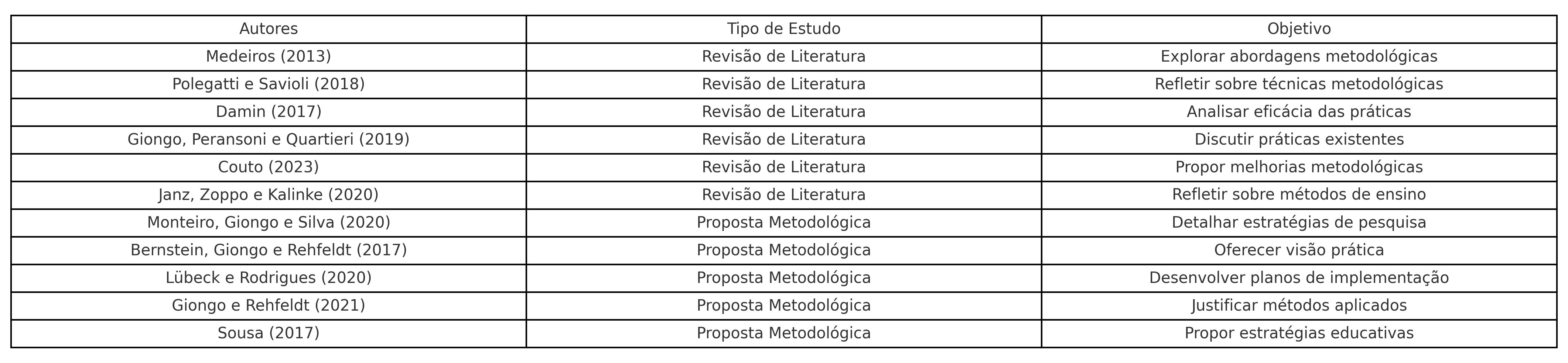 <p>Autores Tipo de Estudo Objetivo Medeiros (2013) Revisão de Literatura Explorar abordagens metodológicas Polegatti e Savioli (2018) Revisão de Literatura Refletir sobre técnicas metodológicas Damin (2017) Revisão de Literatura Analisar eficácia das práticas Giongo, Peransoni e Quartieri (2019) Revisão de Literatura Discutir práticas existentes Couto (2023) Revisão de Literatura Propor melhorias metodológicas Janz, Zoppo e Kalinke (2020) Revisão de Literatura Refletir sobre métodos de ensino Monteiro, Giongo e Silva (2020) Proposta Metodológica Detalhar estratégias de pesquisa Bernstein, Giongo e Rehfeldt (2017) Proposta Metodológica Oferecer visão prática Lübeck e Rodrigues (2020) Proposta Metodológica Desenvolver planos de implementação Giongo e Rehfeldt (2021) Proposta Metodológica Justificar métodos aplicados Sousa (2017) Proposta Metodológica Propor estratégias educativas</p>