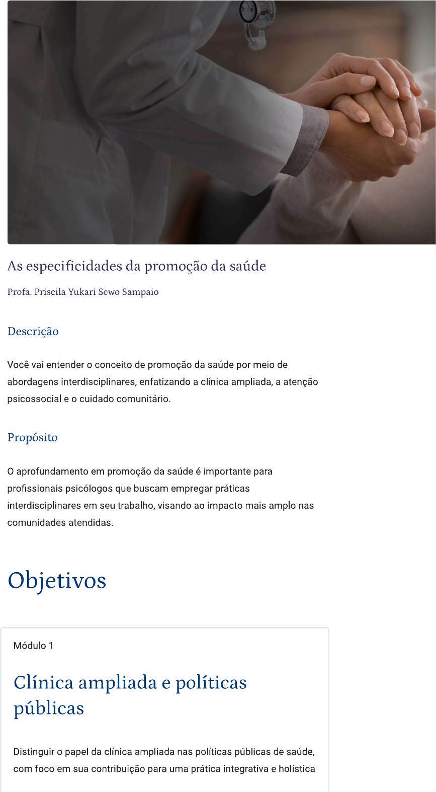<p>As especificidades da promoção da saúde Profa. Priscila Yukari Sewo Sampaio Descrição Você vai entender o conceito de promoção da saúde por meio de abordagens interdisciplinares, enfatizando a clínica ampliada, a atenção psicossocial e o cuidado comunitário. Propósito o aprofundamento em promoção da saúde é importante para profissionais psicólogos que buscam empregar práticas interdisciplinares em seu trabalho, visando ao impacto mais amplo nas comunidades atendidas. Objetivos Módulo 1 Clínica ampliada e políticas públicas Distinguir o papel da clínica ampliada nas políticas públicas de saúde, com foco em sua contribuição para uma prática integrativa e holística</p><p>na promoção da saúde. Módulo 2 A atenção psicossocial e seus modelos de intervenção Identificar diferentes modelos de atenção psicossocial e suas implicações práticas na intervenção e na promoção da saúde mental em diversos contextos. Módulo 3 Cuidado interdisciplinar comunitário Justificar a importância e os métodos do cuidado interdisciplinar comunitário na saúde, com ênfase em sua eficácia na promoção da saúde e do bem-estar de comunidades. Introdução A promoção da saúde representa tanto um desafio quanto uma oportunidade para profissionais da área, incluindo os psicólogos. Tradicionalmente, o foco da prática médica e da psicologia tem sido o tratamento de distúrbios, ou seja, a intervenção em problemas de saúde já No entanto, ela exige uma abordagem mais ampla e proativa, que visa não apenas tratar doenças, mas também as prevenir, além de promover o bem-estar físico, mental e social das pessoas.</p><p>Para os profissionais da psicologia, isso implica reconhecer e abordar os aspectos patológicos da saúde mental como, do mesmo modo, promover a resiliência, o autoconhecimento, a autoestima e a capacidade de lidar com o estresse e os desafios da vida de maneira saudável. Isso pode envolver a educação em saúde mental, o desenvolvimento de habilidades de enfrentamento, a promoção de estilos de vida saudáveis e a criação de ambientes sociais e de trabalho favoráveis. Ao mesmo tempo, a promoção da saúde representa um desafio por exigir uma mudança de paradigma no modo como os profissionais de saúde, incluindo psicólogos, abordam seus pacientes e clientes. Buscaremos compreender a partir deste estudo como a interdisciplinaridade e as políticas públicas se entrelaçam para criar estratégias eficazes de intervenção, visando ao bem-estar coletivo. Discutiremos ainda a relevância da clínica ampliada, da atenção psicossocial e do cuidado comunitário, preparando psicólogos e profissionais afins para implementar essas práticas em suas áreas de atuação. Material para download Clique no botão abaixo para fazer o download do conteúdo completo em formato PDF. Download material</p><p>1 - Clínica ampliada e políticas públicas Ao final deste módulo, você será capaz de distinguir o papel da clínica ampliada nas políticas públicas de saúde, com foco em sua contribuição para uma prática integrativa e holística na promoção da saúde. Fundamentos da clínica ampliada Neste vídeo, você compreenderá a origem e a importância da clínica ampliada, assim como o impacto dela na prática da psicologia. Assista! Para assistir a um vídeo sobre o assunto, acesse a versão online deste conteúdo. -0- Conceitualizada inicialmente por Gastão Wagner de Sousa Campos (2000), a clínica ampliada emerge como resposta às limitações da prática médica convencional, que se concentra no diagnóstico e no tratamento de doenças de maneira isolada. A proposta é expandir o foco para incluir o contexto social e psicológico dos pacientes, promovendo uma saúde integral. Segundo o autor (Campos, 2000), a clínica ampliada representa uma evolução na prática da saúde, propondo uma abordagem mais abrangente que vai além da visão tradicionalmente biomédica. Essa abordagem integra dimensões psicológicas, sociais e ambientais na</p><p>análise e na intervenção da saúde, refletindo um entendimento mais holístico do cuidado. Vizinho e Ambiente Contexto Social Estabilidade Contexto e Comunitário Econômica Social e Comunitário Assistência Médica Educação Representação de determinantes sociais de saúde. A clínica ampliada se baseia em princípios fundamentais que orientam sua prática. Vamos, a seguir, conhecer quais são eles e suas principais características: Interdisciplinaridade É um dos pilares da clínica ampliada. Essa característica é essencial, pois promove a colaboração entre diversas áreas da saúde e campos relacionados, reconhecendo que um cuidado eficaz exige uma abordagem que englobe múltiplas facetas (Neves, 2002). Foco no sujeito Coloca o indivíduo no centro do processo de saúde. Isso envolve valorizar as histórias pessoais e experiências dos pacientes, um aspecto importante para garantir que a prática de saúde respeite a individualidade de cada um e promova sua autonomia. Integralidade É outro princípio que vê o indivíduo em sua totalidade, considerando aspectos físicos, emocionais, sociais e espirituais, fundamentando-se na crença de que apenas a</p><p>abordagem holística pode proporcionar um cuidado verdadeiramente completo (Sayd, 2001). Contextualização Reconhece a importância do meio social e ambiental na saúde. Isso sublinha a necessidade de políticas públicas e práticas de saúde que levem em consideração tais fatores, mostrando a relevância de entender o ambiente em que os indivíduos estão inseridos para oferecer cuidado mais efetivo e inclusivo. Os fundamentos da clínica ampliada propõem uma transformação na prática da saúde, direcionando-a para uma abordagem mais integrativa e centrada no ser humano. Ao adotar esses princípios, profissionais da saúde são capacitados para promover um cuidado que respeita a complexidade e a integralidade dos indivíduo