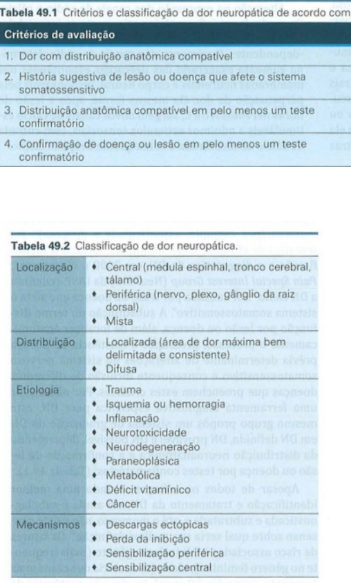 <p>Dor neuropática</p><p>-Anotação extra-</p><p>Introdução:</p><p>A dor neuropática é considerada uma das dores mais excruciantes, causando graves limitações e impacto negativo na qualidade de vida.</p><p>A DN é uma entidade complexa que engloba uma série de condições crônicas.</p><p>A disparidade em relação à prevalência da DN se deve à dificuldade do diagnóstico pela grande variedade de lesões centrais e periféricas, às diferentes condições clínicas associadas.</p><p>Definição de DN pela NeuPSIG e IASP: é a dor causada por lesão ou doença que afeta o sistema somatossensitivo.</p><p>Fatores de risco: mais frequente no gênero feminino; idade, na maioria dos casos é mais frequente em pessoas acima de 60 anos; localização anatômica da lesão. é mais frequente em cirurgias torácicas, pélvicas, mastectomias, mas também em traumatologia e neurocirurgia.</p><p>Mais frequente em populações de baixa renda.</p><p>Dois processos independentes parecem ser os maiores contribuintes para o desenvolvimento da DN:</p><p>Desbalanço entre reações compensatórias do sistema nervoso frente à lesão neural, e características genéticas que protegem e ajudam, ou não na resolução da DN.</p><p>Pode ser classificada de acordo com a sua localização periférica ou mista, de acordo com a sua distribuição em localizada ou difusa, ou ainda de acordo com a sua etiologia e mecanismo fisiopatológico.</p><p>Etiologia da dor neuropática:</p><p>As mais comuns são: neuropatia diabética dolorosa, neuralgia pós-herpética, neuralgia do trigêmeo, dor persistente pós-trauma e pós-operatória, síndrome complexa da dor regional, neuropatia na síndrome da imunodeficiência adquirida, dor neuropática oncológica e dor pós-amputação.</p><p>As síndromes neuropáticas centrais mais comuns são: dor central pós- AVE, dor pós- lesão medular (trauma ou doença) e esclerose múltipla, menos frequentemente ela ocorre na doença de Parkinson, siringomielia e outras doenças degenerativas.</p><p>Fisiopatologia da dor neuropática</p><p>Para que as informações nociceptivas sejam processadas corretamente é necessário a integridade das estruturas funcionais dos axônios e estruturas neuronais centrais.</p><p>A fisiopatologia da DN é heterogênea e complexa, representa um estado de doença neural secundária a alterações de função e anatomia das terminações nervosas, troncos nervosos periféricos, unidades neuronais, vias de condução e do processamento central das informações sensitivas.</p><p>Ocorrem fenômenos de neuroplasticidade anormais ao longo de todo o sistema nervoso, que contribuem para manifestações dolorosas complexas.</p><p>O termo sensibilização periférica indica alterações na excitabilidade do nervo periférico e do gânglio da raiz dorsal, e a sensibilização central compreende as alterações nos neurônios da medula espinhal, sistema descendente modulador da dor e fenômenos de neuroplasticidade nas estruturas cerebrais.</p><p>Diferentes lesões histopatológicas podem ocorrer simultaneamente em um mesmo paciente, o que faz com que a classificação baseada em suas formas de apresentação seja melhor.</p><p>Mecanismo de sensibilização periférica</p><p>A dor neuropática é caracterizada por dor espontânea, ou seja, que não depende de estímulo; hiperalgesia que é a dor exagerada a um estímulo normalmente doloroso e alodínia que é a dor em resposta a um estímulo não doloroso.</p><p>Algumas dessas características ocorrem por alterações nos nociceptores e nervos periféricos lesionados.</p><p>Sensibilização dos nociceptores: ocorre a redução do limiar de ativação dos nociceptores, desencadeada pelos mediadores inflamatórios liberados devido a lesão aguda dos tecidos.</p><p>Estes nociceptores passam a ser estimulados também por estímulos não dolorosos de baixa intensidade( alodínia).</p><p>Descargas ectópicas: a lesão dos nervos periféricos determina redução importante do limiar de ativação neuronal, assim os impulsos elétricos são desencadeados espontaneamente ou por estímulos normalmente não nocivos ( alodinia tátil e hiperalgesia).</p><p>Alterações na expressão dos canais de sódio e cálcio: os mediadores inflamatórios ativam sinais intracelulares dos nociceptores com aumento dos canais voltagem-dependentes.</p><p>O aumento dos canais de sódio determina aumento exagerado das descargas espontâneas nas membranas neuronais e corpo neural, responsáveis pela perpetuação da dor.</p><p>Da mesma forma, após a lesão de fibras nervosas A delta e fibras C, surgem novos canais de cálcio estimulados a mínimos estímulos sensoriais, com a entrada de cálcio na membrana e consequente despolarização.</p><p>Outras alterações periféricas: crescimento neuronal anormal (sprounting ou brotamento) com aumento dos campos receptivos que alimentam a transmissão anormal da dor.</p><p>Além dos neurônios lesados, os neurônios adjacentes, até então íntegros, passam a disparar espontaneamente, que é o mecanismo conhecido como TRANSMISSÃO EFÁTICA.</p><p>Com a lesão neural ocorre ativação dos macrófagos que infiltram nervos e gânglios da raiz dorsal, liberando citocinas pró-inflamatórias, especialmente o fator de necrose tumoral alfa, e consequente atividade ectópica no local.</p><p>Mecanismo central da dor neuropática</p><p>As alterações dos nociceptores durante a inflamação determinam rapidamente alterações de facilitação nas sinapses do corno posterior da medula espinhal.</p><p>A atividade persistente dos nervos lesados é o fator desencadeante da sensibilização central medular e cortical, determinando alterações neuroplásticas nas sinapses e o envolvimento de vários moduladores sinápticos, além de alterações de aminoácidos excitatórios.</p><p>A lesão das fibras nervosas sensoriais, e consequente ativação do fator de crescimento neuronal, estimula o brotamento anorm