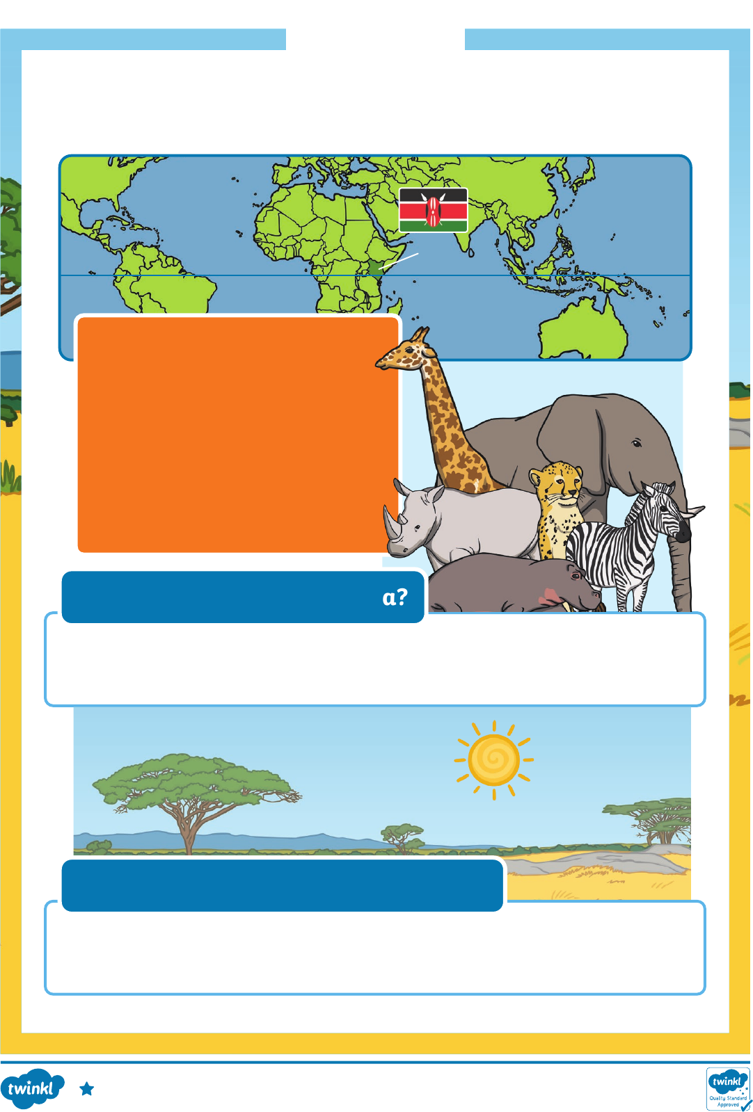 <p>Kenya</p><p>Kenya is a country in Africa. It is on the equator. Kenya is about</p><p>the same size as France.</p><p>Facts About Kenya</p><p>Capital - Nairobi</p><p>Population - 55 million people</p><p>Official Languages - Swahili</p><p>and English</p><p>Flag - It has a shield and two</p><p>spears on it.</p><p>EquatorEquator</p><p>KenyaKenya</p><p>In Kenya you can find rhinos, elephants, hippos, lions, giraffes,</p><p>zebras and cheetahs. Look out for crocodiles!</p><p>What Animals Live in Kenya?</p><p>Kenya is mostly tropical. It stays hot all year. It has wet and</p><p>dry seasons. The desert areas have less rain.</p><p>What Is the Weather Like in Kenya?</p><p>visit twinkl.com</p><p>https://www.twinkl.co.uk/resources/reading/reading-comprehension-worksheets/reading-comprehension-worksheets-around-the-world</p><p>Questions</p><p>1. Where is Kenya? Tick one.</p><p>in Africa</p><p>in Europe</p><p>in Asia</p><p>2. Kenya is about the same size as which country? Tick one.</p><p>Spain</p><p>Italy</p><p>France</p><p>3. What is the population of Kenya? Tick one.</p><p>30 million people</p><p>55 million people</p><p>100 million people</p><p>4. Which animal can you find in Kenya? Tick one.</p><p>rhino</p><p>penguin</p><p>kangaroo</p><p>5. What is the weather like in Kenya? Tick one.</p><p>mostly snowy</p><p>mostly tropical</p><p>mostly cold</p><p>Kenya</p><p>visit twinkl.com</p><p>https://www.twinkl.co.uk/resources/reading/reading-comprehension-worksheets/reading-comprehension-worksheets-around-the-world</p><p>Answers</p><p>1. Where is Kenya? Tick one.</p><p>in Africa</p><p>in Europe</p><p>in Asia</p><p>2. Kenya is about the same size as which country? Tick one.</p><p>Spain</p><p>Italy</p><p>France</p><p>3. What is the population of Kenya? Tick one.</p><p>30 million people</p><p>55 million people</p><p>100 million people</p><p>4. Which animal can you find in Kenya? Tick one.</p><p>rhino</p><p>penguin</p><p>kangaroo</p><p>5. What is the weather like in Kenya? Tick one.</p><p>mostly snowy</p><p>mostly tropical</p><p>mostly cold</p><p>Kenya</p><p>visit twinkl.com</p><p>https://www.twinkl.co.uk/resources/reading/reading-comprehension-worksheets/reading-comprehension-worksheets-around-the-world</p><p>Kenya</p><p>Kenya is a country in the continent of Africa. It is on the equator.</p><p>It is next to Uganda, South Sudan, Somalia, Ethiopia, Tanzania</p><p>and the Indian Ocean.</p><p>Key Facts</p><p>The capital city of Kenya is Nairobi. About 55 million people live in Kenya.</p><p>This is known as the population. People in Kenya mainly speak Swahili</p><p>and English. Telling stories and music are very important in Kenya.</p><p>EquatorEquator</p><p>KenyaKenya</p><p>Kenya is famous for the ‘Big Five’. These are large animals including the</p><p>rhino, elephant, lion, leopard and buffalo. You can also find lots of zebras,</p><p>cheetahs and hippos. Many animals live in the forests here that you can’t</p><p>find anywhere else in the world. Watch out for crocodiles!</p><p>What Animals Live in Kenya?</p><p>Kenya has a tropical climate. It is warm all year round but there is a lot</p><p>of rain between March and June. The coldest month is July and the hottest</p><p>month is February.</p><p>What Is The Weather Like In Kenya?</p><p>Kenyans eat lots of different foods like fish, stews, yams and boiled</p><p>potatoes. Tea and mursik are popular drinks. Mursik is made from sour milk.</p><p>What Do People Eat In Kenya?</p><p>visit twinkl.com</p><p>https://www.twinkl.co.uk/resources/reading/reading-comprehension-worksheets/reading-comprehension-worksheets-around-the-world</p><p>Kenya</p><p>Questions</p><p>1. Kenya is next to which ocean? Tick one.</p><p>Pacific Ocean</p><p>Indian Ocean</p><p>Arctic Ocean</p><p>2. What do people in Kenya mainly speak? Tick one.</p><p>Swahili and English</p><p>French and English</p><p>English and German</p><p>3. Draw three lines to match the beginning of the sentence to the</p><p>correct ending.</p><p>Kenya is</p><p>famous for...</p><p>live in the forests</p><p>here that you can’t</p><p>find anywhere else in</p><p>the world.</p><p>You can also find</p><p>lots of... the ‘Big Five’.</p><p>Many animals... zebras, cheetahs</p><p>and hippos.</p><p>visit twinkl.comPage 1 of 2</p><p>https://www.twinkl.co.uk/resources/reading/reading-comprehension-worksheets/reading-comprehension-worksheets-around-the-world</p><p>4. Find and copy one word that means the same as ‘liked a lot’?</p><p>5. Fill in the missing word.</p><p>Kenyans eat lots of different foods like fish, stews, yams and</p><p>potatoes.</p><p>Kenya - Questions</p><p>visit twinkl.comPage 2 of 2</p><p>https://www.twinkl.co.uk/resources/reading/reading-comprehension-worksheets/reading-comprehension-worksheets-around-the-world</p><p>Answers</p><p>1. Kenya is next to which ocean? Tick one.</p><p>Pacific Ocean</p><p>Indian Ocean</p><p>Arctic Ocean</p><p>2. What do people in Kenya mainly speak? Tick one.</p><p>Swahili and English</p><p>French and English</p><p>English and German</p><p>3. Draw three lines to match the beginning of the sentence to the</p><p>correct ending.</p><p>Kenya is</p><p>famous for...</p><p>live in the forests</p><p>here that you can’t</p><p>find anywhere else in</p><p>the world.</p><p>You can also find</p><p>lots of... the ‘Big Five’.</p><p>Many animals... zebras, cheetahs</p><p>and hippos.</p><p>Kenya</p><p>visit twinkl.comPage 1 of 2</p><p>https://www.twinkl.co.uk/resources/reading/reading-comprehension-worksheets/reading-comprehension-worksheets-around-the-world</p><p>4. Find and copy one word that means the same as ‘liked a lot’?</p><p>popular</p><p>5. Fill in the missing word.</p><p>Kenyans eat lots of different foods like fish, stews, yams and</p><p>boiled potatoes.</p><p>Kenya - Answers</p><p>visit twinkl.com</p><p>https://www.twinkl.co.uk/resources/reading/reading-comprehension-worksheets/reading-comprehension-worksheets-around-the-world</p><p>Kenya</p><p>Kenya is a country in the conti