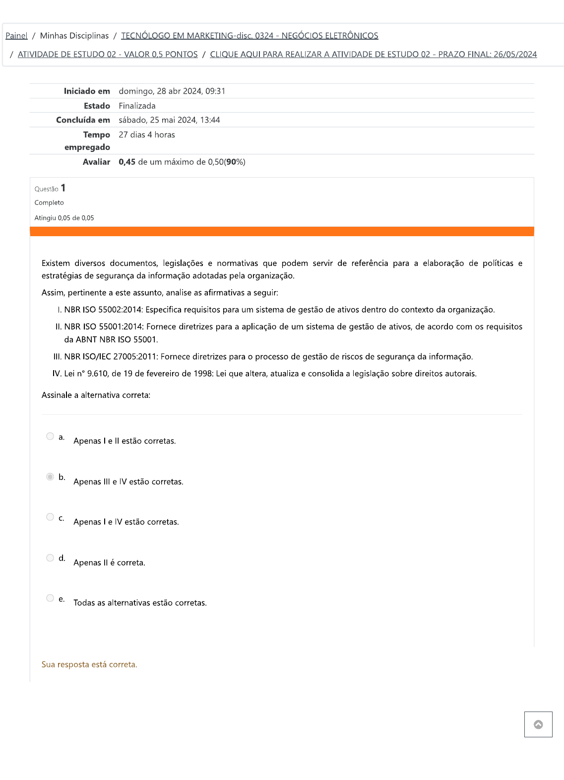 <p>Painel / Minhas Disciplinas / TECNÓLOGO EM MARKETING-disc. 0324 - NEGÓCIOS ELETRÔNICOS / ATIVIDADE DE ESTUDO 02 VALOR 0,5 PONTOS / CLIQUE AQUI PARA REALIZAR A ATIVIDADE DE ESTUDO 02 PRAZO FINAL: 26/05/2024 Iniciado em domingo, 28 abr 2024, 09:31 Estado Finalizada Concluída em sábado, 25 mai 2024, 13:44 Tempo 27 dias 4 horas empregado Avaliar 0,45 de um máximo de 0,50(90%) Questão 1 Completo Atingiu 0,05 de 0,05 Existem diversos documentos, legislações e normativas que podem servir de referência para a elaboração de políticas e estratégias de segurança da informação adotadas pela organização. Assim, pertinente a este assunto, analise as afirmativas a seguir I. NBR ISO 55002:2014: Especifica requisitos para um sistema de gestão de ativos dentro do contexto da organização. II. NBR ISO 55001:2014: Fornece diretrizes para a aplicação de um sistema de gestão de ativos, de acordo com os requisitos da ABNT NBR ISO 55001. III. NBR ISO/IEC 27005:2011: Fornece diretrizes para o processo de gestão de riscos de segurança da informação. IV. Lei n° 9.610, de 19 de fevereiro de 1998: Lei que altera, atualiza e consolida a legislação sobre direitos autorais. Assinale a alternativa correta: a. Apenas e II estão corretas. b. Apenas III e IV estão corretas. C. Apenas e IV estão corretas. d. Apenas é correta. e. Todas as alternativas estão corretas. Sua resposta está correta.</p><p>Questão 2 Completo Atingiu 0,05 de 0,05 É definida como uma circunstância, condição ou evento com potencial de causar danos em dados ou recursos de rede, na forma de destruição, exposição, modificação de dados, negação de serviço, fraude, perda ou abuso. Tal afirmação se refere a: Assinale a alternativa correta: a. Conhecimento. b. Ameaça de segurança. C. Informação. d. Segurança da informação. e. Dados. Sua resposta está correta.</p><p>Questão 3 Completo Atingiu 0,05 de 0,05 Fornece orientação técnica detalhada sobre como as organizações podem definir um nível apropriado de mitigação de risco, empregando uma abordagem comprovada e consistente para o planejamento, design, documentação e implementação de segurança de armazenamento de dados. Tal afirmação se diz respeito qual Referência Legal? Assinale a alternativa correta: a. ISO 9001: 2015. b. ISO 14001: 2015. C. Lei n° 12.965, de 23 de abril de 2014 (Marco Civil da Internet) d. NBR ISO 55001:2014. e. ISO / IEC 27040: 2015. Sua resposta está correta.</p><p>Questão 4 Completo Atingiu 0,00 de 0,05 A Segurança da Informação não é restrita somente a informações ou dados eletrônicos. Esse conceito pode ser ampliado a todo tipo de recursos que uma organização considera importante manter protegidos para seu pleno funcionamento, como itens de hardware e softwares, capital intelectual, marcas, patentes, etc. Sendo assim, analise as afirmatSendo assim, analise as afirmativas abaixo e julgue com "V" para verdadeiro e "F" para falso: ( ) Informação pode ser considerada, todo tipo de registro ou fatos brutos que ainda não foram tratados e/ou processados e são representados por meio de números, letras, gráficos, som, entre outros, que podem ser armazenados, medidos e observados. ( ) Os dados são sequências de fatos brutos, resultantes de eventos ocorridos nas organizações ou no ambiente físico, antes de serem organizados e estruturados de forma que as pessoas possam entendê-los e utilizá-los. ( ) O dado é a matéria-prima do processo de tomada de decisões nos negócios. ( ) Dado é o resultado do processamento, manipulação e organização de dados de tal forma que represente uma modificação (quantitativa ou qualitativa) no conhecimento de uma pessoa ou organização. Assinale a alternativa correta: a. F, V, F, F. b. F, F, F, F. C. F, F, V, V. d. V, V, V, V. e. V, F, F, V. Sua resposta está incorreta.</p><p>Questão 5 Completo Atingiu 0,05 de 0,05 Os avanços tecnológicos a cada dia provocaram enormes mudanças nos consumidores, nos mercados e no próprio marketing. Na tentativa de acompanhar o impacto dessas mudanças no marketing, autores como Kotler, Kartajaya e Setiawan explicam que ao longo dos anos, o próprio conceito de marketing vem evoluindo. Segundo os autores, esse conceito se transformou e passou por quatro fases, às quais chamaram de Marketing 1.0, 2.0, 3.0 e 4.0. Deste modo, relacione a coluna da direita com a da esquerda: 1. Marketing 1.0 ( ) no início dos anos 2000, temos o surgimento do marketing orientado para os valores. Em um mundo cada vez mais complexo e confuso, os consumidores estão buscando empresas que abordem suas mais profundas necessidades de justiça social, econômica e ambiental em sua missão, visão e valores. 2. Marketing 2.0 ( ) orientado ao produto tem seu início durante a era industrial. Nesse período, o marketing dizia respeito a vender os produtos da fábrica a todos que quisessem comprá-los 3. Marketing 3.0 ( ) na atual era digital, mediada pelas novas tecnologias, o processo de compra torna-se mais pessoal, e a chamada "cadeia de valor" torna-se cada vez mais horizontal, com menos intermediários. 4. Marketing 4.0 ( ) orientado para o cliente, surgiu na atual era da informação - cujo núcleo é a tecnologia da informação, o que não é tão simples como fabricar e distribuir produtos. Assinale a alternativa correta: a. 3, 4, 1, 2. b. 4, 1, 2, 3. C. 1, 4, 2, 3. d. 1, 2, 3, 4. e. 3, 1, 4, 2. Sua resposta está correta.</p><p>Questão 6 Completo Atingiu 0,05 de 0,05 Uma das principais funções do marketing é o estudo do comportamento do consumidor para o desenvolvimento de estratégias para influenciar em suas decisões de compra, seja on-line ou off-line. Sendo assim, o processo de compra, usualmente, é dividido em cinco estágios. Quanto a esses estágios, analise as afirmativas a seguir: I. Busca de informações: É a primeira etapa do processo, onde o consumidor reconhece a necessidade de adquirir um determinado produto ou 