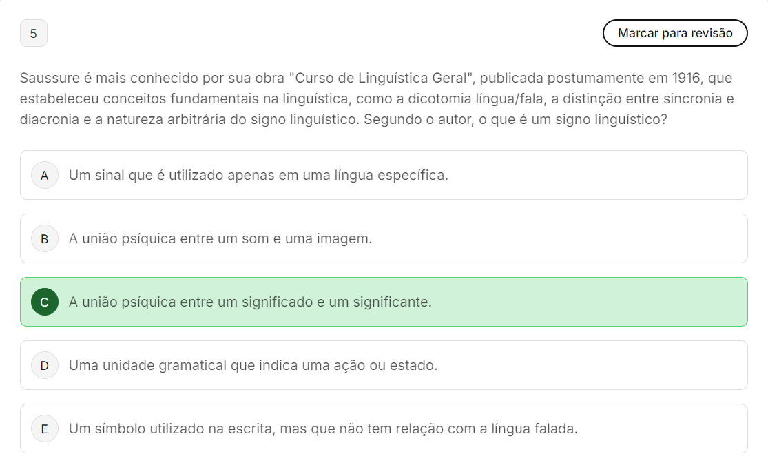 <p>5 Marcar para revisão Saussure é mais conhecido por sua obra "Curso de Linguística Geral", publicada postumamente em 1916, que estabeleceu conceitos fundamentais na linguística, como a dicotomia língua/fala, a distinção entre sincronia e diacronia e a natureza arbitrária do signo linguístico. Segundo autor, que é um signo linguístico? A Um sinal que é utilizado apenas em uma língua específica. B A união entre um som e uma imagem. C A união psíquica entre um significado e um significante. D Uma unidade gramatical que indica uma ação ou estado. E Um símbolo utilizado na escrita, mas que não tem relação com a língua falada.</p>