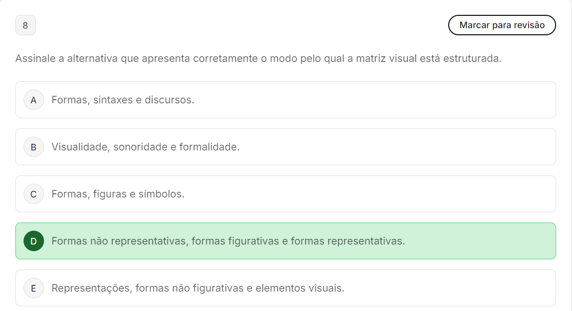<p>8 Marcar para revisão Assinale a alternativa que apresenta corretamente o modo pelo qual a matriz visual está estruturada. A Formas, sintaxes e discursos. B Visualidade, sonoridade e formalidade. C Formas, figuras e D Formas não representativas, formas figurativas e formas representativas. E Representações, formas não figurativas e elementos visuais.</p>