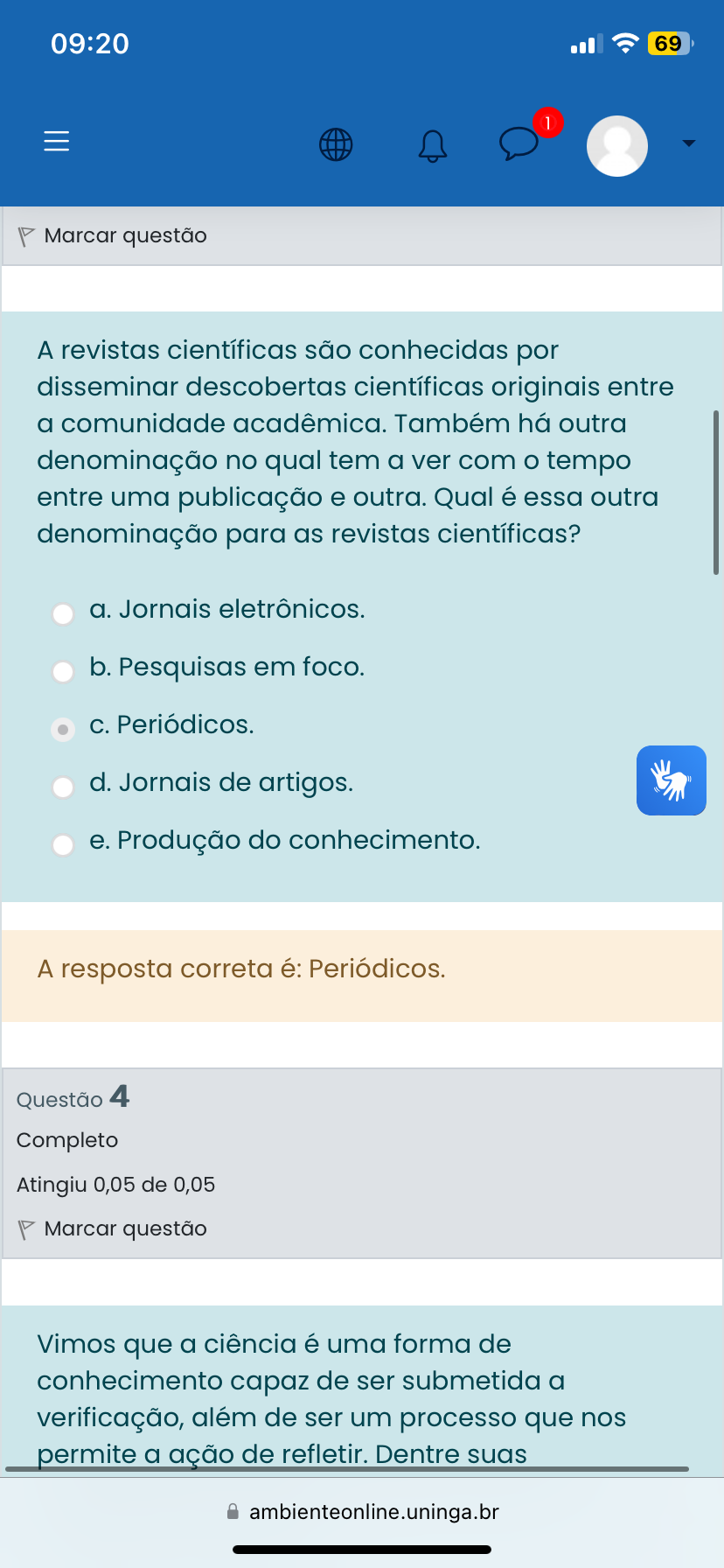 <p>09:20 69 1 Marcar questão A revistas científicas são conhecidas por disseminar descobertas científicas originais entre a comunidade acadêmica. Também há outra denominação no qual tem a ver com o tempo entre uma publicação e outra. Qual é essa outra denominação para as revistas científicas? a. Jornais eletrônicos. b. Pesquisas em foco. C. Periódicos. d. Jornais de artigos. e. Produção do conhecimento. A resposta correta é: Periódicos. Questão 4 Completo Atingiu 0,05 de 0,05 Marcar questão Vimos que a ciência é uma forma de conhecimento capaz de ser submetida a verificação, de ser um processo que nos permite a ação de refletir. Dentre suas ambienteonline.uninga.b</p>