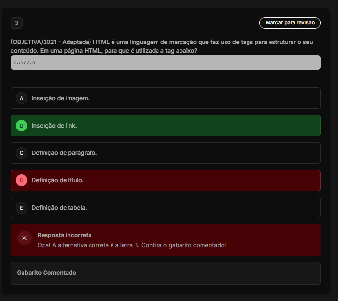 <p>3 Marcar para revisão (OBJETIVA/2021 - Adaptada) HTML é uma linguagem de marcação que faz uso de tags para estruturar O seu conteúdo. Em uma página HTML, para que é utilizada a tag abaixo? <a></a> A Inserção de imagem. B Inserção de link. C Definição de parágrafo. D Definição de título. E Definição de tabela. Resposta incorreta Opa! A alternativa correta é a letra Confira O gabarito comentado! Gabarito Comentado</p>