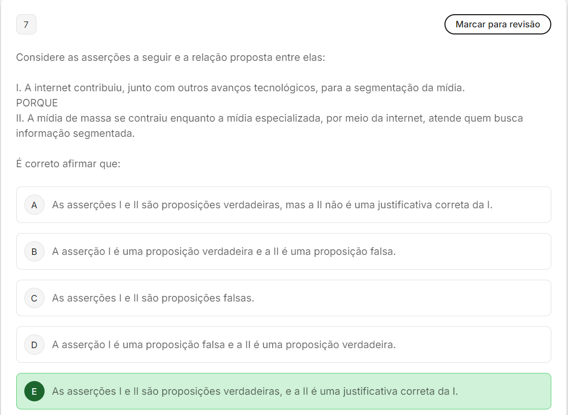 <p>7 Marcar para revisão Considere as asserções a seguir e a relação proposta entre elas: I. A internet contribuiu, junto com outros avanços tecnológicos, para a segmentação da mídia. PORQUE II. A mídia de massa se contraiu enquanto a mídia especializada, por meio da internet, atende quem busca informação segmentada. É correto afirmar que: A As asserções e são proposições verdadeiras, mas a não é uma justificativa correta da I. B A asserção I é uma proposição verdadeira e a II é uma proposição falsa. C As asserções e são proposições falsas. D A asserção é uma proposição falsa e a II é uma proposição verdadeira. E As asserções I e são proposições verdadeiras, e a II é uma justificativa correta da</p>