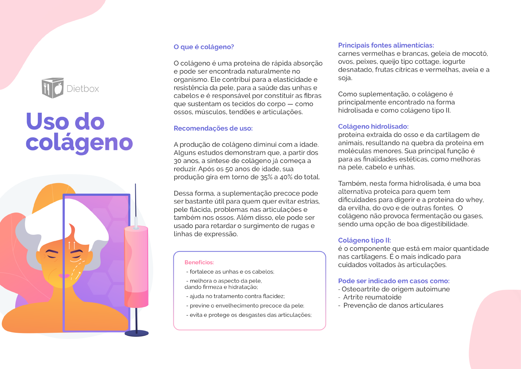 <p>que é colágeno? Principais fontes alimentícias: carnes vermelhas e brancas, geleia de mocoto, colágeno é uma proteína de rápida absorção ovos, peixes, queijo tipo cottage, iogurte e pode ser encontrada naturalmente no desnatado, frutas cítricas e vermelhas, aveia e a organismo. Ele contribui para a elasticidade e soja. Dietbox resistência da pele, para a saúde das unhas e cabelos e é responsável por constituir as fibras Como suplementação, o colágeno é que sustentam os tecidos do corpo como principalmente encontrado na forma ossos, músculos, tendões e articulações. hidrolisada e como colágeno tipo II. Uso do Recomendações de uso: Colágeno hidrolisado: proteína extraída do osso e da cartilagem de colágeno A produção de colágeno diminui com a idade. animais, resultando na quebra da proteína em Alguns estudos demonstram que, a partir dos menores. Sua principal função é 30 anos, a síntese de colágeno já começa a para as finalidades estéticas, como melhoras reduzir. Após os 50 anos de idade, sua na pele, cabelo e unhas. produção gira em torno de 35% a 40% do total. Também, nesta forma hidrolisada, é uma boa Dessa forma, a suplementação precoce pode alternativa proteica para quem tem ser bastante útil para quem quer evitar estrias, dificuldades para digerir e a proteína do whey, pele flácida, problemas nas articulações e da ervilha, do ovo e de outras fontes. também nos ossos. Além disso, ele pode ser colágeno não provoca fermentação ou gases, usado para retardar surgimento de rugas e sendo uma opção de boa digestibilidade. linhas de expressão. Colágeno tipo II: é o componente que está em maior quantidade nas cartilagens. É o mais indicado para Benefícios: cuidados voltados às articulações. fortalece as unhas e os cabelos; melhora aspecto da Pode ser indicado em casos como: dando firmeza e hidratação; Osteoartrite de origem autoimune ajuda no tratamento contra flacidez; Artrite reumatoide previne envelhecimento precoce da pele; Prevenção de danos articulares evita e protege os desgastes das articulações;</p>