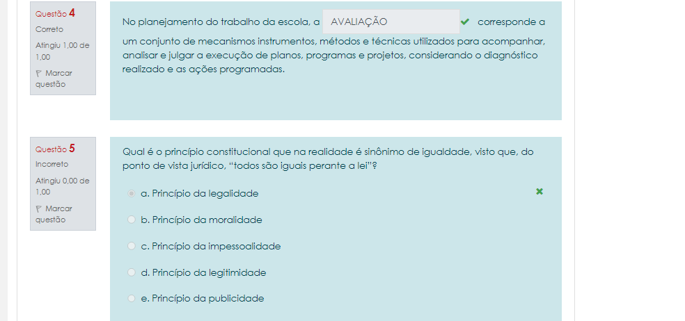 <p>Questão 4 No planejamento do trabalho da escola, AVALIAÇÃO corresponde a Correto Atingiu 1,00 de um conjunto de mecanismos instrumentos, métodos e técnicas utilizados para acompanhar, 1,00 analisar e julgar a execução de planos, programas e projetos, considerando diagnóstico P Marcar realizado e as ações programadas. questão Questão 5 Qual é princípio constitucional que na realidade é sinônimo de igualdade, visto que, do Incorreto ponto de vista "todos são iguais perante a lei"? Atingiu 0.00 de 1.00 a. Princípio da legalidade x P Marcar questão b. Princípio da moralidade Princípio da impessoalidade d. Princípio legitimidade e. Princípio da publicidade</p>