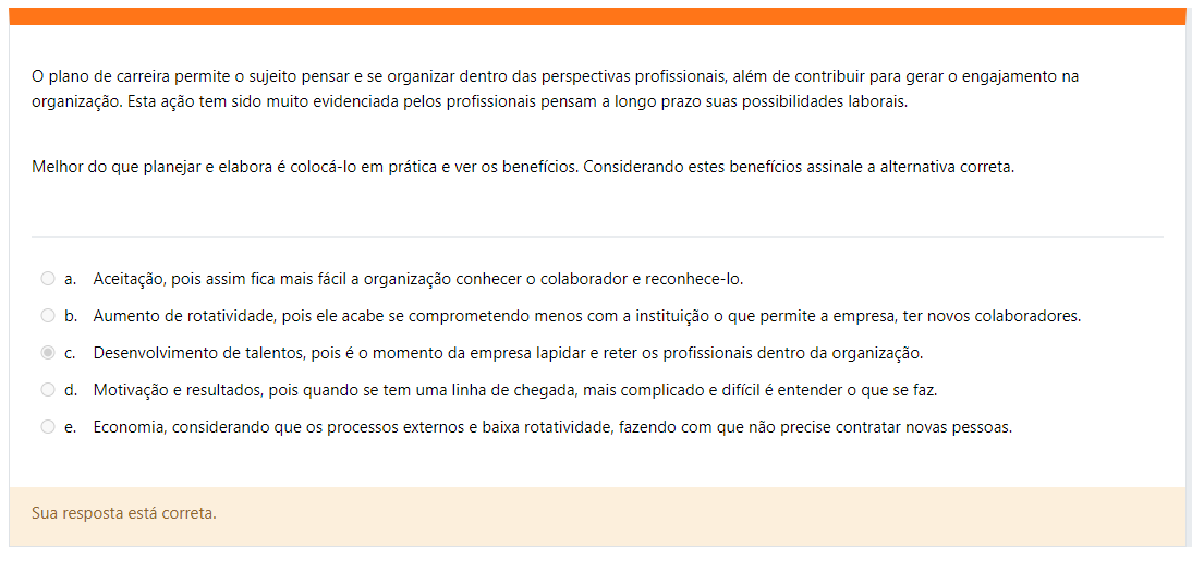 <p>plano de carreira permite sujeito pensar e se organizar dentro das perspectivas profissionais, além de contribuir para gerar engajamento na organização. Esta ação tem sido muito evidenciada pelos profissionais pensam a longo prazo suas possibilidades laborais. Melhor do que planejar e elabora é colocá-lo em prática e ver os benefícios. Considerando estes benefícios assinale a alternativa correta. a. Aceitação, pois assim fica mais fácil a organização conhecer colaborador e reconhece-lo. b. Aumento de rotatividade, pois ele acabe se comprometendo menos com a instituição que permite a empresa, ter novos colaboradores. C. Desenvolvimento de talentos, pois é momento da empresa lapidar e reter os profissionais dentro da organização. d. Motivação e resultados, pois quando se tem uma linha de chegada, mais complicado e é entender que se faz. e. Economia, considerando que os processos externos e baixa rotatividade, fazendo com que não precise contratar novas pessoas. Sua resposta está correta.</p>