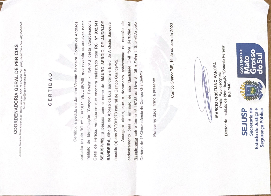 <p>COORDENADORIA GERAL DE PERÍCIAS Avenida Senador Filinto Bairro CEP: (067)3345-6704 - (67)3345-6740 E-mail: br CERTIDÃO a pedido de Janaina Vicente Bandeira Gomes de Andrade, portador (a) do RG 2.047.811 que revendo os arquivos neste Instituto de Identificação "Gonçalo Pereira" - IIGP/MS desta Coordenadoria Geral de Perícia, verificou-se que encontra cadastrado com RG. N° 932.341 a pessoa com nome de MAURO SERGIO DE ANDRADE BANDEIRA, filho (a) de Afonso da Luz Bandeira e Elerci de Andrade Bandeira, nascido (a) aos 27/03/1973 natural de Campo Grande/MS. Asseguro ainda, que documento apresentado na ocasião do cadastramento para a emissão de sua Identidade Civil fora Certidão de Nascimento sob termo 18738 do Livro A-135 e Folha 110, emitida pelo Cartório de Circunstância de Campo Grande/MS Por ser verdade, firmo a presente. Campo Grande/MS, 19 de outubro de 2023. MARCIO CRISTIANO PAROBA Perito Papiloscopista Diretor do Instituto de Identificação "Gonçalo Pereira" IIGP/MS GOVERNO DE SEJUSP Mato Secretaria de Grosso Estado de Justiça e Segurança Pública doSul</p>