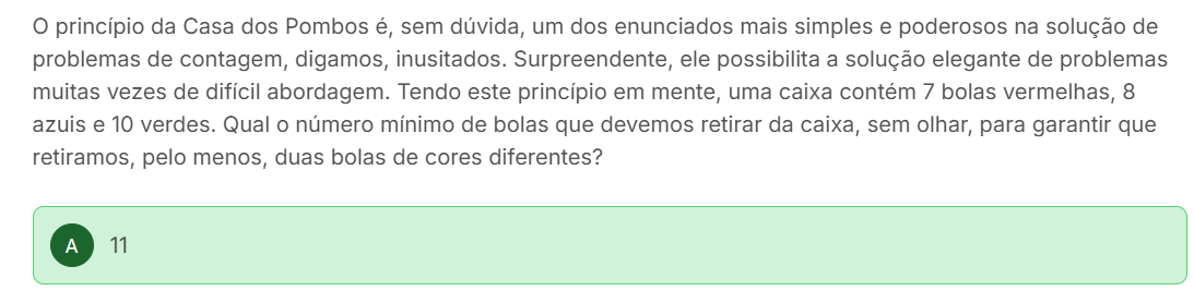 <p>princípio da Casa dos Pombos é, sem dúvida, um dos enunciados mais simples e poderosos na solução de problemas de contagem, digamos, inusitados. Surpreendente, ele possibilita a solução elegante de problemas muitas vezes de difícil abordagem. Tendo este princípio em mente, uma caixa contém 7 bolas vermelhas, 8 azuis e 10 verdes. Qual número mínimo de bolas que devemos retirar da caixa, sem olhar, para garantir que retiramos, pelo menos, duas bolas de cores diferentes? A 11</p>