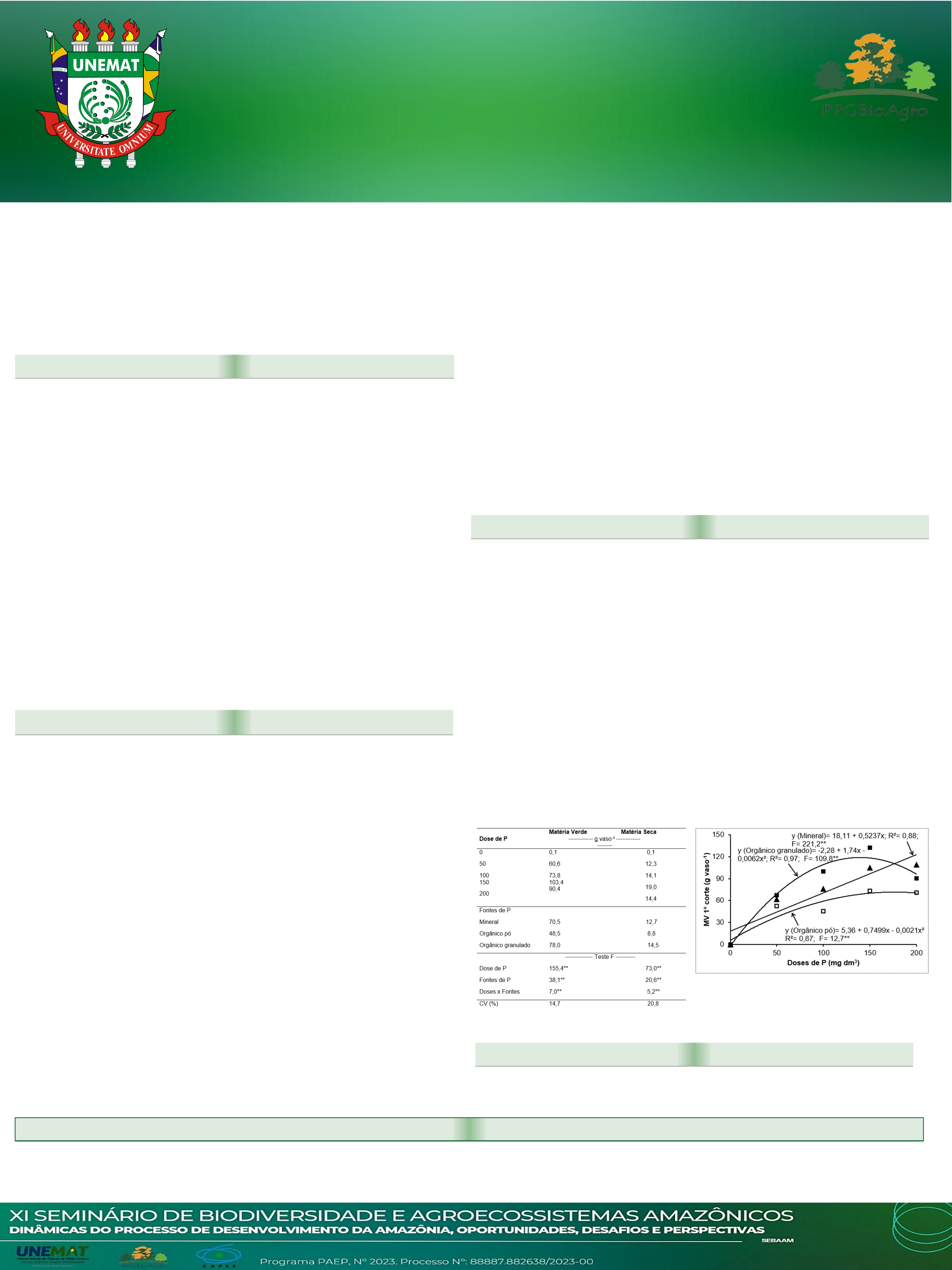 <p>FORMIGONI1, Jasseliny Aparecida Branco de Moraes; NUNES1, Maria Inês de Souza; JUNIOR1, Antônio Martins de Souza; VOLTOLINI1, Natan Gabriel Eggert, CARDOSO1; Sabrina Machado Dela Justina; CAIONE2, Gustavo.</p><p>INTRODUÇÃO</p><p>MATERIAL E MÉTODOS</p><p>RESULTADOS E DISCUSSÃO</p><p>CONCLUSÕES</p><p>REFERÊNCIAS BIBLIOGRÁFICAS</p><p>EFICIÊNCIA DE ADUBO FOSFATADO ORGÂNICO GRANULADO E SEM GRANULAR NA ADUBAÇÃO DE PASTAGEM</p><p>Alguns nutrientes essenciais para produção agrícola de alta eficiência como o fósforo, tem suas reservas mundiais estimadas a entrar em escassez no próximo século, assim temos a perspectiva de crise dos fertilizantes que assola o mundo todo. Com este cenário busca-se alternativas ao uso tradicional de adubos fosfatados minerais e maior conhecimento acerca do comportamento do nutriente no solo aplicado em diferentes fontes, visando manter a sustentabilidade do sistema Caione et al. (2013). O fósforo é considerado um dos macronutrientes responsáveis por desempenhar papéis fundamentais na fisiologia das plantas como no metabolismo vegetal, na estrutura das plantas e principalmente na transferência de energia, ainda atua na fotossíntese e na respiração celular (BATISTA et al., 2018). Com este trabalho se objetivou avaliar a eficiência agronômica de um adubo fosfatado orgânico granulado e sem granular em comparação ao MAP na adubação de pastagem..</p><p>O experimento teve seu desenvolvimento realizado na Universidade do Estado de Mato Grosso (UNEMAT), Campus 1. Foi separado em três etapas, onde na primeira etapa foi realizada a coleta dos materiais e processamento. A segunda etapa contou com a formulação, fabricação e granulação do adubo orgânico fosfatado, assim como a caracterização dele através de análises físicas e químicas. A terceira etapa utilizou de experimentos realizados com plantas em casa de vegetação com vasos em bancadas de madeira, a fim de avaliar a eficiência agronômica dos adubos produzidos. Ao fim se procurou a comprovação da viabilidade técnica, e agronômica do adubo fabricado nesta pesquisa, utilizando ossos de animais abatidos em frigoríficos e comercializados na região e cama de frango de granjas aviarias. Na montagem do experimento utilizou-se vasos de 4 litros preenchidos com LATOSSOLO VERMELHO Distrófico. Os adubos avaliados foram adubo orgânico farelado (16,2% de P²O5 total), adubo orgânico granulado (16,2% de P2O5 total) e MAP (52 de P2O5 total); sendo aplicado as doses de 50; 100; 150 e 200 mg de P que equivalem a</p><p>Na figura 1, observa-se que, para a matéria verde do primeiro corte, houve interação significativa entre os fatores (fontes e doses de P), com diferença significativa entre as médias das fontes. Para a fonte Orgânico Granulado (OG), houve um aumento quadrático, atingindo o máximo com a dose de 140 mg dm3 de P. Da mesma forma, para a fonte Orgânico em Pó (OP), observou-se um comportamento quadrático, com a maior produtividade ocorrendo na dose de 178 mg dm3 de P. A MS (Matéria seca) do primeiro corte apresentou as mesmas tendências, tendo a maior média de MS com o OG, ouve também interação significativa entre as variáveis analisadas (Figura 2). O comportamento para as três fontes de adubo se apresentou de forma quadrática, tendo seus pontos de máxima produtividade nas doses de: 124 mg dm3; 153 mg dm3; 168 mg dm3 de P, para OG, OP e AM respectivamente.</p><p>Todas as fontes de P proporcionaram aumento de produtividade, porém com o fosfato orgânico granulado obteve-se maiores incrementos de biomassa de forragem.</p><p>Seminário de Biodiversidade e Agroecossistemas Amazônicos – Alta Floresta – MT</p><p>13 a 16 De Maio De 2024</p><p>DINÂMICAS DO PROCESSO DE DESENVOLVIMENTO DA AMAZÔNIA, OPORTUNIDADES, DESAFIOS E PERSPECTIVAS</p><p>Figura 1: Valores médios de doses, fontes e Análise estatística.</p><p>Fonte: os autores</p><p>XI SEBAAM</p><p>BATISTA, M. A; INOUE, T.T.; NETO, M.E.; MUNIZ, A.S. Princípios de fertilidade do solo, adubação e nutrição mineral. In, 2018.</p><p>CAIONE, G.; FERNANDES, F. M.; LANGE, A. Efeito residual de fontes de fósforo nos atributos químicos do solo, nutrição e produtividade de biomassa da cana-de-açúcar. Revista Brasileira de Ciências Agrárias, v. 8, n. 2, p. 189–196, 2013.</p><p>114,5; 229; 343,5; 458 mg dm3 de P2O5 respectivamente da dose recomendada de P.Utilizou-se o delineamento experimental inteiramente casualizado com 12 tratamentos e 3 repetições. Os dados coletados foram submetidos a análise de variância, para efeitos significativos foi aplicado teste de médias, o teste de Tukey, para fonte de variação qualitativa e regressão polinomial para fonte de variação quantitativa, utilizando o programa estatístico SISVAR.</p><p>A MS (Matéria seca) do primeiro corte apresentou as mesmas tendências, tendo a maior média de MS com o OG, ouve também interação significativa entre as variáveis analisadas (Tabela 1). O comportamento para as três fontes de adubo se apresentou de forma quadrática, tendo seus pontos de máxima produtividade nas doses de: 124 mg dm3; 153 mg dm3; 168 mg dm3 de P, para OG, OP e AM respectivamente (Figura 12).</p><p>Figura 2: Produtividade de MV de acordo com fonte e dose 1° corte.</p><p>Fonte: os autores</p><p>image1.jpg</p><p>image2.png</p><p>image3.png</p><p>image4.png</p><p>image5.png</p><p>image6.png</p>
