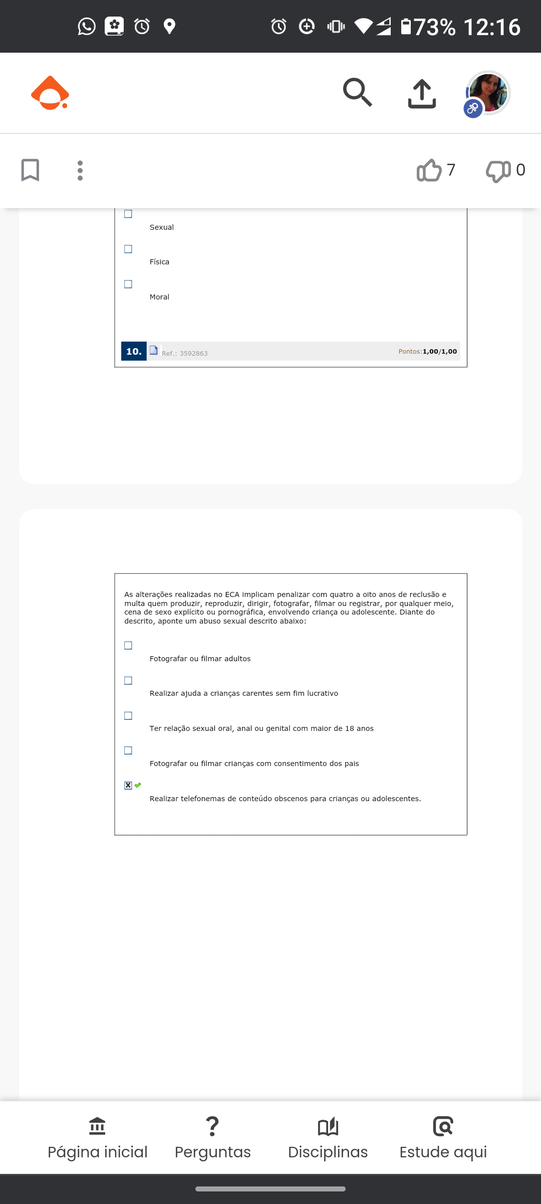<p>L 1 12:16 : 7 0 Sexual Física Moral 10. Ref. 3592863 Pontos:1,00/1,00 As alterações realizadas no ECA implicam penalizar com quatro a oito anos de reclusão e multa quem produzir, reproduzir, dirigir, fotografar, filmar ou registrar, por qualquer meio, cena de sexo explícito ou pornográfica, envolvendo criança ou adolescente. Diante do descrito, aponte um abuso sexual descrito abaixo: Fotografar ou filmar adultos Realizar ajuda a crianças carentes sem fim lucrativo Ter relação sexual oral, anal ou genital com maior de 18 anos Fotografar ou filmar crianças com consentimento dos pais Realizar telefonemas de conteúdo obscenos para crianças ou III ? Q Página inicial Perguntas Disciplinas Estude aqui</p>