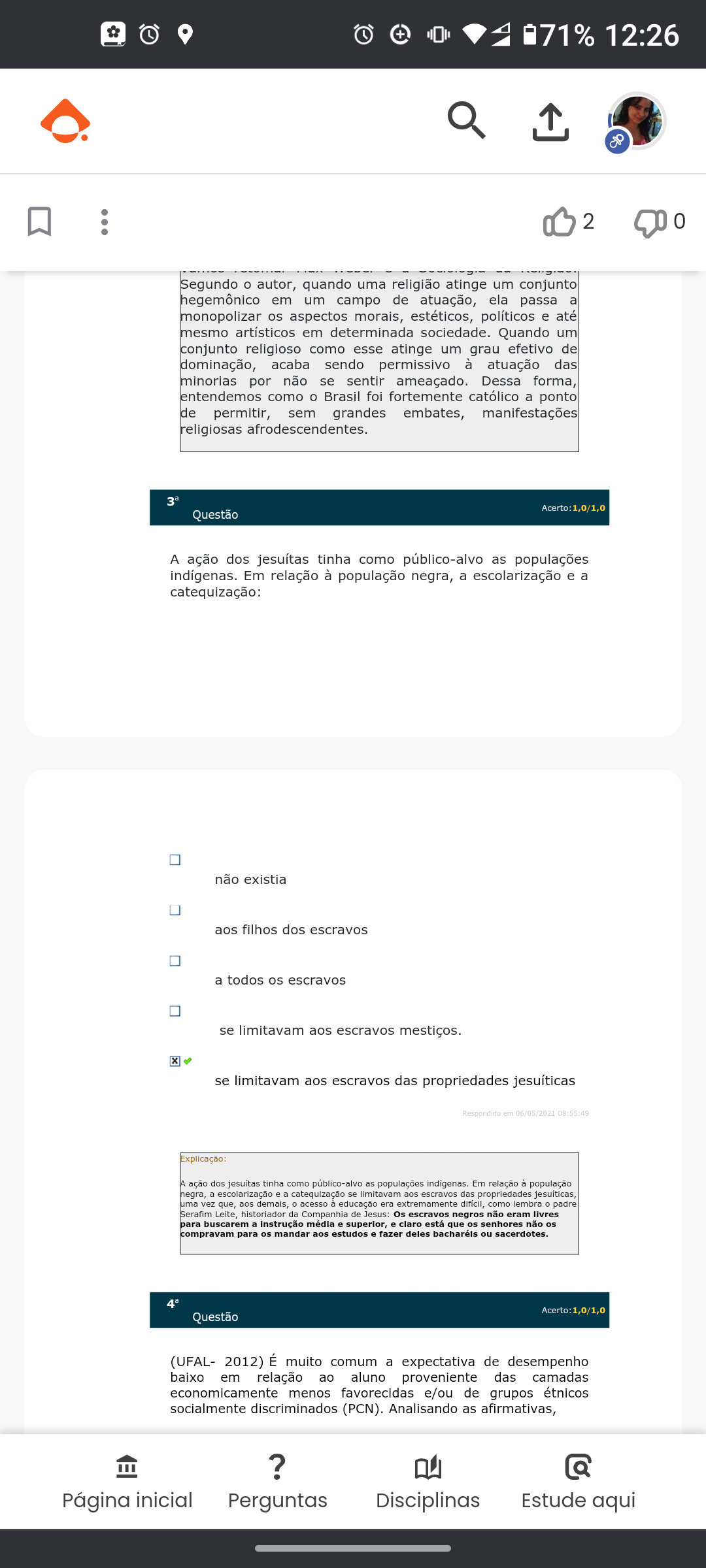 <p>L 071% 12:26 2 0 Segundo o autor, quando uma religião atinge um conjunto hegemônico em um campo de atuação, ela passa a os aspectos morais, estéticos, políticos e até mesmo artísticos em determinada sociedade. Quando um conjunto religioso como esse atinge um grau efetivo de dominação, acaba sendo permissivo à atuação das minorias por não se sentir ameaçado. Dessa forma, entendemos como o Brasil foi fortemente católico a ponto de permitir, sem grandes embates, manifestações religiosas afrodescendentes. Acerto:1 ,0/1,0 Questão A ação dos tinha como público-alvo as populações indígenas. Em relação à população negra, a escolarização e a catequização: não existia aos filhos dos escravos a todos os escravos se limitavam aos escravos se limitavam aos escravos das propriedades jesuíticas Respondido em 06/05/2021 08:55:49 Explicação: A ação dos jesuitas tinha como público-alvo as populações Em relação à população negra, a escolarização a catequização se limitavam aos escravos das propriedades uma vez que, aos demais, acesso à educação era extremamente como lembra padre Serafim historiador da Companhia de Jesus: Os escravos negros não eram livres para buscarem a média e superior, e claro está que os senhores não os compravam para os mandar aos estudos e fazer deles ou sacerdotes. Acerto:1,0/1,0 Questão (UFAL- 2012) É muito comum a expectativa de desempenho baixo em relação ao aluno proveniente das camadas economicamente menos favorecidas e/ou de grupos étnicos socialmente discriminados (PCN). Analisando as afirmativas, ? Q Página inicial Perguntas Disciplinas Estude aqui</p>