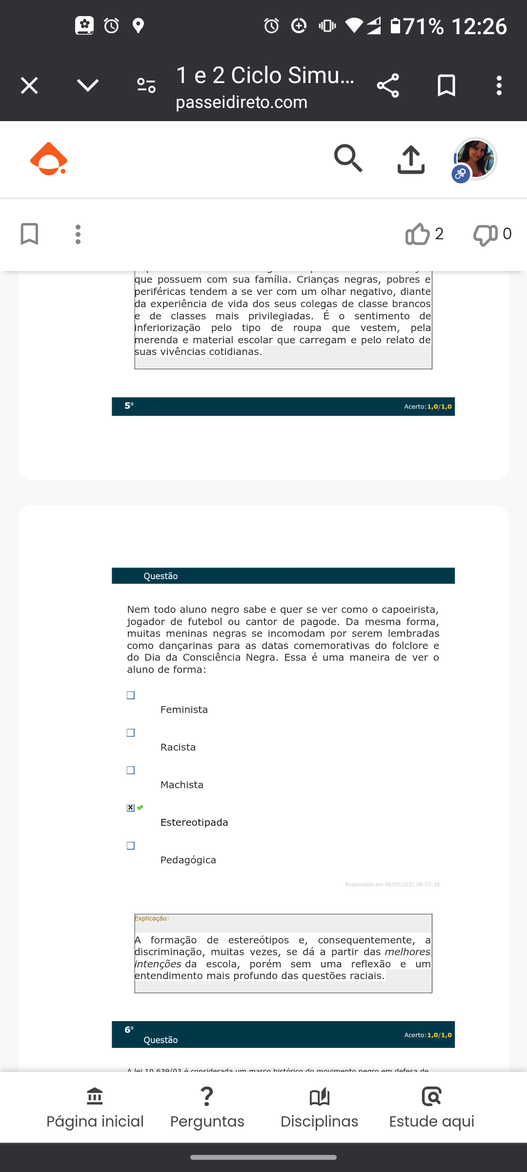 <p>L 12:26 1 e 2 Ciclo Simu.. X V passeidireto.com 2 0 que possuem com sua família. Crianças negras, pobres e periféricas tendem a se ver com um olhar negativo, diante da experiência de vida dos seus colegas de classe brancos de classes mais privilegiadas. É o sentimento de pelo tipo de roupa que vestem, pela merenda e material escolar que carregam e pelo relato de suas vivências cotidianas. Acerto: 1,0/1,0 Questão Nem todo aluno negro sabe e quer se ver como o capoeirista, jogador de futebol ou cantor de pagode. Da mesma forma, muitas meninas negras se incomodam por serem lembradas como dançarinas para as datas comemorativas do folclore e do Dia da Consciência Negra. Essa é uma maneira de ver o aluno de forma: Feminista Racista Machista Estereotipada Pedagógica Respondido em 06/05/2021 08:57:38 Explicação: A formação de estereótipos e, consequentemente, a discriminação, muitas vezes, se dá a partir das melhores intenções da escola, porém sem uma reflexão e um entendimento mais profundo das questões raciais. Acerto: 1,0/1,0 Questão A 10 do em ? Q Página inicial Perguntas Disciplinas Estude aqui</p>
