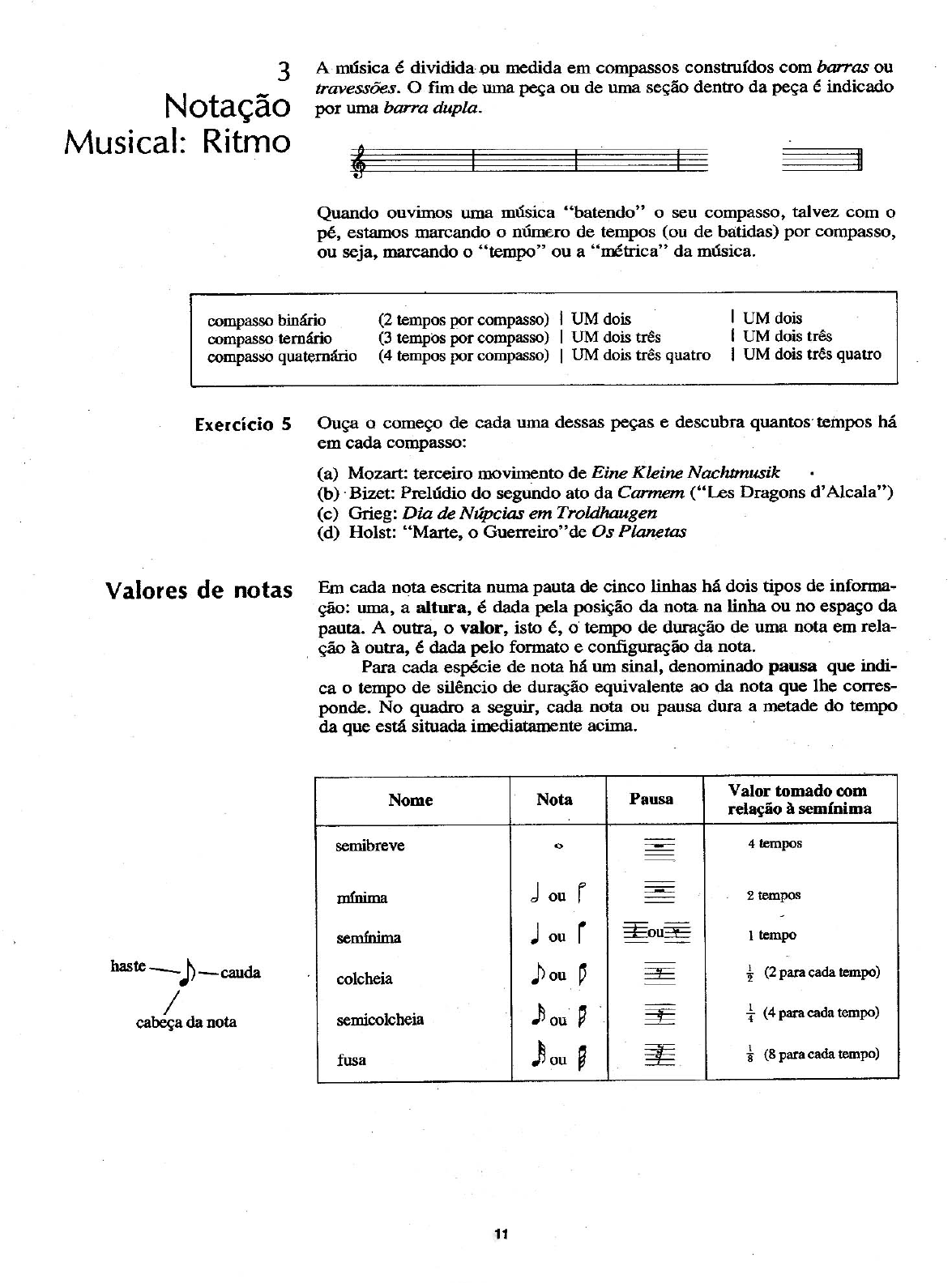 <p>3 A música é dividida ou medida em compassos construídos com barras ou travessões. O fim de uma peça ou de uma seção dentro da peça é indicado Notação por uma barra dupla. Musical: Ritmo Quando ouvimos uma música "batendo" o seu compasso, talvez com o pé, estamos marcando o número de tempos (ou de batidas) por compasso, ou seja, marcando o "tempo" ou a "métrica" da música. compasso binário (2 tempos por compasso) UM dois UM dois compasso ternário (3 tempos por compasso) UM dois três UM dois três compasso quaternário (4 tempos por compasso) UM dois três quatro UM dois três quatro Exercício 5 Ouça o começo de cada uma dessas peças e descubra quantos tempos há em cada compasso: (a) Mozart: terceiro movimento de Eine Kleine Nachtmusik (b) Bizet: Prelúdio do segundo ato da Carmem ("Les Dragons d'Alcala") (c) Grieg: Dia de Núpcias em Troldhaugen (d) Holst: "Marte, o Guerreiro" de Os Planetas Valores de notas Em cada nota escrita numa pauta de cinco linhas há dois tipos de informa- ção: uma, a altura, é dada pela posição da nota na linha ou no espaço da pauta. A outra, o valor, isto é, o tempo de duração de uma nota em rela- ção à outra, é dada pelo formato e configuração da nota. Para cada espécie de nota há um sinal, denominado pausa que indi- ca o tempo de silêncio de duração equivalente ao da nota que lhe corres- ponde. No quadro a seguir, cada nota ou pausa dura a metade do tempo da que está situada imediatamente acima. Valor tomado com Nome Nota Pausa relação à semínima semibreve 4 tempos mínima ou 2 tempos semínima ou ou 1 tempo haste cauda colcheia ou 2 (2 para cada tempo) 1 cabeça da nota semicolcheia 4 (4 para cada tempo) ou fusa ou (8 para cada tempo) 11</p><p>Mostramos aqui como a semibreve se divide em notas de menor valor: 1 semibreve = 2 mínimas = 4 semínimas 8 colcheias 16 semicolcheias = 32 fusas Notas ligadas e As notas de mesma altura estão, por vezes, "ligadas" por uma linha cur- pontuadas va, denominada ligadura. Disso, resulta um som sustentado, cuja duração é a soma dos valores das duas notas: (=4+2=6) (=2+1=3) Outro meio de prolongar o som é colocando um ponto após a nota. pon- to acrescenta à nota metade do valor que ela já tem: (4+2=6) (2+1=3) Se houver um segundo ponto, este irá acrescentar à nota a metade do va- lor do primeiro ponto: d. O(s) ponto(s) pode(m) também ser colocado(s) após as pausas. Grupo de notas Como se pode ver pelo quadro anterior, quando as notas de menor valor que a semínima pertencem a um mesmo tempo, elas têm suas caudas liga- das formando um único grupo. Aqui, damos alguns exemplos: torna-se torna-se torna-se Exercício 6 A Para cada um desses desenhos rítmicos, escreva uma única nota que tenha o mesmo valor do total das notas: (a) (b) (c) (d) (e) B Para cada um dos desenhos rítmicos acima, escreva uma única pausa que corresponda aos seus respectivos valores. Exercício 7 Faça desenhos rítmicos que sejam equivalentes às notas dadas abaixo. (Cada um deles pode valer um tempo do compasso.) (a) d (b) d. (c) d. (d) Exercício 8 Se esses dois quadros fossem prolongados, a nota seguinte seria uma se- mifusa. Perguntamos então: (a) Quantas semifusas equivalem a uma semínima? (b) Escreva uma semifusa e a pausa que lhe corresponde. 12</p><p>4 A indicação numérica do compasso é feita com dois números escritos um sobre o outro, no começo da música. Assim temos o tempo (o número Indicação de tempos por compasso) que o compositor está usando. Se a unidade de Numérica dos tempo for apenas uma nota simples (não uma nota pontuada), diremos que a música está composta em compasso simples. Se, entretanto, a unidade Compassos de tempo for uma nota pontuada, a música estará num compasso composto. No compasso simples, a unidade de tempo é uma nota divisível por dois. No compasso composto, a unidade de tempo é dividida em três. Por exemplo: compasso simples compasso composto = = É esta divisão em três tempos que, dá à música escrita num compasso composto o seu ritmo de dança que tanto poderá ser calmo e cadenciado (no caso de andamentos moderados ou lentos), como salti- tante (de andamentos vivazes ou rápidos). Num compasso simples, o numerador (veja o quadro a seguir) sempre in- dica o número de tempos de cada um dos compassos. denominador re- presenta uma fração da semibreve e indica que espécie de nota foi tomada como unidade de tempo. Observe o quadro da p. 12 e veja, por exemplo, como = três partes de uma semibreve são três mínimas por compasso 2 4 ou como 4 = quatro quartos de uma semibreve são quatro semínimas por compasso e assim por diante. Exercício 9 Escreva as frações que expressam um: (a) compasso binário simples que tenha a semínima para unidade de tempo (b) compasso ternário simples que tenha a mínima para unidade de tempo (c) compasso quaternário simples que tenha a semínima para unidade de tempo (d) compasso ternário simples que tenha a colcheia para unidade de tempo Já o compasso composto é um tanto diferente. Nele, a unidade de tempo é uma nota pontuada que se divide em três aqui, o que importa é o nú- mero três. Embora um compasso composto, como 8 6 nos informe corre- tamente que são seis colcheias por compasso, a sua unidade de tempo é uma colcheia pontuada. Uma colcheia vale, de fato, apenas um terço da unidade de tempo. Desse modo, para encontrar o número de tempos exis- tentes no compasso, basta que se divida o numerador da fração por três. Este quadro mostra os compassos mais empregados: Compassos simples Compassos compostos binário 2 tempos: 1 2 tempos: 1 2 tempos: 1 2 tempos: 1 2 ternário tempos: 1 3 tempos: 2 3 tempos: 1 2 3 quaternário tempos: 3 4 tempos: 1234 tempos: 1 2 3 4 13</p><p>Os compositores costumam também escrever em vez de 4 (muitas vezes chamado tempo simples) e em vez Não se trata, entretanto, da le- tra C usada como abreviação de "comum", mas porque durante a Idade M