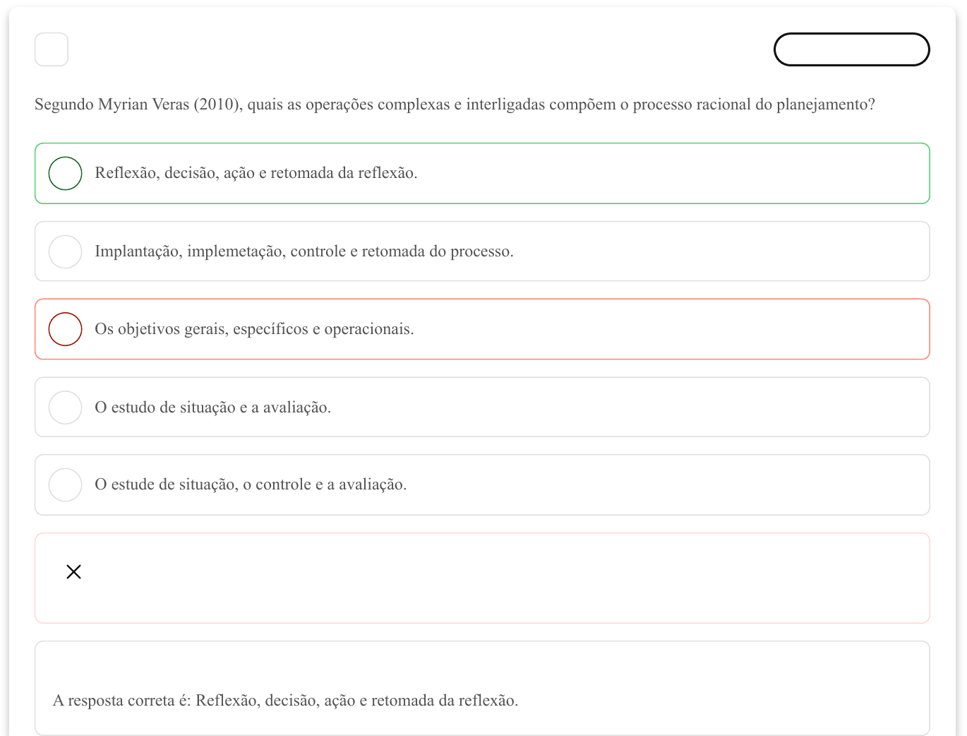<p>A</p><p>B</p><p>C</p><p>D</p><p>E</p><p>1 Marcar para revisão</p><p>Segundo Myrian Veras (2010), quais as operações complexas e interligadas compõem o processo racional do planejamento?</p><p>Reflexão, decisão, ação e retomada da reflexão.</p><p>Implantação, implemetação, controle e retomada do processo.</p><p>Os objetivos gerais, específicos e operacionais.</p><p>O estudo de situação e a avaliação.</p><p>O estude de situação, o controle e a avaliação.</p><p>Resposta incorreta</p><p>Opa! A alternativa correta é a letra A. Confira o gabarito comentado!</p><p>Gabarito Comentado</p><p>A resposta correta é: Reflexão, decisão, ação e retomada da reflexão.</p><p>01/09/2024, 15:54 estacio.saladeavaliacoes.com.br/exercicio/66d4b728d6fc23ed66492ed5/gabarito/</p><p>https://estacio.saladeavaliacoes.com.br/exercicio/66d4b728d6fc23ed66492ed5/gabarito/ 1/4</p><p>A</p><p>B</p><p>C</p><p>D</p><p>E</p><p>2 Marcar para revisão</p><p>Abaixo estão algumas características que os indicadores devem demonstrar, exceto:</p><p>Ter validade.</p><p>Ser evasivo.</p><p>Ser confiáveis.</p><p>Medir mudanças específicas.</p><p>Ter clareza,</p><p>Resposta incorreta</p><p>Opa! A alternativa correta é a letra B. Confira o gabarito comentado!</p><p>Gabarito Comentado</p><p>01/09/2024, 15:54 estacio.saladeavaliacoes.com.br/exercicio/66d4b728d6fc23ed66492ed5/gabarito/</p><p>https://estacio.saladeavaliacoes.com.br/exercicio/66d4b728d6fc23ed66492ed5/gabarito/ 2/4</p><p>A</p><p>B</p><p>C</p><p>D</p><p>E</p><p>A resposta correta é: Ser evasivo.</p><p>3 Marcar para revisão</p><p>É desenvolvida dentro da organização gestora do projeto, mas, é realizada por pessoas que não estão diretamente vinculadas com a</p><p>formulação ou execução do projeto. A frase significa, avaliação:</p><p>Externa.</p><p>Interna.</p><p>Mista.</p><p>Plural.</p><p>Participativa.</p><p>Resposta incorreta</p><p>Opa! A alternativa correta é a letra B. Confira o gabarito comentado!</p><p>01/09/2024, 15:54 estacio.saladeavaliacoes.com.br/exercicio/66d4b728d6fc23ed66492ed5/gabarito/</p><p>https://estacio.saladeavaliacoes.com.br/exercicio/66d4b728d6fc23ed66492ed5/gabarito/ 3/4</p><p>Gabarito Comentado</p><p>A resposta correta é: Interna.</p><p>01/09/2024, 15:54 estacio.saladeavaliacoes.com.br/exercicio/66d4b728d6fc23ed66492ed5/gabarito/</p><p>https://estacio.saladeavaliacoes.com.br/exercicio/66d4b728d6fc23ed66492ed5/gabarito/ 4/4</p>