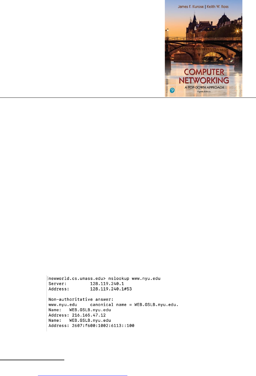 <p>Laboratório Wireshark:</p><p>DNS v8.1</p><p>Suplemento para redes de computadores: uma abordagem de cima para baixo, 8ª</p><p>ed</p><p>., JF</p><p>Kurose e KW Ross</p><p>“Diga-me e eu esqueço. Mostre-me e eu me lembrarei. Envolva-me e eu entenderei.” provérbio chinês</p><p>© 2005-2021, JF Kurose e KW Ross, Todos os direitos reservados</p><p>Conforme descrito na Seção 2.4 do texto</p><p>1</p><p>, o Sistema de Nomes de Domínio (DNS) traduz nomes de host em endereços IP, cumprindo um papel crítico na</p><p>infraestrutura da Internet. Neste laboratório, veremos mais de perto o lado do cliente do DNS. Lembre-se de que a função do cliente no DNS é</p><p>relativamente simples – um cliente envia uma consulta ao seu servidor DNS local e recebe uma resposta de volta. Conforme mostrado nas Figuras 2.19 e</p><p>2.20 do livro, muita coisa pode acontecer “nos bastidores”, invisível para um cliente DNS, à medida que os servidores DNS hierárquicos se comunicam</p><p>entre si para resolver de forma recursiva ou iterativa a consulta DNS do cliente. Do ponto de vista do cliente DNS, entretanto, o protocolo é bastante</p><p>simples – uma consulta é formulada ao servidor DNS local e uma resposta é recebida desse servidor.</p><p>Antes de iniciar este laboratório, você provavelmente desejará revisar o DNS lendo a Seção 2.4 do texto. Em particular, você pode querer revisar o</p><p>material sobre servidores DNS locais , cache DNS , registros e mensagens DNS e o campo TYPE no registro DNS.</p><p>1. pesquisa</p><p>Vamos começar nossa investigação do DNS examinando o nslookup comando, que invocará os serviços DNS subjacentes para implementar sua</p><p>funcionalidade. O comando nslookup está disponível na maioria dos sistemas operacionais Microsoft, Apple IOS e Linux. Para executar o nslookup,</p><p>basta digitar o comando nslookup na linha de comando em uma janela DOS, janela de terminal Mac IOS ou shell Linux.</p><p>Em sua operação mais básica, o nslookup permite que o host que executa o nslookup consulte qualquer servidor DNS especificado em busca de um</p><p>registro DNS. O servidor DNS consultado pode ser um servidor DNS raiz, um servidor DNS de domínio de nível superior (TLD), um servidor DNS</p><p>autoritativo ou um servidor DNS intermediário (consulte o livro para obter as definições desses termos). Por exemplo, nslookup pode ser usado para</p><p>recuperar um registro DNS “Tipo=A” que mapeia um nome de host (por exemplo, www.nyu.edu) para seu endereço IP. Para realizar esta tarefa, o</p><p>nslookup envia uma consulta DNS ao servidor DNS especificado (ou ao servidor DNS local padrão para o host no qual o nslookup é executado, se</p><p>nenhum servidor DNS específico for especificado), recebe uma resposta DNS desse servidor DNS e exibe o resultado.</p><p>Vamos dar uma olhada no nslookup sair para dar uma volta! Primeiro executaremos o nslookup na linha de comando do Linux no host</p><p>newworld.cs.umass.edu localizado no Departamento de CS do campus da Universidade de Massachusetts (UMass), onde o servidor de nomes local é</p><p>denominado primo.cs.umass.edu ( que possui um endereço IP 128.119.240.1). Vamos tentar o nslookup em sua forma mais simples:</p><p>Figura 1: o comando nslookup básico</p><p>Neste exemplo, o comando nslookup recebe um argumento, um nome de host (www.nyu.edu). Em palavras, este comando diz “envie-me o endereço IP</p><p>do host www.nyu.edu”. Conforme mostrado na captura de tela, a resposta deste comando fornece duas informações: (1) o nome e endereço IP do servidor</p><p>1 As referências às figuras e seções referem-se à 8ª</p><p>edição</p><p>do nosso texto, Computer Networks, A Top-down Approach, 8</p><p>h</p><p>ed., JF Kurose e KW Ross, Addison-Wesley/Pearson, 2020.</p><p>Nosso site para este livro é http ://gaia.cs.umass.edu/kurose_ross Você encontrará muito material aberto interessante lá.</p><p>http://gaia.cs.umass.edu/kurose_ross</p><p>DNS que fornece a resposta – neste caso, o servidor DNS local na UMass; e (2) a própria resposta, que é o nome canônico do host e o endereço IP de</p><p>www.nyu.edu. Você deve ter notado que existem dois pares nome/endereço fornecidos para www.nyu.edu . O primeiro ( 216.165.47.12 ) é um</p><p>endereço IPv4 na familiar notação decimal pontilhada; o segundo ( 2607:f600:1002:6113::100 ) é um endereço IPv6 mais longo e complicado.</p><p>Aprenderemos sobre IPv4 e IPv6 e seus dois esquemas de endereçamento diferentes posteriormente no Capítulo 4. Por enquanto, vamos nos concentrar</p><p>apenas em nosso mundo IPv4 mais confortável (e comum)</p><p>2</p><p>.</p><p>Embora a resposta tenha vindo do servidor DNS local (com endereço IP 128.119.240.1 ) na UMass, é bem possível que este servidor DNS local tenha</p><p>contatado iterativamente vários outros servidores DNS para obter a resposta, conforme descrito na Seção 2.4 do livro.</p><p>Além de usar nslookup para consultar um registro DNS “Type=A”, também podemos usar nslookup to nslookup para consultar um registro</p><p>“TYPE=NS”, que retorna o nome do host (e seu endereço IP) de um servidor DNS autoritativo que sabe como obter os endereços IP dos hosts no domínio</p><p>do servidor autoritativo.</p><p>Figura 2: usando nslookup para encontrar os servidores de nomes autorizados para o domínio nyu.edu</p><p>No exemplo da Figura 2, invocamos nslookup com a opção “-type=NS” e o domínio “nyu.edu”. Isso faz com que o nslookup envie uma consulta para</p><p>um registro do tipo NS ao servidor DNS local padrão. Em palavras, a consulta diz: “envie-me os nomes de host do DNS oficial para nyu.edu”. (Quando a</p><p>opção –type não é usada, o nslookup usa o padrão, que é consultar registros do tipo A.) A resposta, exibida na captura de tela acima, primeiro indica o</p><p>servidor DNS que está fornecendo a resposta (que é o servidor local padrão Servidor DNS UMass com endereço 128.