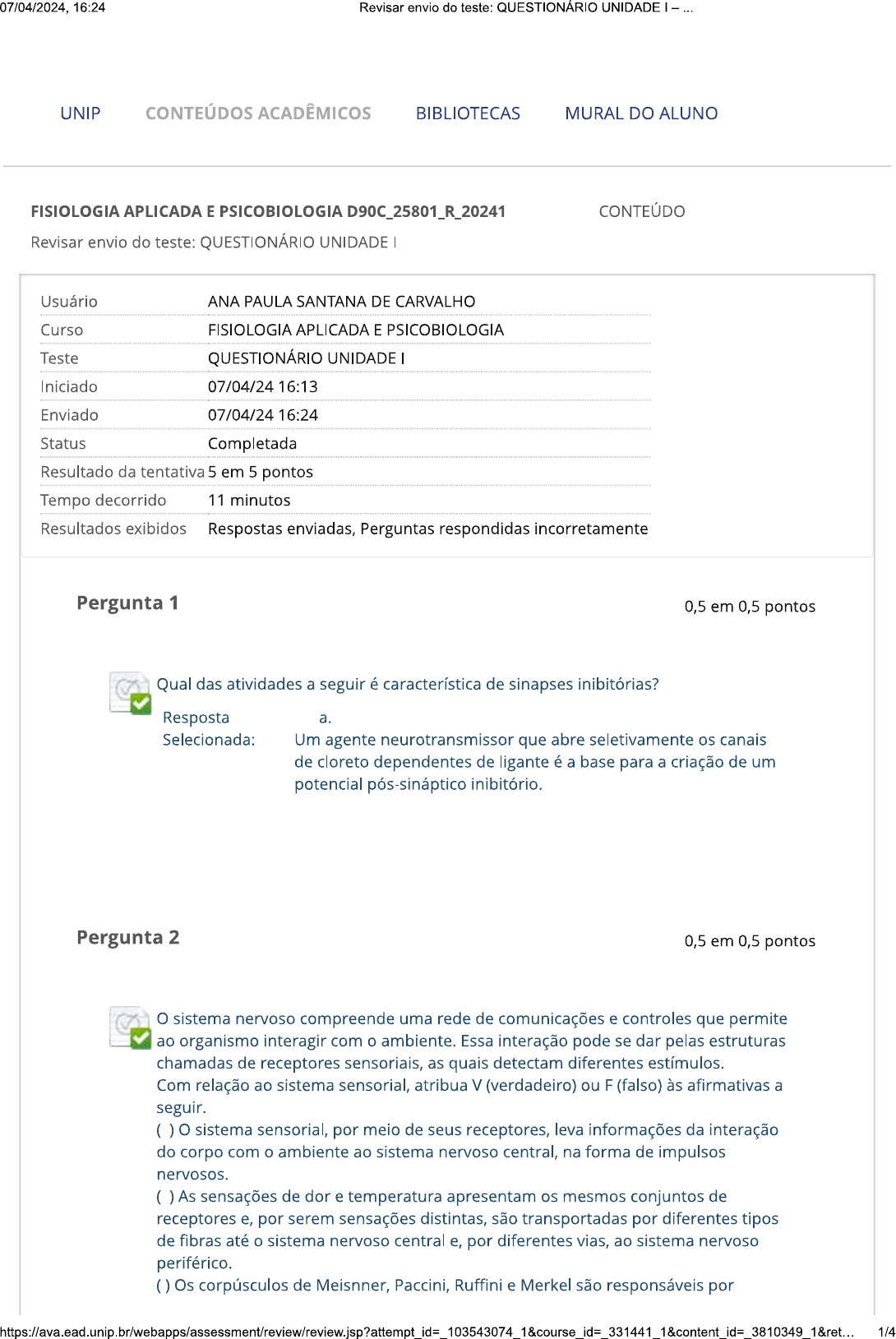 <p>07/04/2024, 16:24 Revisar envio do teste: QUESTIONÁRIO UNIDADE UNIP CONTEÚDOS ACADÊMICOS BIBLIOTECAS MURAL DO ALUNO FISIOLOGIA APLICADA E PSICOBIOLOGIA D90C_25801_R_20241 CONTEÚDO Revisar envio do teste: QUESTIONÁRIO UNIDADE Usuário ANA PAULA SANTANA DE CARVALHO Curso FISIOLOGIA APLICADA E PSICOBIOLOGIA Teste QUESTIONÁRIO UNIDADE Iniciado 07/04/24 16:13 Enviado 07/04/24 16:24 Status Completada Resultado da tentativa 5 em 5 pontos Tempo decorrido 11 minutos Resultados exibidos Respostas enviadas, Perguntas respondidas incorretamente Pergunta 1 0,5 em 0,5 pontos Qual das atividades a seguir é característica de sinapses inibitórias? Resposta a. Selecionada: Um agente neurotransmissor que abre seletivamente os canais de cloreto dependentes de ligante é a base para a criação de um potencial pós-sináptico Pergunta 2 0,5 em 0,5 pontos sistema nervoso compreende uma rede de comunicações e controles que permite ao organismo interagir com o ambiente. Essa interação pode se dar pelas estruturas chamadas de receptores sensoriais, as quais detectam diferentes estímulos. Com relação ao sistema sensorial, atribua V (verdadeiro) ou F (falso) às afirmativas a seguir. ( ) O sistema sensorial, por meio de seus receptores, leva informações da interação do corpo com o ambiente ao sistema nervoso central, na forma de impulsos nervosos. ( ) As sensações de dor e temperatura apresentam os mesmos conjuntos de receptores e, por serem sensações distintas, são transportadas por diferentes tipos de fibras até o sistema nervoso central e, por diferentes vias, ao sistema nervoso periférico. Os corpúsculos de Meisnner, Paccini, Ruffini e Merkel são responsáveis por 1/4</p><p>07/04/2024, 16:24 Revisar envio do teste: QUESTIONÁRIO UNIDADE diferentes percepções sensoriais quando em contato da pele com diferentes objetos ou com o ambiente. ( ) As terminações nervosas livres que têm por função perceber variações de temperatura apresentam uma distribuição uniforme por todo o corpo. ( ) Na espécie humana, há receptores cutâneos com terminações nervosas livres na pele da face, nas palmas das mãos e nas pontas dos dedos, o que nos permite sentir a dor. Assinale a alternativa que contém, de cima para baixo, a sequência correta. Resposta Selecionada: V, F, V, F, V. C. Pergunta 3 0,5 em 0,5 pontos Associe os termos com a sua descrição: (1) Axônio ( ) Processo de um neurônio que recebe sinais (2) Dendrito ( ) Neurônios sensitivos, transmitem informações ao SNC. (3) Aferentes ( ) Processo longo que transmite sinais para as (4) Eferentes ( ) Região do neurônio em que o potencial de ação inicia. (5) Zona de ( ) Neurônios que transmitem informações do SNC para o resto do gatilho corpo. Assinale a alternativa que apresenta a ordem numérica correta de cima para baixo: Resposta Selecionada: b. 2, 3, 1, 5, 4. Pergunta 4 0,5 em 0,5 pontos Avalie a velocidade de condução de cada um dos neurônios a seguir: (a) Axônio mielinizado, diâmetro de 20 um. (b) Axônio não mielinizado, diâmetro de 20 um. (c) Axônio não mielinizado, diâmetro de 200 um. Assinale a alternativa que apresenta a ordem correta dos neurônios anteriores, do mais rápido para o mais lento: Resposta Selecionada: C. a, C, b. Pergunta 5 0,5 em 0,5 pontos 2/4</p><p>07/04/2024, 16:24 Revisar envio do teste: QUESTIONÁRIO UNIDADE Os impulsos nervosos, provenientes de fibras nervosas de certa divisão (D1) do sistema nervoso autônomo, inibem os batimentos do coração humano pela liberação de um mediador químico (M) nas junções neuromusculares. Por outro lado, impulsos provenientes de fibras de outra divisão (D2) do mesmo sistema nervoso aceleram os batimentos cardíacos. Nesse texto, D1, D2 e M correspondem aos seguintes termos: Resposta Selecionada: d. D1 = parassimpático, D2 = simpático, M = acetilcolina. Pergunta 6 0,5 em 0,5 pontos Identifique as funções correspondentes para as células numeradas: 1- Astrócitos 2- Células ependimárias 3- Microglia 4- Oligodendrócitos 5- Células satélite 6- Células de Schwann ( ) Células imunes modificadas ( ) Ajudam a formar a barreira hematoencefálica ( ) Formam mielina no SNC ( ) Separam os compartimentos líquidos no SNC ( ) Encontradas no sistema nervoso periférico ( ) Encontradas nos gânglios A ordem correta de cima para baixo é: Resposta Selecionada: b. 3, 1, 4, 2, 6, 5. Pergunta 7 0,5 em 0,5 pontos Qual substância é responsável pela sensação do sabor umami? Resposta Selecionada: e. Glutamato. Pergunta 8 0,5 em 0,5 pontos potencial de repouso de uma fibra nervosa mielinizada é primariamente dependente do gradiente de concentração de qual dos seguintes 3/4</p><p>07/04/2024, 16:24 Revisar envio do teste: QUESTIONÁRIO UNIDADE ... Resposta Selecionada: d. K+ Pergunta 9 0,5 em 0,5 pontos A liberação do neurotransmissor em uma sinapse química no sistema nervoso central é dependente de qual dos seguintes mecanismos? Resposta C. Selecionada: Influxo de Ca2+ para o interior do terminal pré-sináptico. Pergunta 10 0,5 em 0,5 pontos Um homem com 76 anos sofreu um acidente vascular cerebral que prejudicou gravemente sua fala. Que área do seu cérebro foi mais provavelmente danificada? Resposta Selecionada: Área de broca. C. OK Domingo, 7 de Abril de 2024 16h24min49s GMT-03:00 4/4</p>