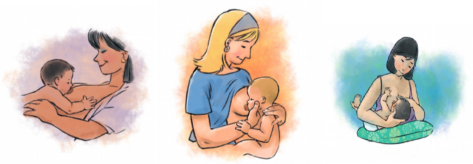 <p>PEGA E CUIDADOS NA AMAMENTAÇÃO</p><p>O leite materno é o melhor e o mais completo alimento para o bebê. Recomenda-se que até o sexto mês de vida, o bebê seja alimentado exclusivamente de leite materno. Após este período, a amamentação deverá ser complementada por outros alimentos. Este é um guia com o passo a passo da pega e posicionamentos corretos, para você levar na maternidade e colocar em prática desde a primeira mamada.</p><p>Posição da mãe, pontos a observar:</p><p>· Posições: sentada, reclinada, deitada.</p><p>· Peitoral aberto, ombros relaxados, não projetada em cima do bebê.</p><p>· Peso das mamas para si, deixando as costas bem apoiadas. Se mamas grandes (apoio com a mão, rolinho embaixo do seio ou tipóia).</p><p>· Levar o bebê ao seio, não o seio ao bebê.</p><p>· Se houver apoio com a mão na cabeça do bebê, cuide para apoiar a nuca do bebê com a mão em C (de orelha a orelha), não pegar na cabeça, não apertar orelhas, pescoço, mandíbula ou queixo.</p><p>Posição do bebê, pontos a observar:</p><p>· Corpo todo virado e junto (grudadinho) para o corpo da mãe.</p><p>· Cabeça e corpo alinhados.</p><p>· Ajustes do corpo do bebê para cima ou para baixo, para a direita ou esquerda até a mira do mamilo ficar no lábio superior do bebê.</p><p>Posição reclinada Posição cavalinho Posição apoio no antebraço</p><p>Pega correta, a mãe deve:</p><p>· Avaliar elasticidade da aréola antes da mamada (se endurecida, fazer massagem na aréola com as mãos e se necessário ordenhar um pouco de leite).</p><p>· Colocar o bebê para mamar nos sinais iniciais da fome.</p><p>· Acalmar o bebê se estiver irritado ou chorando (balance de cima para baixo, fazer “xiiiiiii” no ouvido dele, ou coloque o dedo mínimo higienizado para o bebê sugar até acalmar, converse com ele, acaricie, junte em posição fetal junto ao seu corpo).</p><p>· Prega de apoio na mama (técnica do sanduíche) sempre no mesmo sentido da boquinha do bebê e pegando onde acaba a aréola sem apertar muito (posição tradicional prega em tesoura de cima para baixo; posição tradicional de braços invertidos prega em U de baixo para cima; posição cavaleiro prega em C). Não soltar imediatamente a prega de apoio, esperar o bebê iniciar a sucção e manter a pega.</p><p>· Estimular o reflexo de abertura da boca do bebê (passar o mamilo no lábio superior do bebê, como pincel). Levar o bebê para fazer a pega com bocão bem grande – bocão de A e língua abaixada.</p><p>· Verificar se está correta e sinais de boa pega. Se posição e ou pega incorretas, fazer os ajustes ou remover bebê do seio colocando o dedo mínimo dentro da boca do bebê para tirar o vácuo e não machucar os mamilos.</p><p>Pega em tesoura – com os dedos indicador e o médio formando uma tesoura na parte superior</p><p>do seio ao redor do mamilo.</p><p>Pega em U – com os dedos em forma de U na parte inferior do seio ao redor do mamilo.</p><p>Pega em C – com os dedos em C na parte lateral do seio ao redor do mamilo.</p><p>Pega correta, sobre o bebê:</p><p>· Cabeça levemente estendida para trás, "tomando água". Se não, ajustar a cabeça do bebê com a sua mão, fazendo entrar o queixo na mama.</p><p>· Nariz bem livre e queixo encostando ou entrando bem na mama. Se nariz enterrado e queixo longe - ajustar corpo do bebê no alinhamento, mantendo sempre junto ao seu corpo; levar o corpo do bebê sentido oposto, fazer a cabeça ficar estendida para trás com a mão.</p><p>· Boca bem aberta (bocão de A) pegando a aréola (mais quantidade na parte de baixo, no queixo, do que em cima, no lábio superior). Se boca em ângulo fechado, puxar o queixo do bebê com o indicador ou polegar para abrir a boquinha (esperar a pausa da sucção para fazer isso).</p><p>· Lábios evertidos para fora, relaxados. Se lábio inferior virado para dentro, puxar o queixo do bebê com o indicador ou polegar na pausa da sucção, até lábio virar para fora. Se lábio superior apertado e virado para dentro, puxar com o indicador a musculatura acima do lábio, ao lado no nariz (dos dois lados).</p><p>· Bochechas bem cheias e redondas durante a sucção, sem covinhas. Se covinhas, remover o bebê do seio e fazer a pega novamente.</p><p>· Se pega permanecer incorreta ou você sentir dor, remover bebê do seio com o dedo mínimo e recomeçar (posição sua e do bebê, estimular reflexo de abertura da boca, ajudar o bebê a fazer e manter pega correta, fazer ajustes para adequar a pega).</p><p>Sucção, sobre a mãe:</p><p>· Observar movimentação da mandíbula (osso do queixo) do bebê.</p><p>· Observar padrão de sucção e deglutição (sucção nutritiva e não nutritiva);</p><p>· Observar coordenação do bebê durante a mamada, entre sucção nutritiva e não nutritiva. Se somente não nutritiva (sem sinais de deglutição), garantir posição e pega corretas e fazer técnica de compressão das mamas;</p><p>· Bebê deve se manter ativo e coordenado durante a mamada. Se muito sonolento, conversar com o bebê, mexer nas orelhas, mandíbula, pescoço, mãos, pés, levantar ele, trocar de posição;</p><p>· Observar sinais das mamas antes e após as mamadas (mais cheias antes e murchas após). Se mamas permanecem cheias após as mamadas, pode ser sinal de sucção inadequada. Observar sinais de saciedade, volume de urina e quantidade e coloração das fezes.</p><p>Sucção, sobre o bebê:</p><p>· Mandíbula faz movimentos de abre, desliza para a frente, fecha e traz para trás – círculo. Intercalando alguns momentos de movimentos verticais (abre e fecha).</p><p>· Se somente movimentos verticais (padrão mordedor) manter contenção do queixo do bebê em alguns momentos da mamada.</p><p>· Sucção deve ser silenciosa, você deve ouvir somente barulhos da deglutição e respiração (não ofegante). Se barulhos de estalos, beijos ou ruídos estranhos, remover o bebê e fazer a pega novamente.</