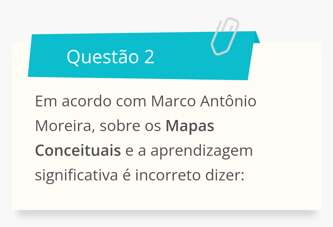 <p>Questão 2 Em acordo com Marco Antônio Moreira, sobre os Mapas Conceituais e a aprendizagem significativa é incorreto dizer:</p>