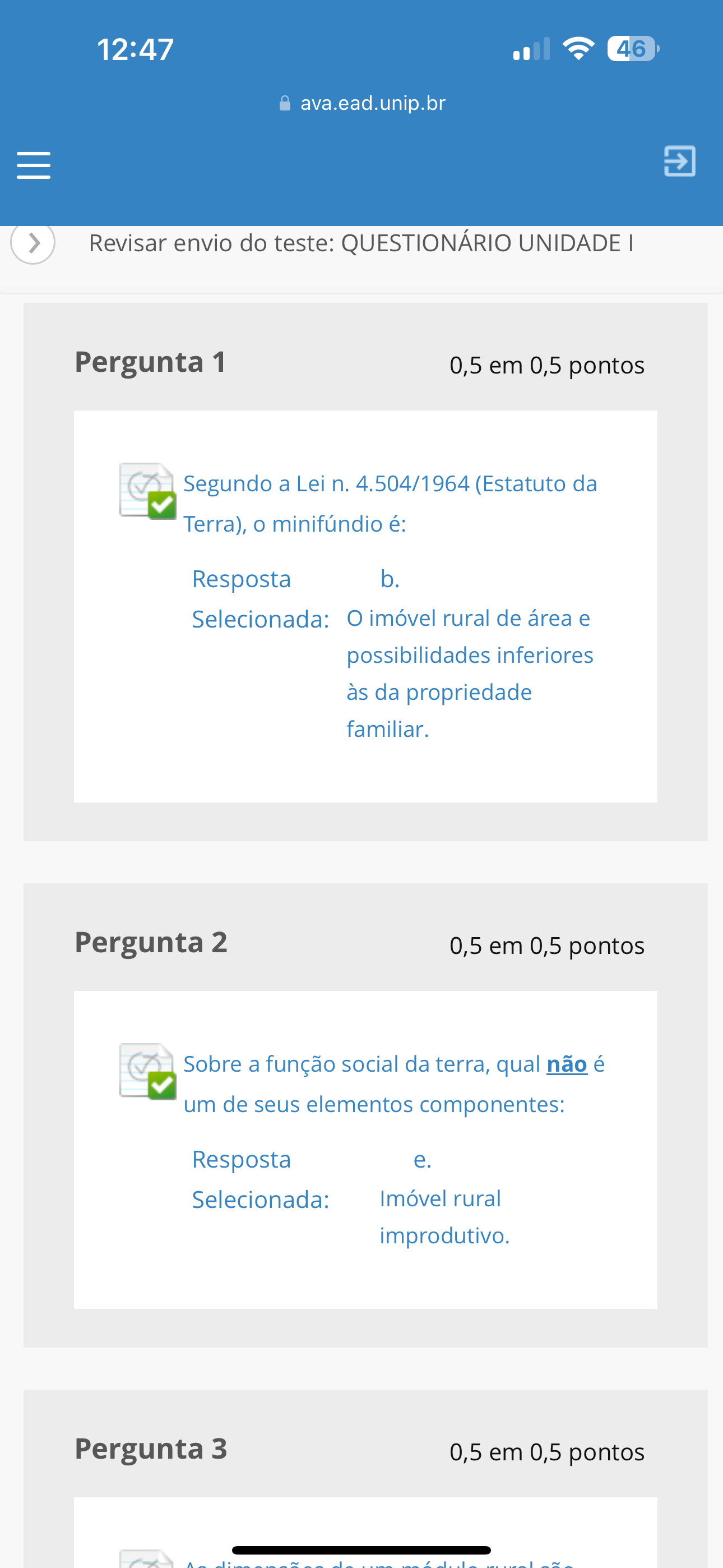 <p>12:47 46 ava.ead.unip.br > Revisar envio do teste: QUESTIONÁRIO UNIDADE Pergunta 1 0,5 em 0,5 pontos Segundo a Lei n. 4.504/1964 (Estatuto da Terra), o minifúndio é: Resposta b. Selecionada: O imóvel rural de área e possibilidades inferiores às da propriedade familiar. Pergunta 2 0,5 em 0,5 pontos Sobre a função social da terra, qual não é um de seus elementos componentes: Resposta e. Selecionada: Imóvel rural improdutivo. Pergunta 3 0,5 em 0,5 pontos</p>