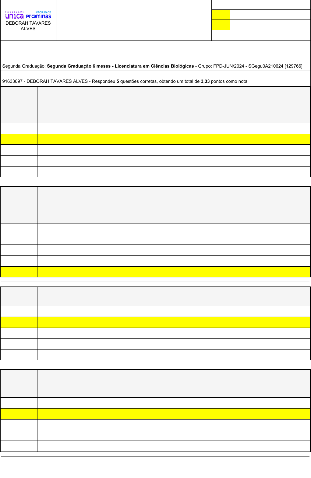 <p>Pincel Atômico - 06/09/2024 15:29:29 1/2</p><p>DEBORAH TAVARES</p><p>ALVES</p><p>Exercício Caminho do Conhecimento - Etapa 4 (21778)</p><p>Atividade finalizada em 20/08/2024 15:45:30 (2381150 / 1)</p><p>LEGENDA</p><p>Resposta correta na questão</p><p># Resposta correta - Questão Anulada</p><p>X Resposta selecionada pelo Aluno</p><p>Disciplina:</p><p>EDUCAÇÃO AMBIENTAL E SUSTENTABILIDADE [1159147] - Avaliação com 5 questões, com o peso total de 3,33 pontos [capítulos - 2]</p><p>Turma:</p><p>Segunda Graduação: Segunda Graduação 6 meses - Licenciatura em Ciências Biológicas - Grupo: FPD-JUN/2024 - SGegu0A210624 [129766]</p><p>Aluno(a):</p><p>91633697 - DEBORAH TAVARES ALVES - Respondeu 5 questões corretas, obtendo um total de 3,33 pontos como nota</p><p>[359360_135688]</p><p>Questão</p><p>001</p><p>O poder público faz parte do processo de promoção da educação ambiental entre os</p><p>diversos segmentos da sociedade. Dito isso, assinale a alternativa que representa</p><p>um desafio enfrentado pelo poder público no processo de promoção da educação</p><p>ambiental no Brasil.</p><p>Escassez de recursos públicos.</p><p>X Capacidade institucional limitada.</p><p>Inexistência de política pública relacionada à implantação da Educação Am-biental.</p><p>Objetivos claros e definidos.</p><p>Elevada integração entre os diversos atores sociais.</p><p>[359360_135694]</p><p>Questão</p><p>002</p><p>A Lei Federal n. 9.795 em seu Art. 2° destaca que a educação ambiental deve-se</p><p>fazer presente em todos os níveis, isto é, educação não-formal e formal. Além disso,</p><p>esse artigo demonstrou um avanço para a educação brasileira na medida em que a</p><p>educação ambiental passa a ser:</p><p>tema centrado em uma única área.</p><p>uma disciplina curricular.</p><p>restrita a sala de aula.</p><p>obrigatória em todas as séries do ensino primário.</p><p>X um conhecimento interdisciplinar.</p><p>[359360_135691]</p><p>Questão</p><p>003</p><p>(SEMA, 2008 – Adaptado) A primeira Constituição brasileira que dedicou um capítulo</p><p>específico ao meio ambiente foi:</p><p>Constituição Regional de 1996.</p><p>X Constituição Federal de 1988.</p><p>Constituição Estadual de 1986.</p><p>Constituição Federal de 1999.</p><p>Constituição Ambiental de 1981.</p><p>[359360_134160]</p><p>Questão</p><p>004</p><p>Uma rede abrangente para gestão ambiental. Reúne agências, tarefas e regras em</p><p>cinco níveis administrativos: União, Estados, Distrito Federal, territórios e municípios.</p><p>Esta definição diz respeito a(ao)</p><p>SISEMA.</p><p>X SISNAMA.</p><p>CONAMA.</p><p>REDE COLABORA.</p><p>CODEMA.</p><p>INF-10</p><p>Realce</p><p>INF-10</p><p>Realce</p><p>INF-10</p><p>Realce</p><p>Pincel Atômico - 06/09/2024 15:29:29 2/2</p><p>[359360_134156]</p><p>Questão</p><p>005</p><p>No Brasil, a Política Nacional do Meio Ambiente (PNMA) foi estabelecida através da</p><p>Lei nº 6.938, de 31 de agosto de 1981, baseada em princípios básicos de</p><p>conservação do meio ambiente fixados e debatidos em documentos mundialmente</p><p>aceitos. Através dela, foram criados:</p><p>X SISNAMA E CONAMA.</p><p>CONAMA E CODEMA.</p><p>PNUMA.</p><p>SISNAMA E CODEMA.</p><p>Políticas públicas.</p>