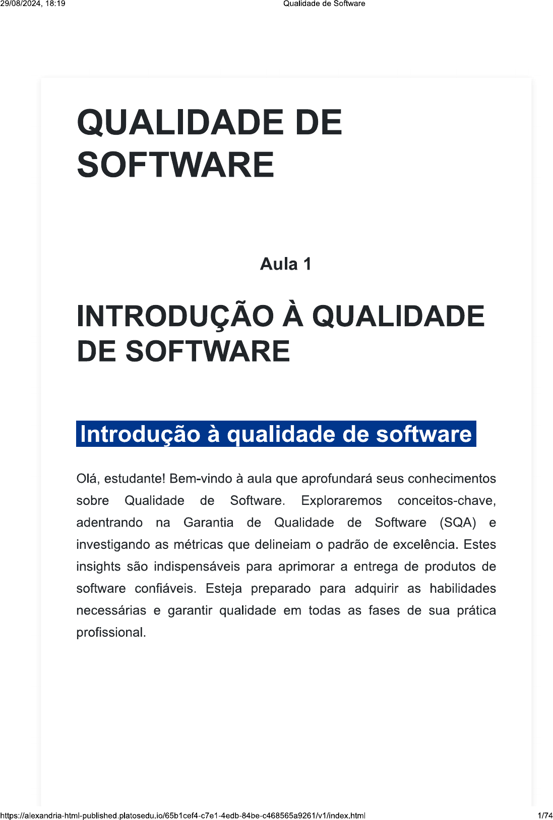 <p>29/08/2024, 18:19 Qualidade de Software QUALIDADE DE SOFTWARE Aula 1 INTRODUÇÃO À QUALIDADE DE SOFTWARE Introdução à qualidade de software Olá, estudante! Bem-vindo à aula que aprofundará seus conhecimentos sobre Qualidade de Software. Exploraremos conceitos-chave, adentrando na Garantia de Qualidade de Software (SQA) e investigando as métricas que delineiam o padrão de excelência. Estes insights são indispensáveis para aprimorar a entrega de produtos de software confiáveis. Esteja preparado para adquirir as habilidades necessárias e garantir qualidade em todas as fases de sua prática profissional. 1/74</p><p>29/08/2024, 18:19 Qualidade de Software Ponto de Partida Caro estudante, certamente você já deve ter procurado um aplicativo para resolver determinado problema, ou comprado um serviço ou produto, que, quando foi entregue, estava muito aquém do esperado. Pois bem, como usuário você deve ter percebido que sua concepção sobre a empresa, após a decepção, mudou radicalmente. Porém, nesse momento, seu papel não é mais somente o de usuário, mas o de profissional de TI, o qual deve utilizar as técnicas de desenvolvimento de software para evitar tais situações. Uma das técnicas para esse fim está relacionada com a qualidade de software e com suas ferramentas. Essa área do conhecimento da engenharia de software se preocupa em utilizar métodos, processos e normas nas atividades de desenvolvimento de software, a fim de se agregar qualidade nos processos e produtos finais. Para isso, é necessário que se tenha conhecimentos acerca de qualidade de software, qualidade do produto e qualidade dos processos. Como você pode ter percebido, existem diversas competências necessárias para se garantir a qualidade de um desenvolvimento. Agora que você já se convenceu que a qualidade de software é indispensável, vamos supor que uma empresa de consultoria em tecnologia está encarregada de desenvolver um sistema integrado de gestão para uma grande corporação. O projeto enfrenta desafios 2/74</p><p>18:19 Qualidade de Software relacionados à complexidade, prazos apertados e expectativas elevadas do cliente. Diante desse cenário, a equipe decide implementar práticas robustas de Garantia de Qualidade de Software (SQA) para assegurar a entrega de um produto confiável e de alta qualidade. Os seguintes desafios são identificados: Garantir a conformidade com os requisitos do cliente. Identificar e mitigar riscos relacionados ao desenvolvimento. Estabelecer padrões de qualidade ao longo do ciclo de vida do software. Sabendo disso, estratégias e práticas de SQA podem ser implementadas por essa empresa, além de apresentar uma síntese do resultado. Vamos Começar! Conceitos de Qualidade de software Até mesmo os programadores mais experientes concordam que alcançar um software de alta qualidade é um objetivo fundamental. Contudo, surge a dúvida sobre como definir essa qualidade. De maneira geral, a qualidade de software pode ser descrita como a aplicação eficaz de gestão de qualidade, visando criar um produto útil que ofereça valor mensurável tanto para os desenvolvedores quanto para os usuários finais. Um produto de alta qualidade deve ser útil, atendendo às exigências explícitas e implícitas dos usuários, proporcionando confiabilidade. Isso gera benefícios para a empresa, reduzindo manutenção e suporte, permitindo mais inovação. A comunidade de usuários também se beneficia, agilizando processos de negócio. O resultado é maior receita, rentabilidade e disponibilidade de informações cruciais. O termo "qualidade de software" é comumente definido como a combinação de conformidade funcional e desempenho conforme as 3/74</p><p>18:19 Qualidade de Software expectativas do patrocinador. No entanto, de acordo com Sommerville (2018), a abordagem à qualidade no desenvolvimento de software deve ser mais abrangente, considerando-a em três níveis distintos: 1. Organizacional: este nível amplo concentra-se no estabelecimento de padrões de trabalho para o desenvolvimento de software, incorporando as melhores práticas para minimizar erros e falhas. 2. Projeto: envolve o desenvolvimento baseado em padrões estabelecidos por gestores de projetos, variando de acordo com as peculiaridades do projeto, a política da empresa e o uso de frameworks, entre outros fatores. 3. Planejamento: exige a elaboração de um plano de qualidade, com uma equipe designada para verificar os requisitos acordados. Tanto os processos quanto os produtos desenvolvidos devem passar por revisões para evitar falhas inadvertidas. Para esclarecer aspectos que impactam diretamente na qualidade, é fundamental observar de que maneira esses elementos se manifestam. Falhas de Software Uma falha de software pode manifestar-se como um comportamento inesperado do sistema, resultante de um ou mais erros (Zanin et al., 2018). Para uma compreensão mais aprofundada sobre como essa falha pode impactar um sistema, recomenda-se observar a Figura 1. CONTABIL Erro inesperado! Deseja reportar? Dashboard CLIENTES Usuários Sim Não Dashboard Cliente Clientes do Cliente Pesquisar Obrigações CLIENTES Relatórios : NOME CONTATO CNPJ Figura 1 Falha de software. Fonte: Maitino (2021). Neste exemplo, o sistema gera uma mensagem de erro, impedindo o cadastro de um novo cliente, já que a confirmação do aceite é 4/74</p><p>29/08/2024, 18:19 Qualidade de Software essencial para concluir o processo. Esse impacto é significativo para o usuário, especialmente se o sistema pertencer a uma loja de departamentos que depende dele para realizar vendas e emitir notas fiscais. O prejuízo resultante seria considerável e preocupante. É importante destacar que cabe ao desenvolvedor a responsabilidade pela implementação das rotinas destinadas a lidar com falhas e erros. Essas situações podem ser comunicadas ao usuário por meio de mensagens, redirecionamento para uma nova página com imagens indi