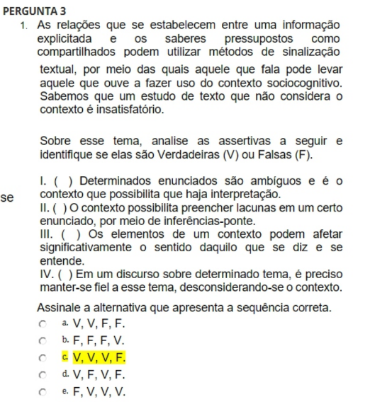 <p>PERGUNTA 3 1. As relações que se estabelecem entre uma informação explicitada e os saberes pressupostos como compartilhados podem utilizar métodos de sinalização textual, por meio das quais aquele que fala pode levar aquele que ouve a fazer uso do contexto sociocognitivo. Sabemos que um estudo de texto que não considera contexto é insatisfatório. Sobre esse tema, analise as assertivas a seguir e identifique se elas são Verdadeiras (V) ou Falsas (F). I. ( ) Determinados enunciados são e é se contexto que possibilita que haja interpretação. II. ( ) contexto possibilita preencher lacunas em um certo enunciado, por meio de inferências-ponte. III. ( ) Os elementos de um contexto podem afetar significativamente sentido daquilo que se diz e se entende. IV. Em um discurso sobre determinado tema, é preciso manter-se fiel a esse tema, desconsiderando-se contexto. Assinale a alternativa que apresenta a sequência correta. a. V, V, F. b. F, F, V. e. F, V, V, V.</p>