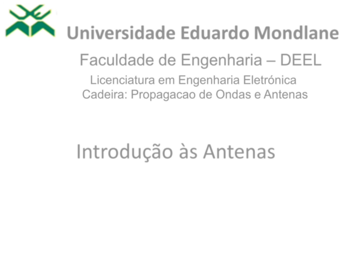 <p>Introdução às Antenas</p><p>Docente:</p><p>Eng.º Adélio Francisco Tembe, MSc.</p><p>Universidade Eduardo Mondlane</p><p>Licenciatura em Engenharia Eletrónica</p><p>Cadeira: Propagacao de Ondas e Antenas</p><p>Faculdade de Engenharia – DEEL</p><p>MSc. Eng.º Adélio F. Tembe 2</p><p>Definição de Antena</p><p> Antena e um dispositivo metálico que irradia ou recebe ondas de</p><p>rádio.</p><p> Antena e uma estrutura de transição entre os espaços livres e um</p><p>guia de onda ou linha de transmissão.</p><p> Antena é o dispositivo cuja função é transformar energia</p><p>eletromagnética guiada pela linha de transmissão em energia</p><p>eletromagnética irradiada…</p><p> Pode-se também dizer que esta lei serve no sentido inverso,</p><p>isto é, transformar energia eletromagnética irradiada em</p><p>energia eletromagnética guiada para a linha de transmissão.</p><p> Portanto, sua função e primordial em qualquer comunicação</p><p>onde exista radiofrequência.</p><p>MSc. Eng.º Adélio F. Tembe 3</p><p>Definição de Antena</p><p>Define-se antena na transmissão: a estrutura que transforma uma onda</p><p>eletromagnética plana guiada em uma onda eletromagnética esférica não uniforme</p><p>no espaço livre.</p><p>Define-se antena na receção: estrutura que transforma uma parcela de uma onda</p><p>eletromagnética esférica não uniforme no espaço livre em uma onda</p><p>eletromagnética plana guiada.</p><p>Uma boa antena no espaço livre mantém as mesmas</p><p>características seja para uso na transmissão como na receção.</p><p> Os parâmetros fundamentais permitem caracterizar o</p><p>desempenho, sobre vários aspetos, das antenas…</p><p> Através da apresentação de definições e utilização desses</p><p>parâmetros.</p><p>Eng.º Adélio F. Tembe, MSc. 4</p><p>Leis básicas da electrostatica – Lei</p><p>de Gauss</p><p>A quantidade de linhas emitidas por</p><p>uma carga é proporcional à quantidade</p><p>de cargas.</p><p>A intensidade do campo depende da</p><p>densidade de linhas. O campo</p><p>elétrico deve ser proporcional à</p><p>quantidade de cargas.</p><p>Para contar as linhas do campo,</p><p>englobamos as cargas em uma</p><p>superfície fechada Superfície</p><p>Gaussiana, arbitrariamente escolhida.</p><p>Leis básicas do magnetismo</p><p>5 Eng.º Adélio F. Tembe, MSc.</p><p>Lei de Faraday</p><p>dt</p><p>d</p><p>ntv</p><p></p><p>)(</p><p>dt</p><p>tdB</p><p>nAtv c</p><p>)(</p><p>)( </p><p>A tensão induzida em um enrolamento de “n”</p><p>espiras submetida a um fluxo variável é dada pela</p><p>expressão:</p><p>Se a distribuição do fluxo for uniforme</p><p>Então:</p><p>cAtBt *)()( </p><p>Eng.º Adélio F. Tembe, MSc.</p><p>Lei de Lenz</p><p>A tensão induzida devida a variação do fluxo Φ(t) é de polaridade tal que origina uma</p><p>corrente através do circuito que reage a alteração do fluxo.</p><p>Exemplo: Um elo de fio em curto-</p><p>circuito.</p><p> As variações do fluxo Φ(t)</p><p>induzem uma tensão v(t) no elo.</p><p> Esta tensão dividida pela</p><p>impedância do elo, geram uma</p><p>corrente i(t).</p><p> Esta corrente induz um fluxo</p><p>Φ’(t), que tende a se opor a</p><p>mudanças de Φ(t).</p><p>7 Eng.º Adélio F. Tembe, MSc.</p><p>Lei de Ampere</p><p>A integral de linha da intensidade do campo magnético H é igual a corrente total</p><p>circundada pelo campo magnético.</p><p> iHdlExemplo:</p><p>Circuito magnético com um fio</p><p>conduzindo uma corrente i(t)</p><p>passando em uma das pernas do</p><p>núcleo.</p><p>Para um campo magnético</p><p>uniforme de amplitude H(t)</p><p>temos:</p><p>F(t) = H(t)*lm = i(t)</p><p>8 Eng.º Adélio F. Tembe, MSc.</p><p>9</p><p>Lei de Ampere</p><p>O integral de linha da componente tangencial da intensidade de campo magnético H ao</p><p>redor de um caminho fechado C é igual a corrente total que corta a superfície S descrita</p><p>por este contorno.</p><p>Eng.º Adélio F. Tembe, MSc.</p><p>10</p><p>Relações fundamentais de</p><p>Eletromagnetismo</p><p>B: densidade de fluxo magnético [Tesla]</p><p>H: Intensidade de Campo Magnético [A/m]</p><p>: fluxo magnético [Weber]</p><p>W: Energía do Campo Magnético</p><p>A</p><p>B</p><p></p><p> A: Área</p><p>B = ·H : permeabilidade do meio</p><p>2H·</p><p>2</p><p>1</p><p>W </p><p>Eng.º Adélio F. Tembe, MSc.</p><p>11</p><p>Equações de Maxwell</p><p>Eng.º Adélio F. Tembe, MSc.</p><p>A primeira equação de Maxwell não é nada mais do que a</p><p>generalização da lei de Gauss que diz o seguinte:</p><p> “O fluxo do campo elétrico E através de qualquer superfície</p><p>fechada S é igual a razão entre a carga elétrica confinada dentro</p><p>da superfície e a permissividade de vácuo ε0. Essa equação</p><p>permite a existência de um monopólo elétrico, i.e., a existência</p><p>separada de cargas positivas e negativas.”</p><p>0</p><p>.</p><p></p><p>Q</p><p>SdE</p><p>S</p><p></p><p></p><p></p><p>12</p><p>Equações de Maxwell</p><p>Eng.º Adélio F. Tembe, MSc.</p><p>A segunda equação de Maxwell é a lei de Gauss para o magnetismo,</p><p>e diz seguinte:</p><p> “Qualquer que seja superfície fechada S escolhida, e qualquer</p><p>que seja conteúdo dentro do volume cercado por essa superfície</p><p>(distribuição de cargas) – o fluxo de campo magnético B através</p><p>dessa superfície será zero. Isso significa que o número de linhas</p><p>do campo magnético que entra e sai do volume é sempre igual,</p><p>i.e., os monopólos magnéticos não podem existir.”</p><p>0. </p><p></p><p> SdB</p><p>S</p><p>13</p><p>Equações de Maxwell</p><p>Eng.º Adélio F. Tembe, MSc.</p><p>A Terceira equação de Maxwell é a lei de indução de Faraday com a</p><p>seguinte interpretação:</p><p> “A integral de linha do campo elétrico E em torno de qualquer trajetória</p><p>fechada (chamada força eletromotora) é igual a taxa de variação de</p><p>fluxo magnético ΦB = ∫ B⋅ dS através de qualqu