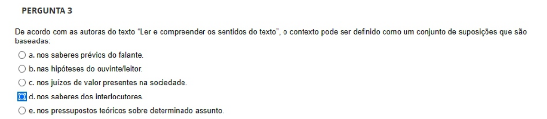 <p>PERGUNTA 3 De acordo com as autoras do texto "Ler e compreender os sentidos do contexto pode ser definido como um conjunto de suposições que são baseadas: a. nos saberes prévios do b. nas hipóteses do ouvinte/leitor. C. nos juízos de valor presentes na sociedade. d. nos saberes dos e. nos pressupostos teóricos sobre determinado</p>