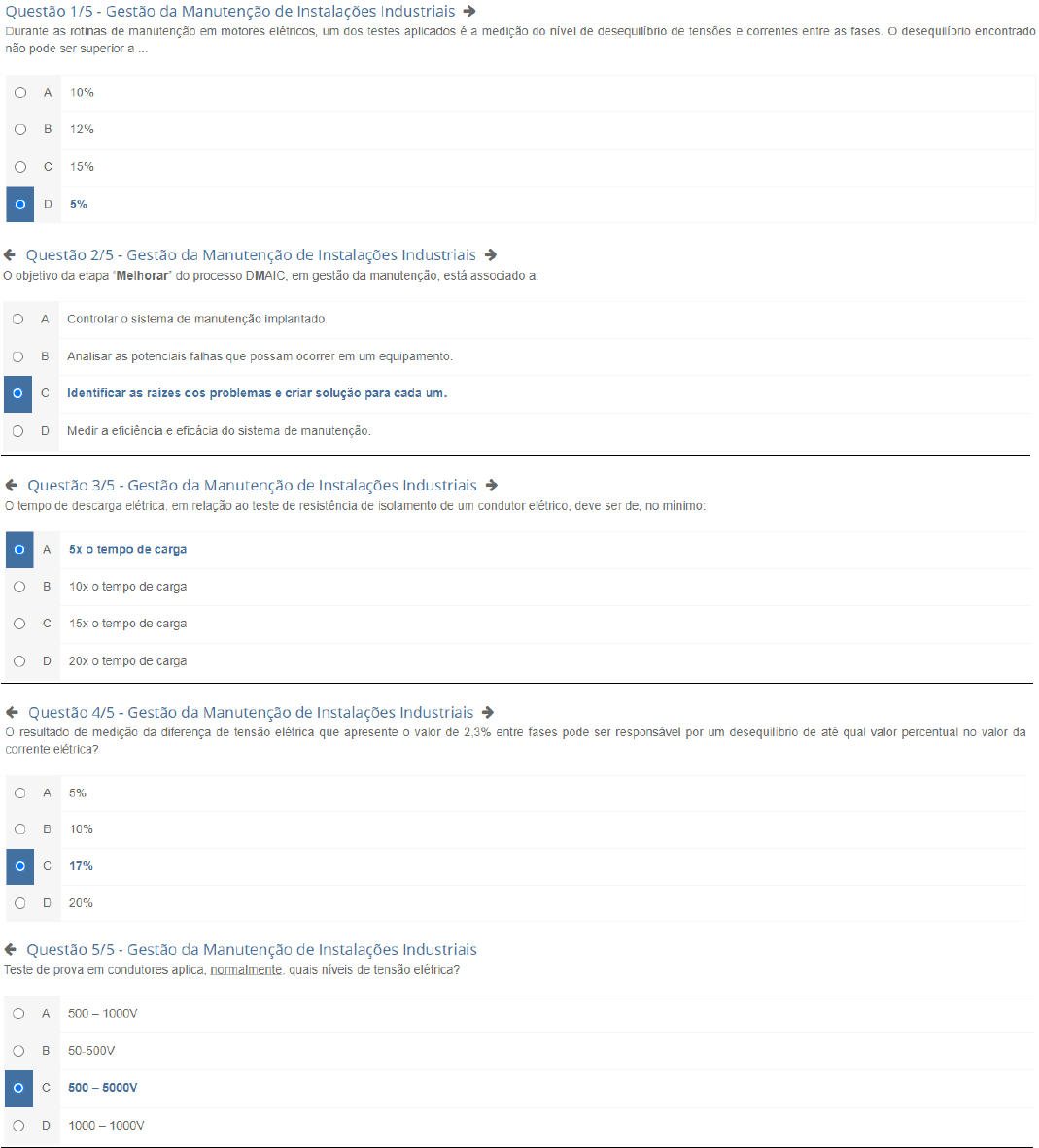 <p>Questão 1/5 - Gestão da Manutenção de Instalações Industriais Durante as rotinas de manutenção em motores elétricos, um dos testes aplicados é a medição do nível de desequilíbrio de tensões e correntes entre as fases. desequilíbrio encontrado não pode ser superior a 10% B 12% 15% D 5% Questão 2/5 Gestão da Manutenção de Instalações Industriais objetivo da etapa do processo em gestão da manutenção, está associado a: A Controlar sistema de manutenção implantado. B Analisar as potenciais falhas que possam ocorrer em um C Identificar as raízes dos problemas e criar solução para cada um. D Medir a eficiência e eficácia do sistema de manutenção. Questão 3/5 Gestão da Manutenção de Instalações Industriais tempo de descarga em relação ao teste de resistência de isolamento de um condutor deve ser de, no mínimo: A 5x tempo de carga 10x tempo de carga 15x tempo de carga 20x tempo de carga Questão 4/5 - Gestão da Manutenção de Instalações Industriais resultado de medição da diferença de tensão elétrica que apresente valor de 2,3% entre fases pode ser responsável por um desequilíbrio de até qual valor percentual no valor da corrente elétrica? 5% B 10% C 17% 20% Questão 5/5 - Gestão da Manutenção de Instalações Industriais Teste de prova em condutores aplica, normalmente, quais níveis de tensão elétrica? A 500 1000V B 50-500V C 1000 1000V</p>