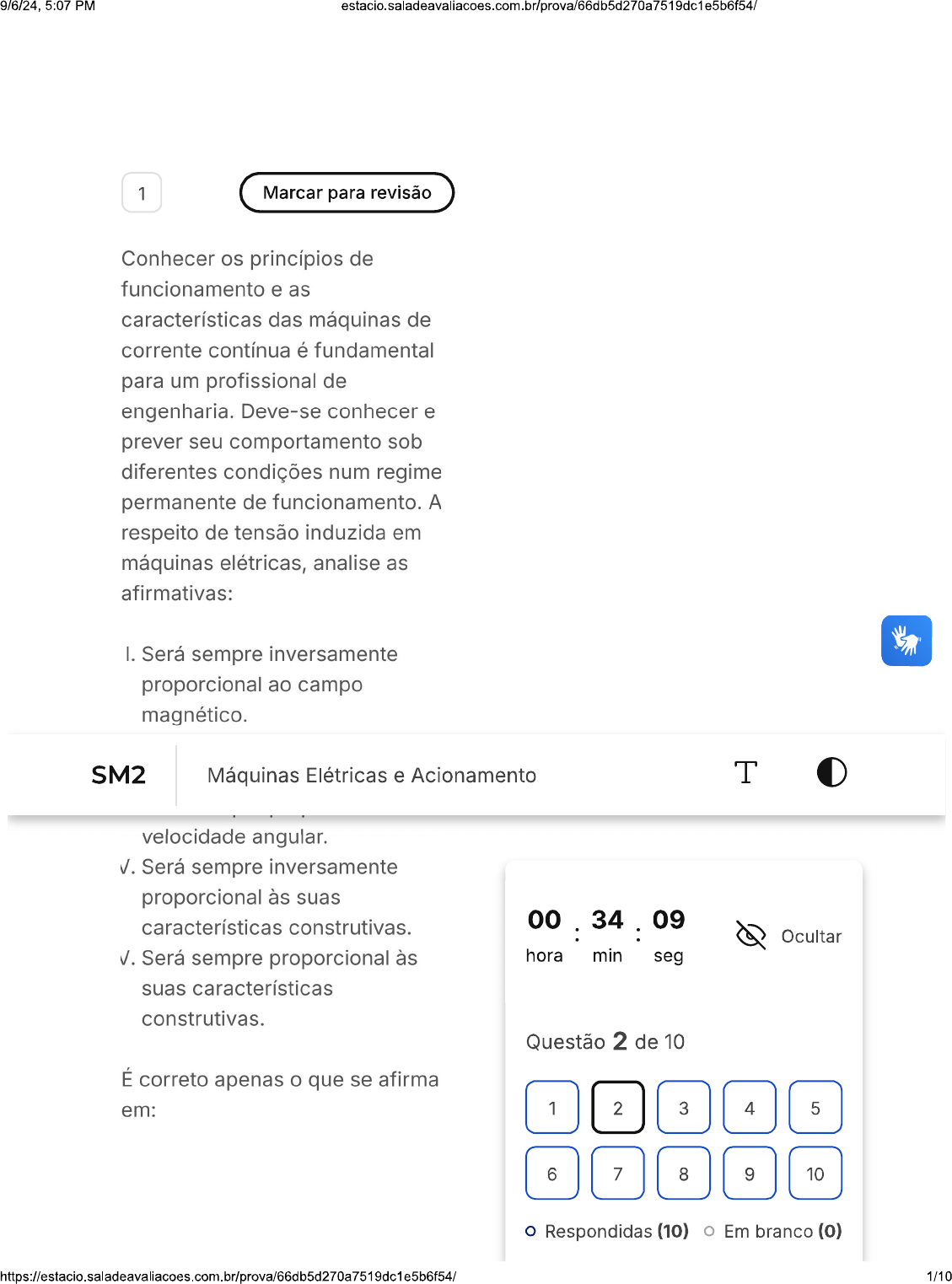 <p>9/6/24, 5:07 PM estacio.saladeavaliacoes.com.br/prova/66db5d270a7519dc1e5b6f54/ 1 Marcar para revisão Conhecer os princípios de funcionamento e as características das máquinas de corrente contínua é fundamental para um profissional de engenharia. Deve-se conhecer e prever seu comportamento sob diferentes condições num regime permanente de funcionamento. A respeito de tensão induzida em máquinas elétricas, analise as afirmativas: I. Será sempre inversamente proporcional ao campo magnético. SM2 Máquinas Elétricas e Acionamento T velocidade angular. V. Será sempre inversamente proporcional às suas características construtivas. 00 34 . 09 Ocultar V. Será sempre proporcional às hora min seg suas características construtivas. Questão 2 de 10 É correto apenas o que se afirma em: 1 2 3 4 5 6 7 8 9 10 Respondidas (10) Em branco (0) 1/10</p><p>9/6/24, 5:07 PM A Apenas I. Finalizar prova B I, e III. C IV e V. D I e II. E II, III e V. 2 Marcar para revisão Conhecer os princípios de funcionamento e as características das máquinas de corrente contínua é fundamental para um profissional de engenharia. Deve-se conhecer e prever seu comportamento sob diferentes condições num regime permanente de funcionamento. Considere a máquina parada, nesse momento, alimenta-se o circuito de campo, criando-se o fluxo. Em seguida, alimenta-se o motor com tensão terminal constante. Analise as afirmativas abaixo: I. A tensão induzida no rotor será zero, no momento da partida, 2/10</p><p>9/6/24, 5:07 PM considerando que não há magnetismo residual. II. Nos condutores aparecerá uma força induzida, que é dependente do raio do eixo. II. sistema entrará em equilíbrio, quando o torque elétrico induzido for igual à soma do torque mecânico e do torque de perdas da máquina. É correto apenas o que se afirma em: A I e III. B e II. C Apenas II. D I, e III. E Apenas I. 3 Marcar para revisão Conhecer os princípios de funcionamento e as características das máquinas de corrente contínua é fundamental para um profissional de engenharia. Deve-se conhecer e 3/10</p><p>9/6/24, 5:07 PM prever seu comportamento sob diferentes condições num regime permanente de funcionamento. Num gerador, o ângulo entre os vetores velocidade e campo magnético varia ao longo de uma rotação. Qual foi a solução para produzir tensão contínua ao longo de toda uma rotação? Utilizar faces polares A convexas. Utilizar faces apolares B convexas. Utilizar faces apolares C côncavas. Utilizar faces polares D côncavas. Utilizar faces planas E reflexivas. 4 Marcar para revisão Conhecer os princípios de funcionamento e as características das máquinas de corrente contínua é fundamental para um profissional de engenharia. Deve-se conhecer e prever seu comportamento sob 4/10</p><p>9/6/24, 5:07 PM estacio.saladeavaliacoes.com.br/prova/66db5d270a7519dc1e5b6f54/ diferentes condições num regime permanente de funcionamento. Num gerador composto, considerando que a corrente de carga aumenta, então, pode-se esperar que: A corrente de armadura A diminui. A corrente de armadura B aumentará. Diminuição da tensão C induzida no gerador. Redução da força D magnetomotriz do campo série. A queda de tensão na E resistência de armadura estabiliza. 5 Marcar para revisão Um transformador trifásico Y - A é construído a partir de um banco de transformadores monofásicos de 10 kV / 220 V, cuja impedância do ramo longitudinal, refletida para o lado de AT é 24 Sabendo que a carga conectada ao terminal de BT do 5/10</p><p>9/6/24, 5:07 PM transformador drena da rede uma corrente de 500 A, com fator de potência 0,8 (capacitivo), a tensão terminal do lado de AT, em kV, é aproximadamente: A 17,2 B 16,8 C 11,3 D 18,4 E 10,0 6 Marcar para revisão Um autotransformador é montado a partir de dois transformadores monofásicos de 220V / 5V. Sabendo que a tensão V1 = 220 V, V2 é igual a: A 205 V B 210 V 6/10</p><p>9/6/24, 5:07 PM C 195 V D 215 V E 200 V 7 Marcar para revisão Um transformador trifásico Y - A é construído a partir de um banco de transformadores monofásicos de 10 kV / 220 V, cuja impedância do ramo longitudinal, refletida para o lado de AT é Sabendo que a carga conectada ao terminal de BT do transformador drena da rede uma corrente de 500 A, com fator de potência 0,8 (capacitivo), a tensão terminal do lado de AT, em kV, é aproximadamente: A 10,0 B 18,4 C 17,2 7/10</p><p>9/6/24, 5:07 PM D 11,3 E 16,8 8 Marcar para revisão Considere o circuito da figura a seguir, utilizado para comandar um relé e um contato auxiliar. O comando em destaque representa um: L RT C1 Fonte:-próprio-autor A Contato elétrico Contato normalmente B fechado C Contato térmico 8/10</p><p>9/6/24, 5:07 PM Contato normalmente D aberto E Contato digital 9 Marcar para revisão Em um fusível, quanto maior for o comprimento do fio do metal utilizado em seu interior, maior será a sua: A Resistência elétrica B Área C Condutividade D Tolerância E Capacidade de proteção 10 Marcar para revisão Os dispositivos de proteção capazes de resguardarem a integridade física de 9/10</p><p>9/6/24, 5:07 PM equipamentos por meio da detecção da ausência de determinada fase de sua alimentação são os denominados: A Relés PTC B Relés de falta de fase C Disjuntores motores D Relés de tensão mínima E Relés bimetálicos 10/10</p>