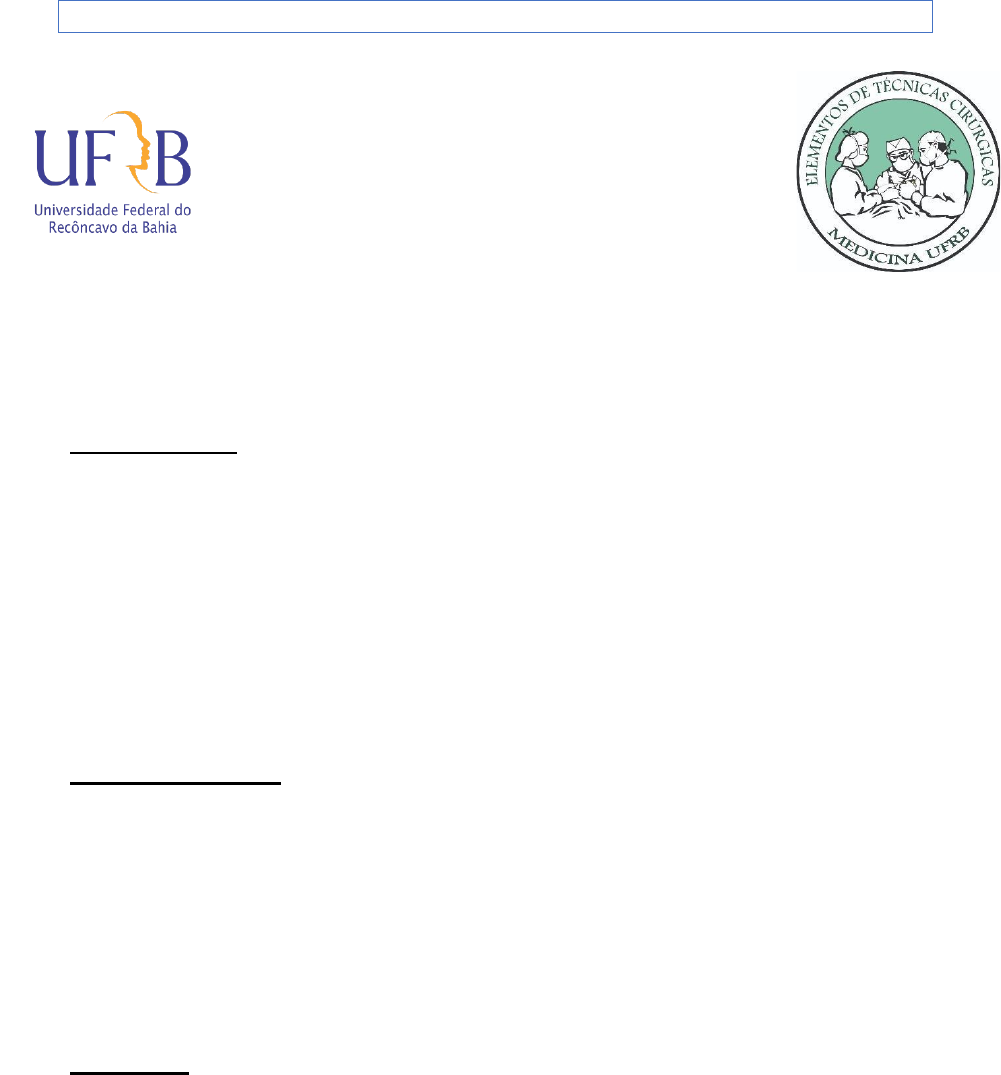 <p>1</p><p>UNIVERSIDADE FEDERAL DO RECÔNCAVO</p><p>DA BAHIA</p><p>CENTRO DE CIÊNCIAS DA SAÚDE</p><p>CURSO DE MEDICINA</p><p>MONITORIA DE ELEMENTOS DE TÉCNICAS</p><p>CIRÚRGICAS</p><p>ROTEIRO DE AULA PRÁTICA</p><p>AULA 03 - SUTURA I</p><p>INTRODUÇÃO</p><p>Para a realização de uma sutura é necessário escolher a agulha, o fio e o tipo de</p><p>sutura que melhor se adeque ao corte e ao tecido em questão, isso significa que cada</p><p>sutura deve ser pensada e planejada individualmente. A escolha adequada do fio de sutura</p><p>interfere no ato cirúrgico e no pós-operatório, especialmente na cicatrização das feridas</p><p>cirúrgicas.</p><p>PORTA-AGULHAS</p><p>São instrumentos especiais usados para prender as agulhas, facilitando a</p><p>introdução destas nos tecidos, durante a execução das suturas - principalmente em</p><p>cirurgias que o acesso é dificultado, como em cavidades. Os modelos mais utilizados são</p><p>os porta-agulhas de Mayo-Hegar e Mathieu.</p><p>AGULHAS</p><p>As agulhas cirúrgicas são utilizadas para transfixar os tecidos, funcionando como</p><p>guia para os fios durante a realização de suturas, com o mínimo trauma tecidual possível.</p><p>Cada segmento da agulha recebe uma nomenclatura específica: fundo (região em contato</p><p>com o fio), corpo e ponta; são classificadas quanto ao trauma que produzem em</p><p>traumáticas (ponta cortante, triangular ou prismática) e atraumáticas (ponta cilíndrica); e</p><p>quanto ao seu formato em circulares ou retas.</p><p>2</p><p>Figura 1: Fio agulhado e identificação de suas partes.</p><p>Figura 2: Tipos de agulha quanto ao trauma que produzem ao transfixar o tecido.</p><p>Figura 3: Agulhas cirúrgicas e seus ângulos: curva, semi-reta e reta.</p><p>Figura 4: Exemplos de agulhas quanto a sua curvatura e suas aplicações.1/4 de círculo:</p><p>oftalmologia e microcirurgia; 3/8 de círculo: profundidade e superficial ,1/2 de círculo:</p><p>áreas confinadas de difícil acesso – cavidades, 5/8 de círculo: urologia – facilidade de</p><p>resgate – cavidades profundas.</p><p>3</p><p>CARACTERÍSTICAS DA AGULHA IDEAL:</p><p>● Feita de aço inoxidável de alta qualidade;</p><p>● O mais fina possível, porém sem comprometer a força;</p><p>● Manter-se bem estabilizada no porta-agulha;</p><p>● Transfixar o tecido causando trauma mínimo;</p><p>● Ser bastante afiada;</p><p>● Maleável o suficiente para ser moldada;</p><p>● Resistente o suficiente para não quebrar durante a cirurgia;</p><p>● Baixo custo.</p><p>A escolha da agulha deve considerar fatores como a acessibilidade do tecido a ser</p><p>suturado, o tipo de tecido (composição histológica). Um ponto importante a se atentar é</p><p>que lesões na mucosa devem ser suturadas com agulhas cilíndricas e fios absorvíveis,</p><p>uma vez que agulhas cortantes podem lacerar o tecido que é delicado e friável.</p><p>QUANTO A ORIENTAÇÃO DA AGULHA E A EVERSÃO DA FERIDA</p><p>As bordas da ferida são melhores para trabalhar quando discretamente evertidas.</p><p>Isto pode ser conseguido pelo posicionamento da agulha, colocando-a na extremidade</p><p>distal do porta-agulha, na junção do terço medial com o distal, mergulhando no tecido em</p><p>um ângulo de 90º em relação ao plano da pele em seu ponto de entrada. Um ângulo similar</p><p>de saída deve completar a passagem da agulha. A eversão exagerada da ferida pode</p><p>proporcionar uma cicatriz pouco estética ou favorecer a separação das bordas das feridas</p><p>após a retirada dos pontos.</p><p>4</p><p>Figura 5: Posicionamento da agulha no porta-agulha e transfixação do tecido no ângulo</p><p>de 90º no seu ponto de entrada e um ângulo similar de saída.</p><p>FIOS DE SUTURA</p><p>Os fios de sutura cirúrgica são materiais utilizados para ligadura de vasos, na</p><p>contenção, fixação ou aproximação de tecidos, promovendo as suturas. Foram</p><p>desenvolvidos em função da necessidade de controlar hemorragias e favorecer a</p><p>cicatrização de ferimentos ou incisões cirúrgicas.</p><p>Existem quatro propriedades de importância comum a todos os fios: a intensidade</p><p>de resposta inflamatória nos tecidos, o comprometimento do material na presença de</p><p>infecção, durabilidade e facilidade de manuseio. Todos os fios de sutura causam algum</p><p>grau de resposta inflamatória no tecido ao qual foi implantado, parte pelo trauma de</p><p>inserção, e parte por suas propriedades físico-químicas identificadas pelo nosso</p><p>organismo como estranho.</p><p>Os fios são divididos inicialmente em dois grandes grupos: absorvíveis e não-</p><p>absorvíveis (ou inabsorvíveis). Os fios absorvíveis podem ser de origem animal</p><p>(exemplo: Categute simples e cromado) ou sintéticos e perdem gradualmente sua</p><p>resistência à tração, lembrando que os fios sintéticos são absorvidos por hidrólise e os</p><p>diferentes tipos de Categute por digestão enzimática ou fagocitose.</p><p>Os fios não-absorvíveis se mantêm no tecido onde foram implantados e também</p><p>são divididos por sua origem: animal (Seda), mineral (Aço), vegetal (Algodão ou Linho)</p><p>ou sintéticos (Poliamida, Poliéster, Polipropileno).</p><p>No que se refere a macroestrutura dos fios, costuma-se dividir em dois grupos:</p><p>multifilamentar ou monofilamentar (Poliglactina (multi), Poliglecaprone(mono) e</p><p>Polidioxanona(mono).</p><p>5</p><p>Figura 6: Ilustração da área de superfície, fio monofilamentar e multifilamentar.</p><p>A reação tecidual é mais intensa nos fios multifilamentados, tanto absorvíveis</p><p>quanto não-absorvíveis, por possuir uma área de superfície maior, promovida pelos vários</p><p>filamentos que se entrelaçam, o que pode favorecer a persistência de bactérias. Por outro</p><p>lado, os fios monofilamentares, com uma superfície de contato menor, levam à menor</p><p>reação inflamatória.</p><p>CLASSIFICAÇÃO DOS FIOS DE S