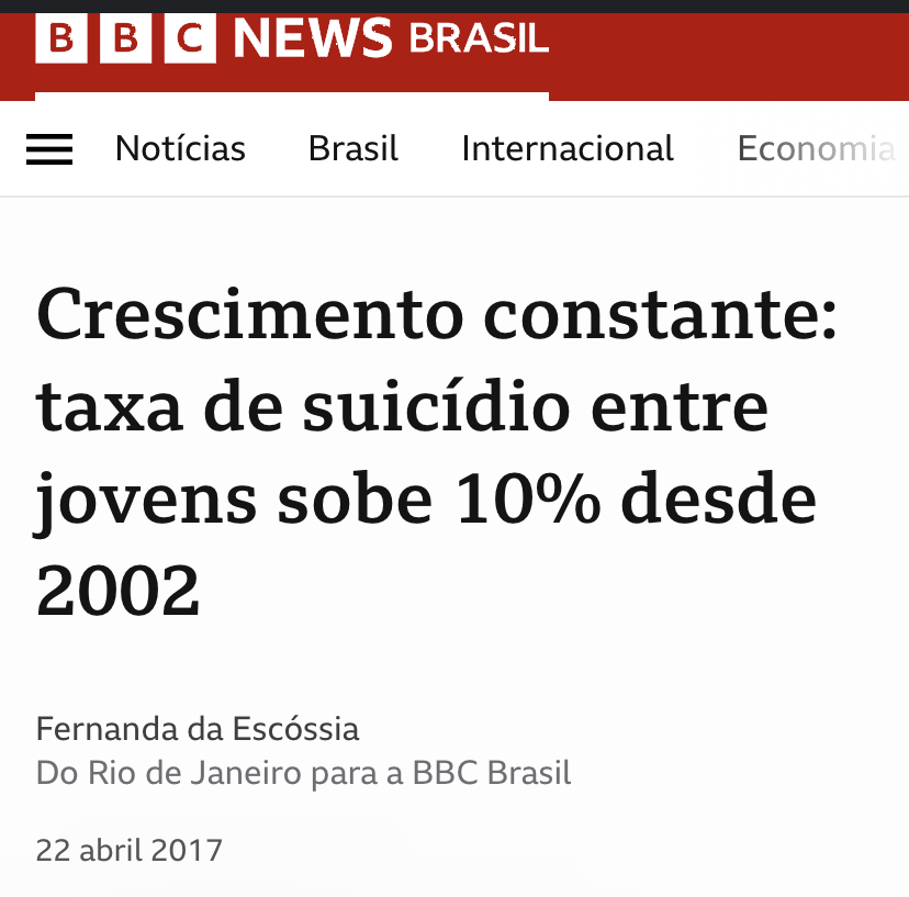 <p>B B NEWS BRASIL Notícias Brasil Internacional Economia Crescimento constante: taxa de suicídio entre jovens sobe 10% desde 2002 Fernanda da Escóssia Do Rio de Janeiro para a BBC Brasil 22 abril 2017</p>