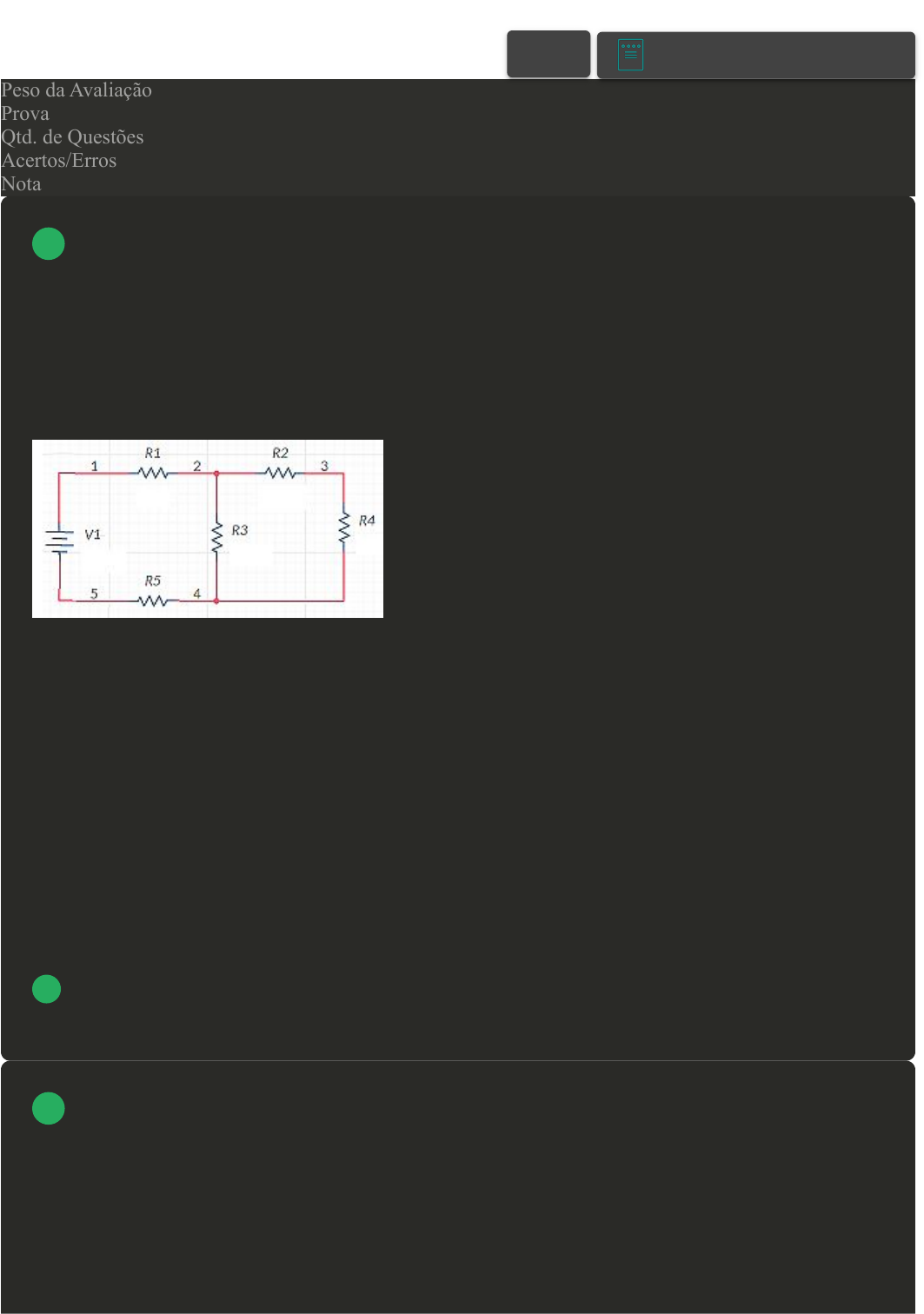 <p>17/06/23, 13:15 Avaliação II - Individual</p><p>about:blank 1/6</p><p>Prova Impressa</p><p>GABARITO | Avaliação II - Individual (Cod.:829169)</p><p>Peso da Avaliação 1,50</p><p>Prova 61124308</p><p>Qtd. de Questões 10</p><p>Acertos/Erros 9/1</p><p>Nota 9,00</p><p>[Laboratório Virtual - Análise Nodal e Análise de Malhas] Utilizando o circuito de referência</p><p>apresentado no Laboratório Virtual - Análise Nodal e Análise de Malhas, modifique o circuito,</p><p>conforme indicação, e faça a medição solicitada. O circuito apresentado na imagem representa o</p><p>circuito esquemático simulado.</p><p>Sobre a corrente total aproximada do circuito quando o resistor R1 é ajustado para 5k6 ohm e a</p><p>tensão de alimentação para 4,2 V, assinale a alternativa CORRETA:</p><p>A 450 mA</p><p>B 320 mA</p><p>C 270 mA</p><p>D 530 mA</p><p>[Laboratório Virtual - Análise de Circuitos, Divisores de Tensão e Divisores de Corrente] A figura</p><p>mostra o circuito utilizado na simulação do Laboratório Virtual - Análise de Circuitos, Divisores de</p><p>Tensão e Divisores de Corrente. O simulador permite que sejam mudados os valores de tensão</p><p>aplicada e resistência dos componentes.</p><p>VOLTAR</p><p>A+ Alterar modo de visualização</p><p>1</p><p>2</p><p>17/06/23, 13:15 Avaliação II - Individual</p><p>about:blank 2/6</p><p>Assinale a alternativa CORRETA que apresenta o valor aproximado da tensão nos componentes do</p><p>circuito, quando este é alimentado com uma tensão de 2,80 V, considerando os resistores R1 = 2E3</p><p>ohm; R2 = 1k2 ohm e R3 = 330 ohm:</p><p>A VR1 = 2,46 V; VR2 = 340 mV e VR3 = 0,34 V.</p><p>B VR1 = 1,37 V; VR2 = 0,43 V e VR3 = 430 mV.</p><p>C VR1 = 2,80 V; VR2 = 1,40 V e VR3 = 1,40 V.</p><p>D VR1 = 1,43 V; VR2 = 1,37 V e VR3 = 1,73 V.</p><p>Em 1883, Leon Charles Thévenin enunciou o seguinte teorema: "Qualquer estrutura linear ativa</p><p>pode ser substituída por uma única fonte de tensão Vth em série com uma resistência Rth". Surgia o</p><p>teorema de Thévenin para análise de circuitos elétricos em engenharia.</p><p>Com base nesse assunto, assinale a alternativa CORRETA:</p><p>A</p><p>Outros teoremas utilizados na análise de circuitos são: teorema de Norton, teorema da</p><p>superposição, análise nodal, princípio da linearidade e teorema da máxima transferência de</p><p>potência.</p><p>B Outros teoremas utilizados na análise de circuitos são: teorema de Norton, teorema da</p><p>superposição, análise de malhas, análise nodal e teorema da máxima transferência de potência.</p><p>C</p><p>Outros teoremas utilizados na análise de circuitos são: teorema de Norton, teorema da</p><p>superposição, análise de malhas, análise nodal, princípio da linearidade e teorema da máxima</p><p>transferência de potência.</p><p>D</p><p>Outros teoremas utilizados na análise de circuitos são: teorema de Norton, teorema da</p><p>superposição, análise de malhas, princípio da linearidade e teorema da máxima transferência de</p><p>potência.</p><p>A análise nodal se baseia em uma aplicação sistemática da lei de Kirchhoff para a corrente</p><p>(LKC), ou simplesmente, lei dos nós. A análise de malhas se baseia em uma aplicação sistemática da</p><p>lei de Kirchhoff para a tensão (LKT), ou simplesmente, lei das malhas. Com as duas técnicas, temos</p><p>condições de analisar qualquer circuito linear para a obtenção de um conjunto de equações</p><p>simultâneas cuja solução leva aos valores de corrente e tensão. Sobre esse assunto, analise as</p><p>sentenças a seguir:</p><p>I- Consideramos positivas as correntes elétricas que entram em um nó e negativas as correntes que</p><p>3</p><p>4</p><p>17/06/23, 13:15 Avaliação II - Individual</p><p>about:blank 3/6</p><p>saem do nó.</p><p>II- Cada nó presente no circuito produz uma equação, formando, assim, um sistema de equações.</p><p>III- Uma vez levantadas as equações das correntes de nó, utilizamos a lei das correntes de Kirchhoff,</p><p>e as equações das correntes nos resistores, utilizando a Lei de Ohm. Deve-se substituir nas equações</p><p>da Lei das Correntes de Kirchhoff as correntes obtidas pela Lei de Ohm. Com isso, obtemos as</p><p>equações, através do método da substituição, da eliminação ou do método das matrizes.</p><p>Assinale a alternativa CORRETA:</p><p>A As sentenças I, II e III estão corretas.</p><p>B Somente a sentença II está correta.</p><p>C Somente a sentença III está correta.</p><p>D Somente a sentença I está correta.</p><p>Quando falamos em associação de resistores em paralelo, podemos tomar como exemplo prático</p><p>as ligações da rede elétrica de nossas residências, pois todas as tomadas estão distribuídas de tal</p><p>forma que a tensão nela é de 220V ou 110V, dependendo da região do Brasil. Aparelhos, quando</p><p>ligados em quaisquer partes da residência, terão d.d.p. constante de 220 V ou de 110 V. Com base</p><p>nesse assunto, assinale a alternativa CORRETA:</p><p>A Dois resistores em paralelo têm o comportamento de um único resistor, em que a resistência</p><p>equivalente é igual ao produto das suas resistências dividido pela soma das resistências.</p><p>B Dois resistores em paralelo têm o comportamento de um único resistor, em que a resistência</p><p>equivalente é igual ao produto das suas resistências subtraído pela soma das resistências.</p><p>C Dois resistores em paralelo têm o comportamento de um único resistor, em que a resistência</p><p>equivalente é igual à soma das suas resistências dividido pela subtração das resistências.</p><p>D Dois resistores em paralelo têm o comportamento de um único resistor, em que a resistência</p><p>equivalente é igual ao produto das suas resistências multiplicado pela soma das resistências.</p><p>Seja uma rede linear ligada a uma carga por dois de seus terminais de forma que a única</p><p>interação entre rede e carga se dá 