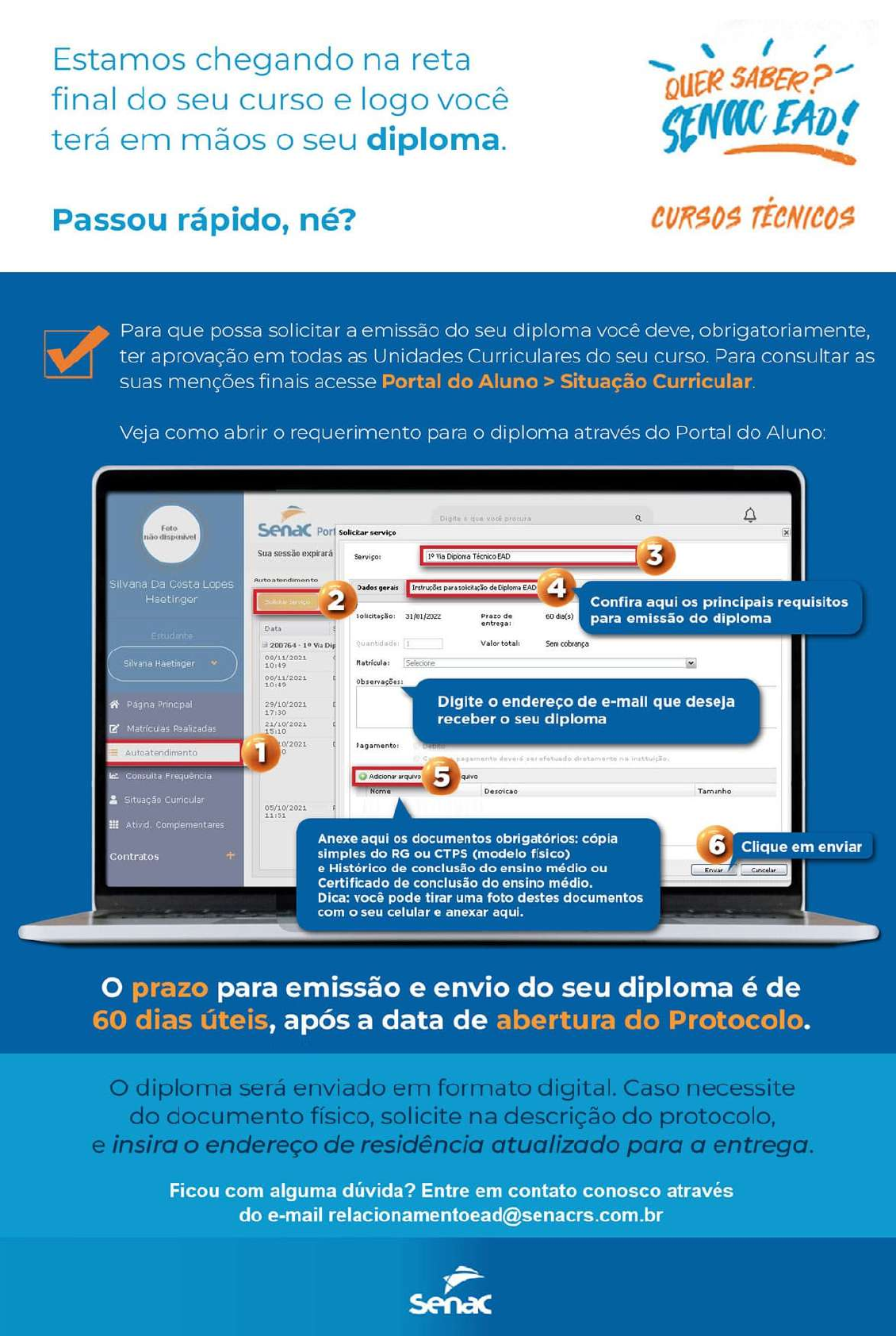 <p>Estamos chegando na reta QUER SABER? final do seu curso e logo você terá em mãos seu diploma. EAD Passou rápido, né? CURSOS Para que possa solicitar a emissão do seu diploma você deve, obrigatoriamente, ter aprovação em todas as Unidades Curriculares do seu curso. Para consultar as suas menções finais acesse Portal do Aluno > Situação Curricular. Veja como abrir O requerimento para O diploma através do Portal do Aluno: procura D Senac Port Solicitar serviço não disponível Sua sessão expirará Serviço: 10 Via Diploma Técnico EAD 3 Silvana Da Costa Lopes Dados gerais Instruções de Diploma 2 4 Haetinger Confira aqui os principais requisitos 31/01/2022 Prazo de 60 dia(s) entrega: para emissão do diploma Data Estudance 200764 Via Valor Sem cobrança 08/11/2021 Silvana Haetinger 10:49 Matrícula: Selecione 08/11/2021 10:49 Página Principal 29/10/2021 Digite endereço de e-mail que deseja 17:30 21/10/2021 receber seu diploma Matrículas Realizadas 15:10 10/2021 Pagamento: Consulta Frequência Adicionar arquivo 5 quivo Nome Tamanho Situação Curricular 05/10/2021 11:51 Complementares Anexe aqui os documentos obrigatórios: cópia 6 Clique em enviar Contratos simples do RG ou CTPS (modelo físico) e Histórico de conclusão do ensino médio ou Cancelar Certificado de conclusão do ensino médio. Dica: você pode tirar uma foto destes documentos com seu celular e anexar aqui. O prazo para emissão e envio do seu diploma é de 60 dias úteis, após a data de abertura do Protocolo. diploma será enviado em formato digital. Caso necessite do documento físico, solicite na descrição do protocolo, e insira o endereço de residência atualizado para a entrega. Ficou com alguma dúvida? Entre em contato conosco através do e-mail relacionamentoead@senacrs.com.br Senac</p>