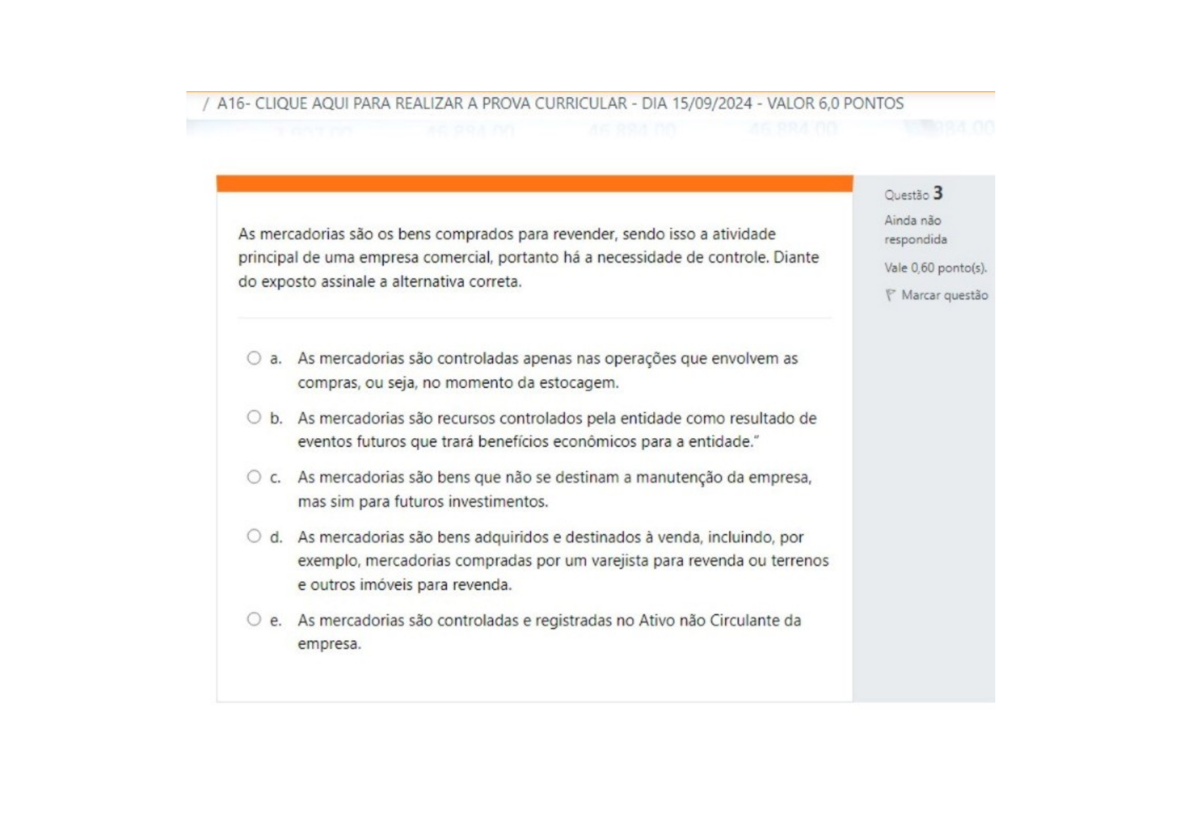 <p>/ A16- CLIQUE AQUI PARA REALIZAR A PROVA CURRICULAR - DIA 15/09/2024 - VALOR 6,0 PONTOS Questão 3 Ainda não As mercadorias são os bens comprados para revender, sendo isso a atividade respondida principal de uma empresa comercial, portanto há a necessidade de controle. Diante Vale 0,60 ponto(s). do exposto assinale a alternativa correta. Marcar questão a. As mercadorias são controladas apenas nas operações que envolvem as compras, ou seja, no momento da estocagem. b. As mercadorias são recursos controlados pela entidade como resultado de eventos futuros que trará benefícios econômicos para a entidade." C. As mercadorias são bens que não se destinam a manutenção da empresa, mas sim para futuros investimentos. d. As mercadorias são bens adquiridos e destinados à venda, incluindo, por exemplo, mercadorias compradas por um varejista para revenda ou terrenos e outros imóveis para revenda. e. As mercadorias são controladas e registradas no Ativo não Circulante da empresa.</p>