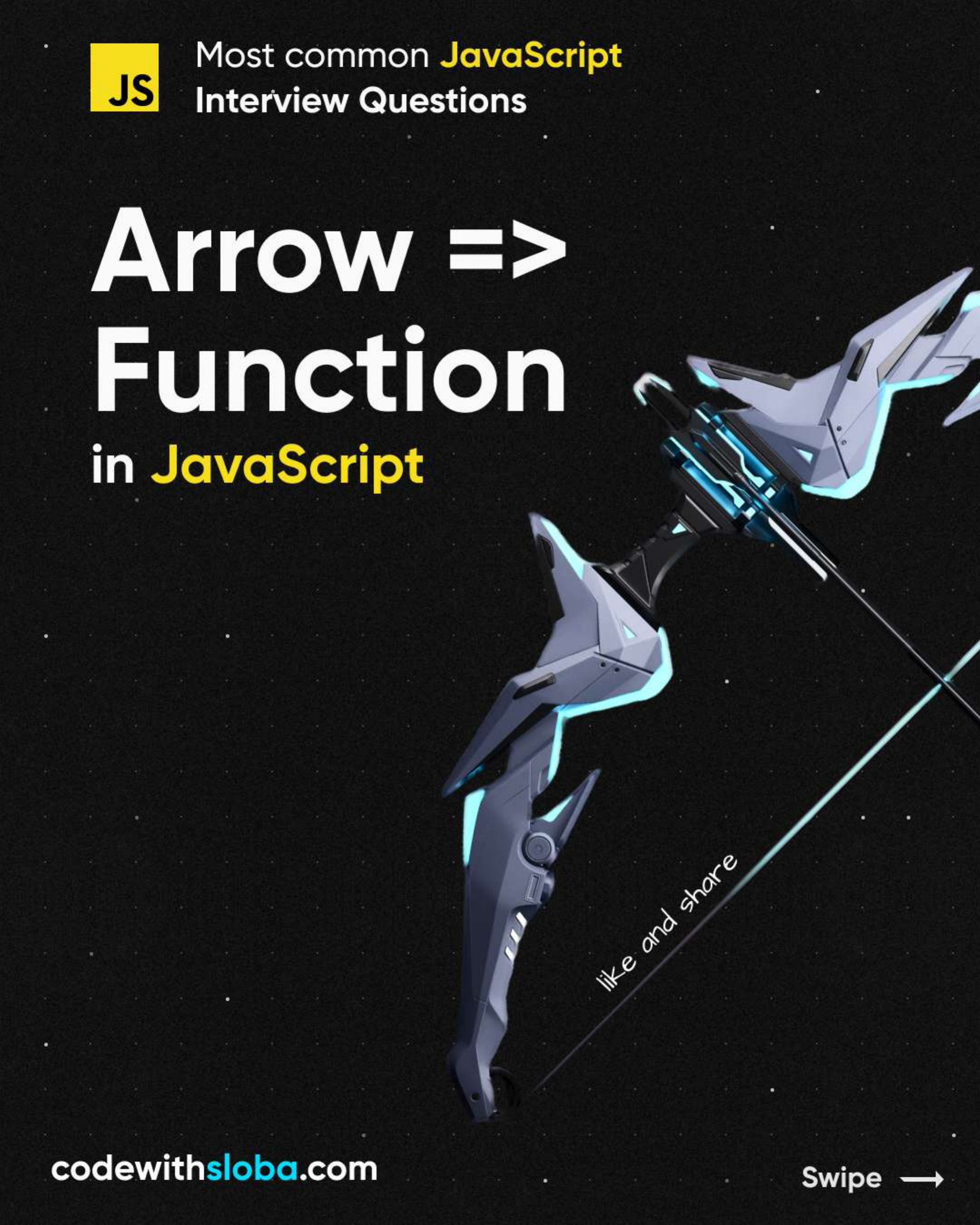 <p>JS Interview Most common JavaScript Questions Arrow => in JavaScript Function share codewithsloba.com Swipe</p><p>2/6 JS What are the advantages of an arrow function ? How does it differ from one declared with the function keyword? S Swipe</p><p>/6 JS Advantages of arrow functions: A more concise and compact syntax. () {} function() {}. Implicit return if the function is one line. You can leave out the function body and JavaScript will automatically return the value. const triple = (num) 3 * num; both do the job const triple = function (num) { return 3 * num; }</p><p>4/6 JS Important point A key benefit is how arrow functions handle this. Previously, using function bound the value of this was based on where the function was called. This forced developers to add hacky fixes to retain the original this value. On the other hand, an arrow function does not create its own this and instead uses the value from its enclosing scope. benefit Swipe</p><p>5/6 JS Extra points Arrow functions don't have access to the arguments object. Arrow functions don't change this from bind/call/apply since they don't define their own value for it Arrow functions can't be used as constructors functions with the new keyword. Swipe</p><p>in codewithsloba.com Get a weekly digest of my tips and tutorials by subscribing now. Code with > loba Educator Senior JavaScript Developer YouTuber</p>