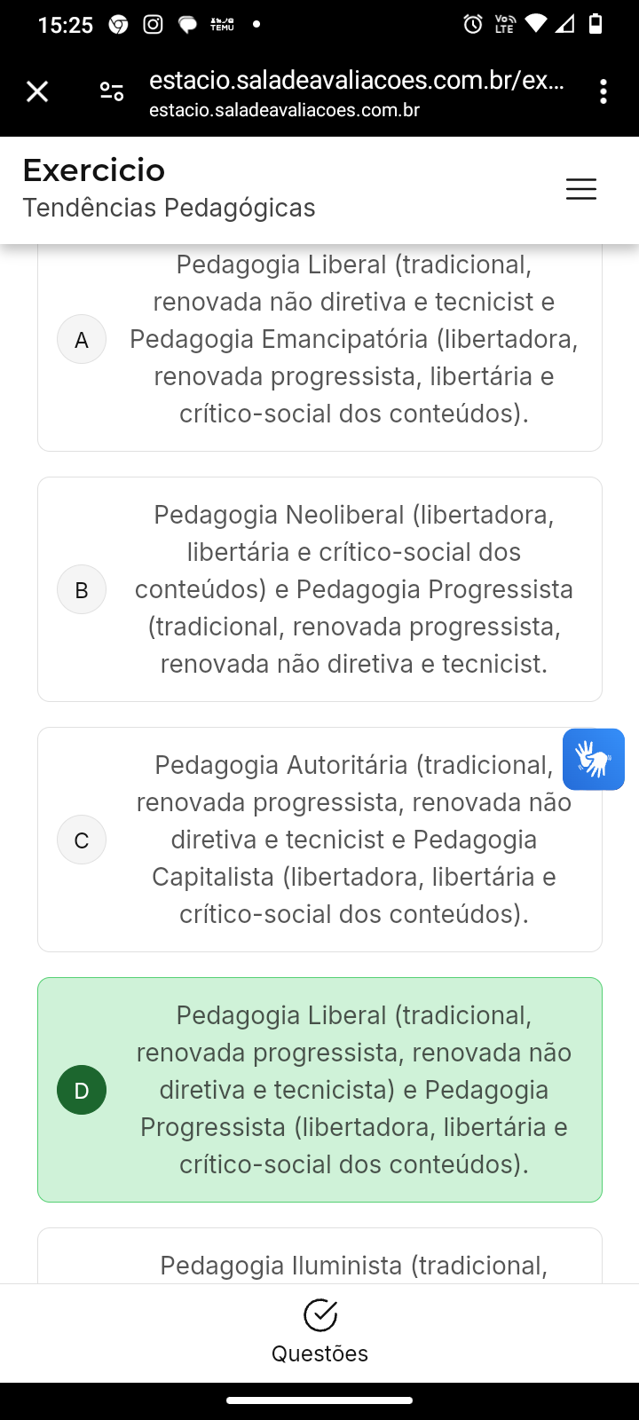 <p>15:25 O Vo TEMU LTE X estacio.saladeavaliacoes.com.br/ex. estacio.saladeavaliacoes.com.br Exercicio Tendências Pedagógicas Pedagogia Liberal (tradicional, renovada não diretiva e tecnicist e A Pedagogia Emancipatória (libertadora, renovada progressista, libertária e crítico-social dos conteúdos). Pedagogia Neoliberal (libertadora, libertária e crítico-social dos B conteúdos) e Pedagogia Progressista (tradicional, renovada progressista, renovada não diretiva e tecnicist. Pedagogia Autoritária (tradicional, renovada progressista, renovada não C diretiva e tecnicist e Pedagogia Capitalista (libertadora, libertária e crítico-social dos conteúdos). Pedagogia Liberal (tradicional, renovada progressista, renovada não D diretiva e tecnicista) e Pedagogia Progressista (libertadora, libertária e crítico-social dos conteúdos). Pedagogia Iluminista (tradicional, Questões</p>