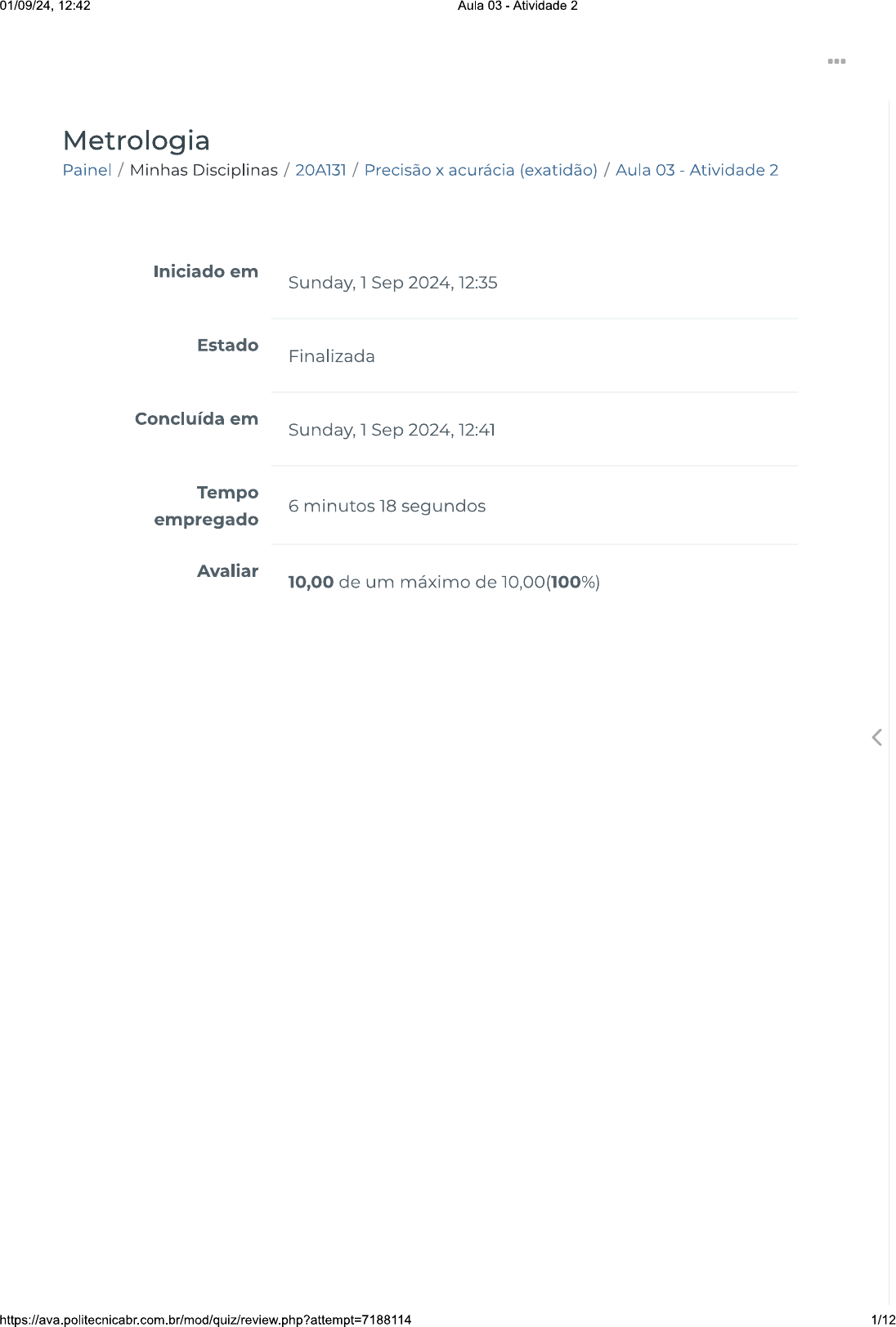 <p>01/09/24, 12:42 Aula 03 Atividade 2 Metrologia Painel / Minhas Disciplinas / 20A131 / Precisão X acurácia (exatidão) / Aula 03 - Atividade 2 Iniciado em Sunday, 1 Sep 2024, 12:35 Estado Finalizada Concluída em Sunday, 1 Sep 2024, 12:41 Tempo 6 minutos 18 segundos empregado Avaliar 10,00 de um máximo de 10,00(100%) < 1/12</p><p>01/09/24, 12:42 Aula 03 Atividade 2 Correto Atingiu 1,00 de 1,00 As grandezas físicas estão relacionadas a algo que pode ser medido ou mensurado de forma qualitativa ou quantitativa. Ao fervermos a água, ela entra em ebulição a 100 °C. Qual é a grandeza física envolvida neste caso? Escolha uma opção: a. Aceleração. b. Volume. C. Solidificação. d. Temperatura. e. Mudança de estado. < 2/12</p><p>01/09/24, 12:42 Aula 03 Atividade 2 Correto Atingiu 1,00 de 1,00 Um fazendeiro mediu uma área de sua propriedade para venda, que tinha 30 m. Sabendo que comprador compra a terra por , qual a dimensão dessa área em Escolha uma opção: a. 150. b. 1,5. C. 0,15. d. 0,015. e. 0,0015. < 3/12</p><p>01/09/24, 12:42 Aula 03 - Atividade 2 Correto Atingiu 1,00 de 1,00 João fez três medições em uma peça na fábrica. A primeira dimensão envolvia comprimento, a segunda envolvia a largura e a terceira a altura. De qual unidade estamos falando? Escolha uma opção: a. Massa. b. Volume. C. Área. d. Tempo. e. Comprimento. < 4/12</p><p>01/09/24, 12:42 Aula 03 Atividade 2 ⑉ Correto Atingiu 1,00 de 1,00 Na engenharia mecânica, há diversas medidas observadas, e muitas estão relacionadas à dimensão (tamanho), que pode ser relacionada à unidade de milímetros (mm). De quais medidas estamos falando? Escolha uma opção: a. Comprimento temperatura, altura, velocidade. b. Comprimento, diâmetro, altura, largura. C. Pressão, peso, comprimento, velocidade. d. Aceleração, temperatura, diâmetro, largura. e. Velocidade, tempo, aceleração, temperatura. < 5/12</p><p>01/09/24, 12:42 Aula 03 - Atividade 2 Correto Atingiu 1,00 de 1,00 Uma grandeza física qualitativa é aquela que apresenta uma forma ou aspecto homogêneo e não tem uma preocupação com quantidades. Qual dos itens citados abaixo é um grandeza física do tipo qualitativa? Escolha uma opção: a. Temperatura de ebulição da água. b. Bolinhas de gude. C. Lote de peças. d. Tempo em que ponteiro dá uma volta no relógio. e. Brigadeiro de festa de aniversário do tipo pequeno, médio e grande. < 6/12</p><p>01/09/24, 12:42 Aula 03 Atividade 2 ⑉ Correto Atingiu 1,00 de 1,00 A unidade de medição necessária para medir a distância entre uma cidade A e uma cidade B é a unidade de: Escolha uma opção: a. Área. b. Massa. C. Comprimento d. e. Tempo. < 7/12</p><p>01/09/24, 12:42 Aula 03 Atividade 2 Correto Atingiu 1,00 de 1,00 Quais os dois principais sistemas de medidas encontrados e adotados nos países? Escolha uma opção: a. Sistema técnico e sistema internacional de unidades. b. Sistema internacional de unidades e sistema chinês. C. Sistema internacional de unidades e sistema inglês. d. Sistema inglês e sistema chinês. e. Sistema técnico e sistema chinês. < 8/12</p><p>01/09/24, 12:42 Aula 03 Atividade 2 Correto Atingiu 1,00 de 1,00 Medidas são grandezas físicas que podem ser mensuradas. Qual a grandeza física relacionada a distância e tempo? Escolha uma opção: a. Partida. b. Velocidade. C. Frenagem. d. Desaceleração. e. Aceleração. < 9/12</p><p>01/09/24, 12:42 Aula 03 - Atividade 2 Correto Atingiu 1,00 de 1,00 Pedro precisa medir resíduo de uma reação, em que a água é expelida de uma reação na indústria. Ele tem uma caixa de dimensões 4m 3m 5 m, mas precisa informar a medida em litros. Em determinada operação, a caixa se encheu pela metade. Com base nesses dados, qual a quantidade de água, em litros, foi colhida? Escolha uma opção: a. 30.000. b. 15.000. C. 40.000. d. 25.000. e. 20.000. < 10/12</p><p>01/09/24, 12:42 Aula 03 Atividade 2 Correto Atingiu 1,00 de 1,00 Para processo de medição, há a necessidade de utilizar instrumentos para realizar medições. Normalmente, instrumento para medir a pressão de um reservatório de ar comprimido é O: Escolha uma opção: a. termômetro. b. régua. C. paquímetro. d. micrômetro. e. manômetro. < Entre em Contato Links Úteis https://www.politecnicabr.com.br Dicas da nossa Diretora Acadêmica 0800 084 2627 Planner de Estudos 0800 084 2627 Declaração de Matrícula Orientações do AVA Abertura de Ticket @ Fale com O Tutor Cronograma de Estudos Manual de Estágio Manual de Competência Siga-nos nas redes sociais 11/12</p>